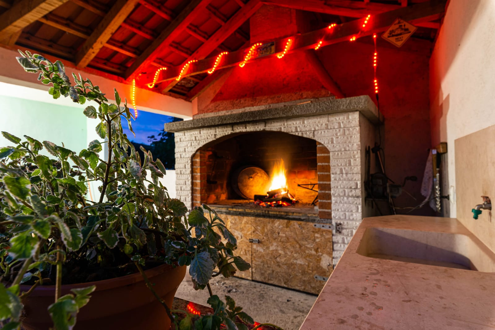 The spacious outdoor area is surrounded by greenery and features a private swimming pool with sun loungers, a cozy garden seating area, and an outdoor fireplace with a large barbecue and dining table – ideal for relaxed family dinners under the open sky. Bicycles are available for guests who wish to explore the surroundings and nearby nature.