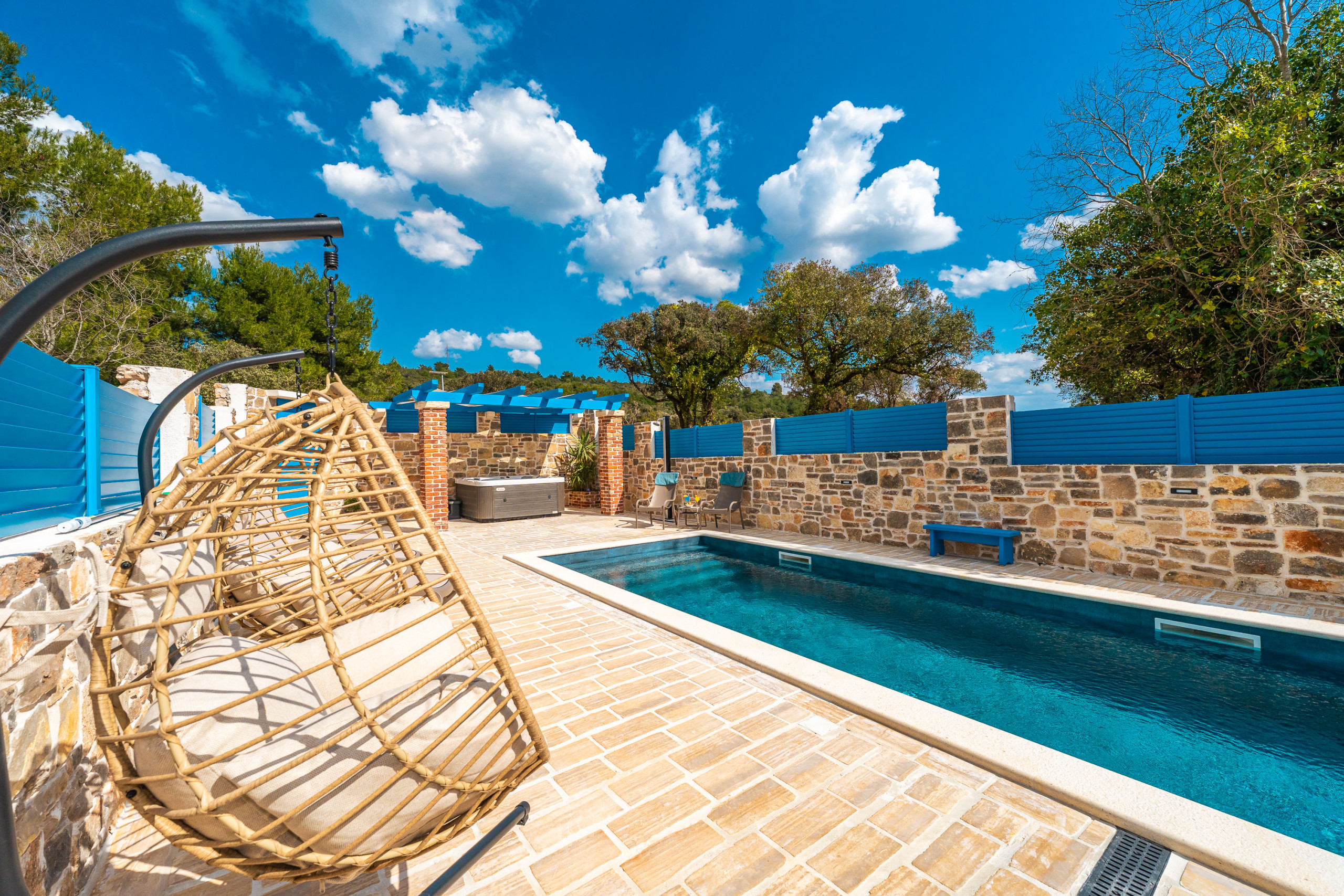 Experience the authentic Mediterranean lifestyle in this beautifully restored Dalmatian stone villa, located in Sukošan, just a short walk from the sea and offering a partial sea view. Combining traditional stone architecture with vibrant blue details and warm wooden elements, villa Zara radiates true coastal charm and timeless elegance.