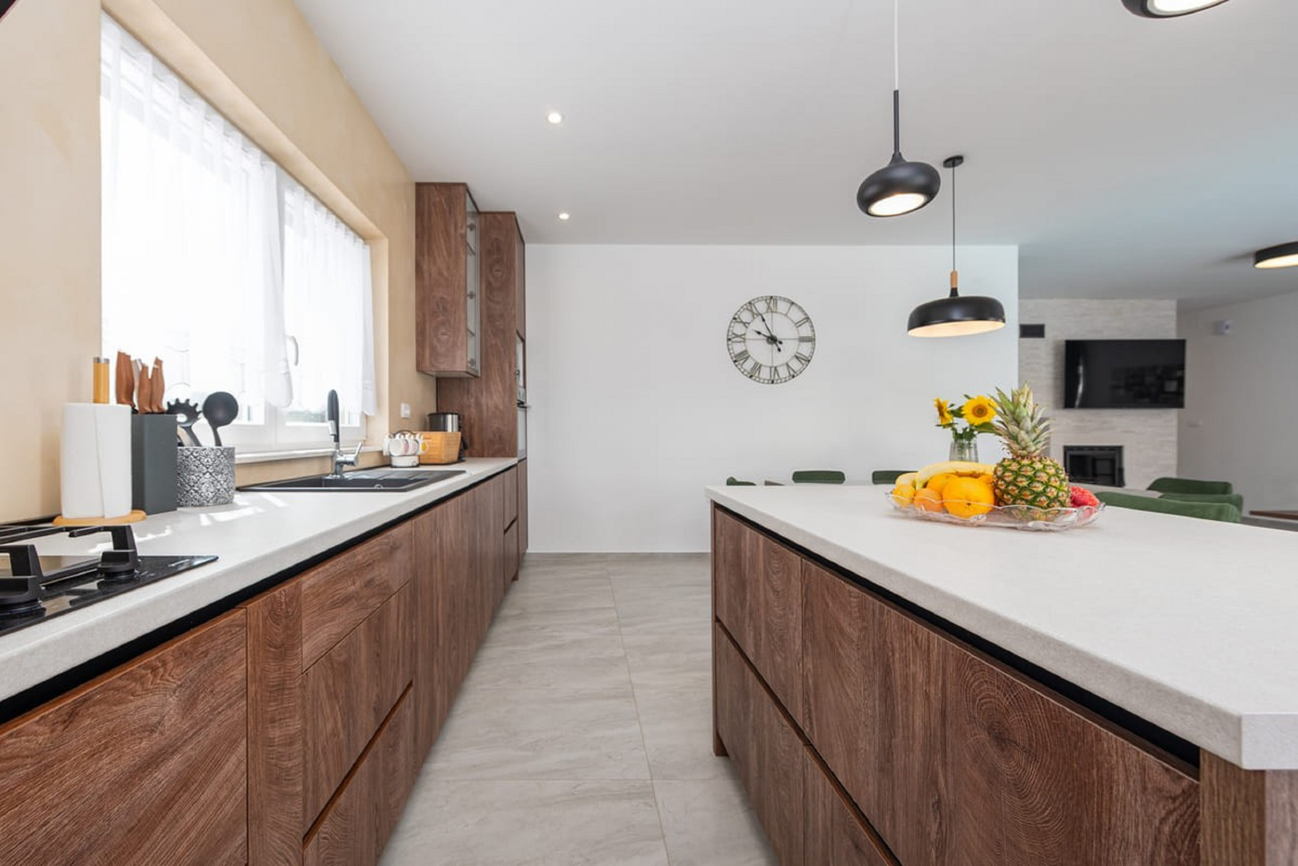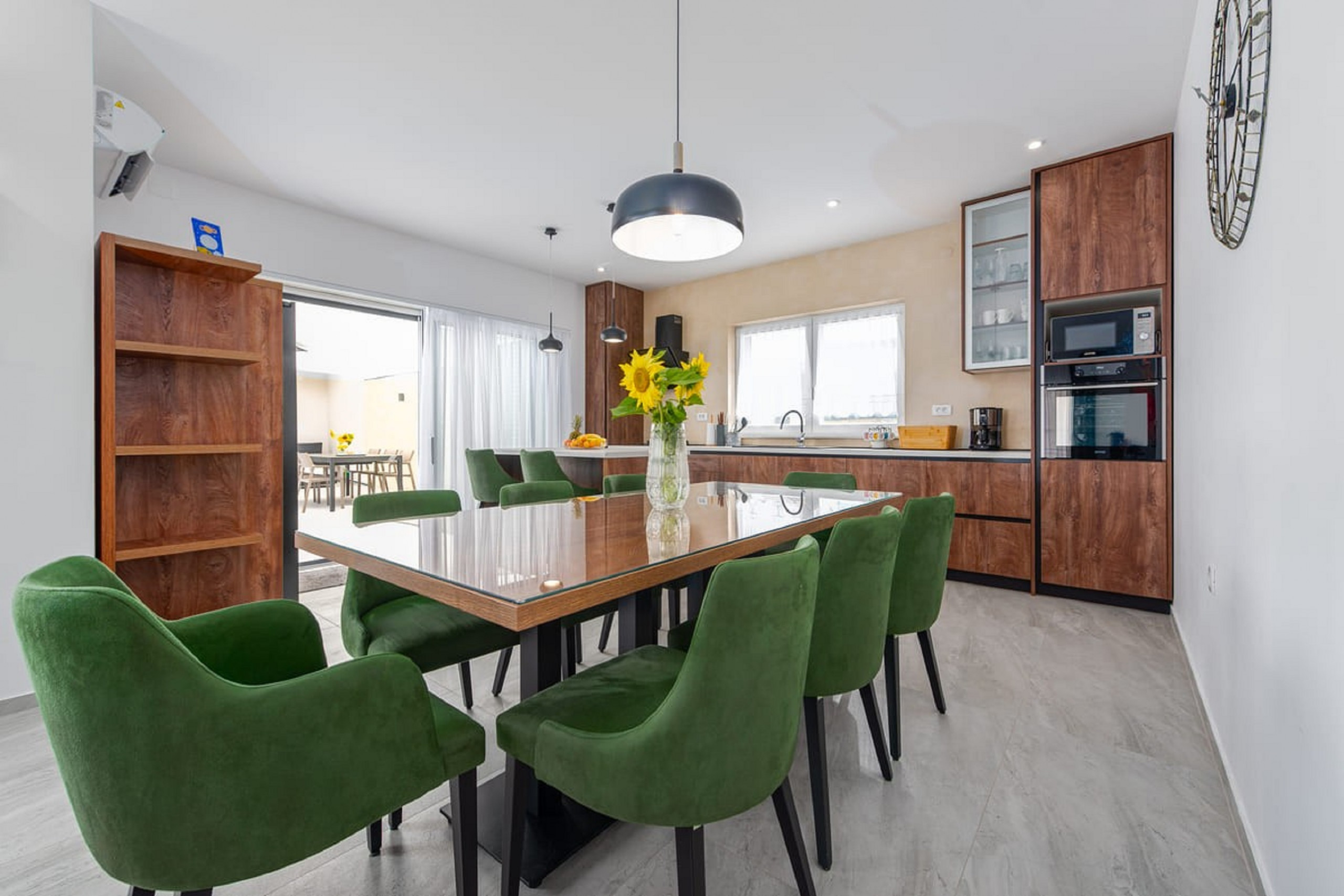 The entire Villa spreads on a high ground floor. It consists of a spacious open-concept living room with a fireplace, dining room and kitchen that have an exit to the covered terrace and pool area. The terrace features an outdoor dining and seating area and a gas barbecue. The pool is complimented with sunloungers and parasols, while overlooking the parking and garden equipped with a basketball basket and a trampoline for our youngest guests.