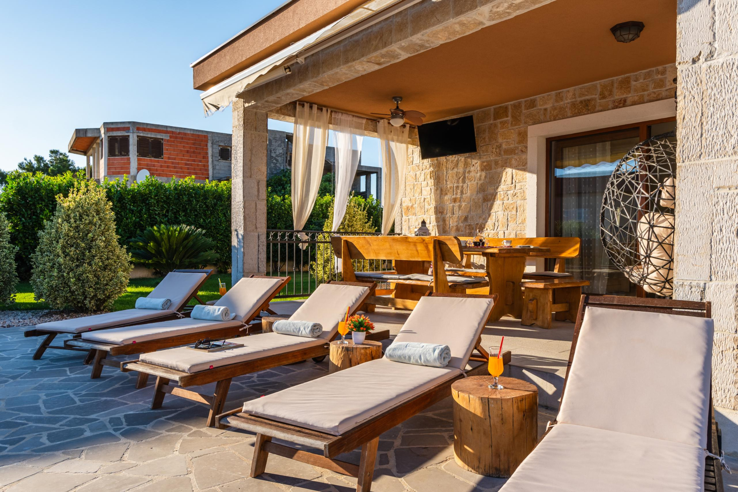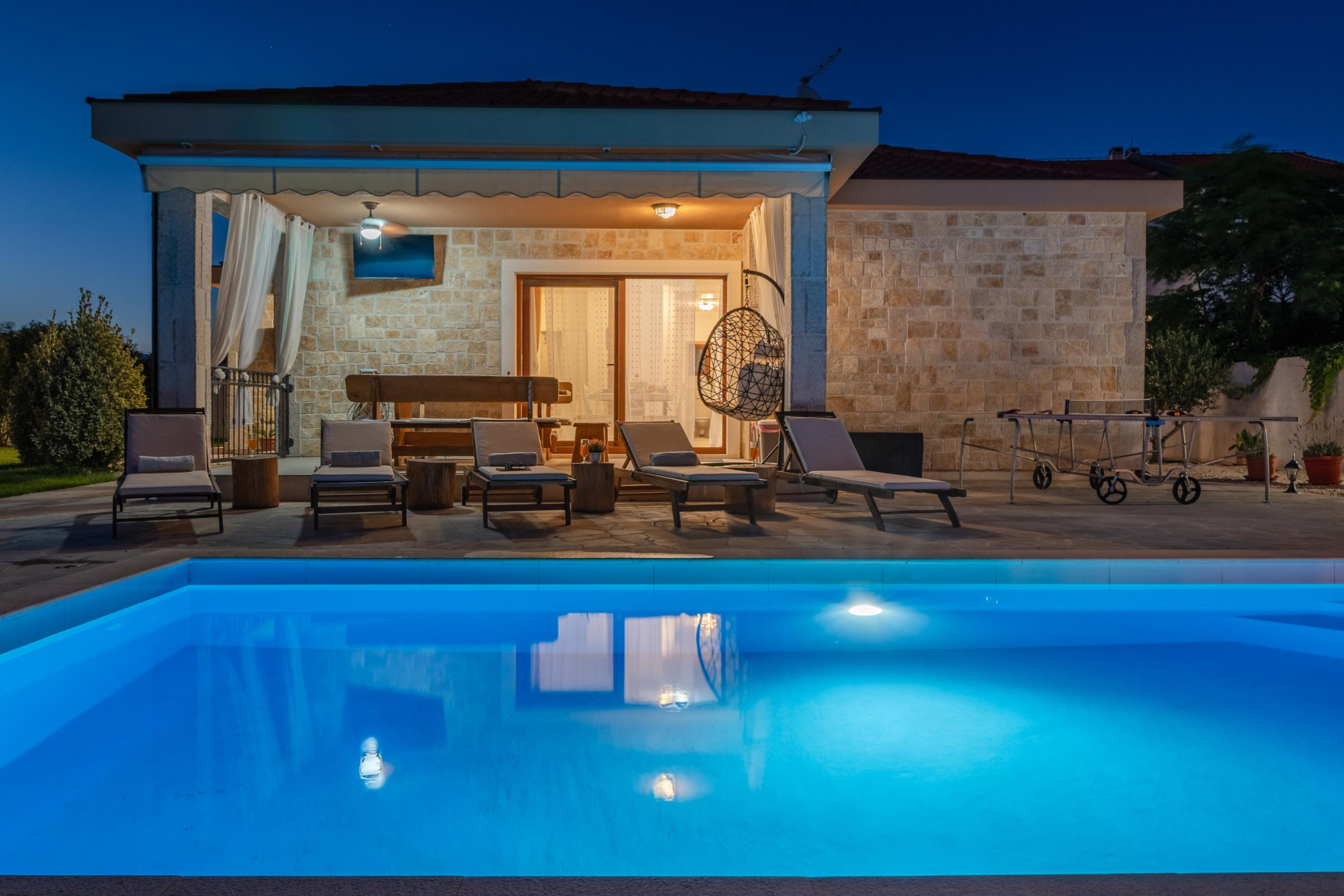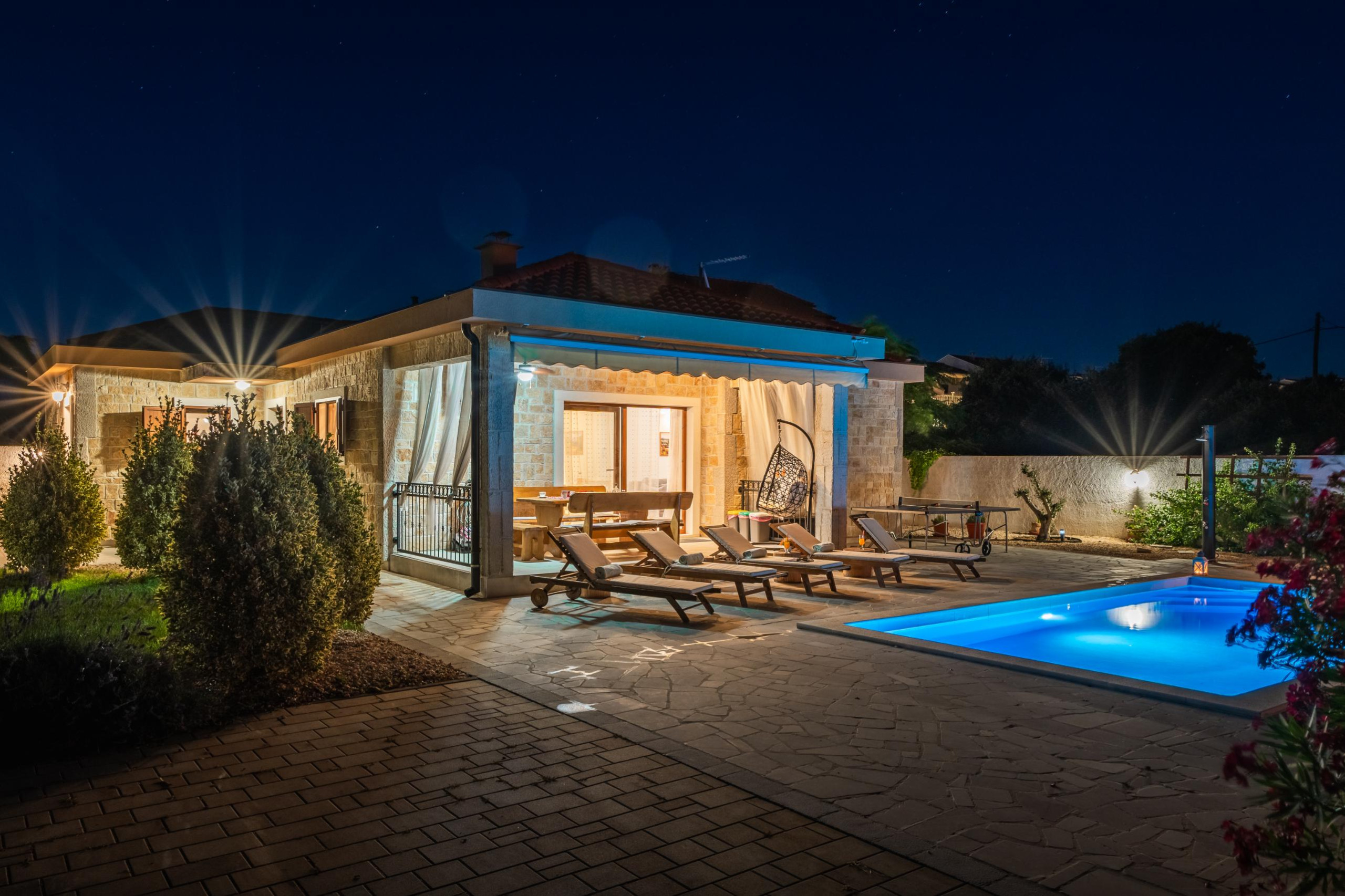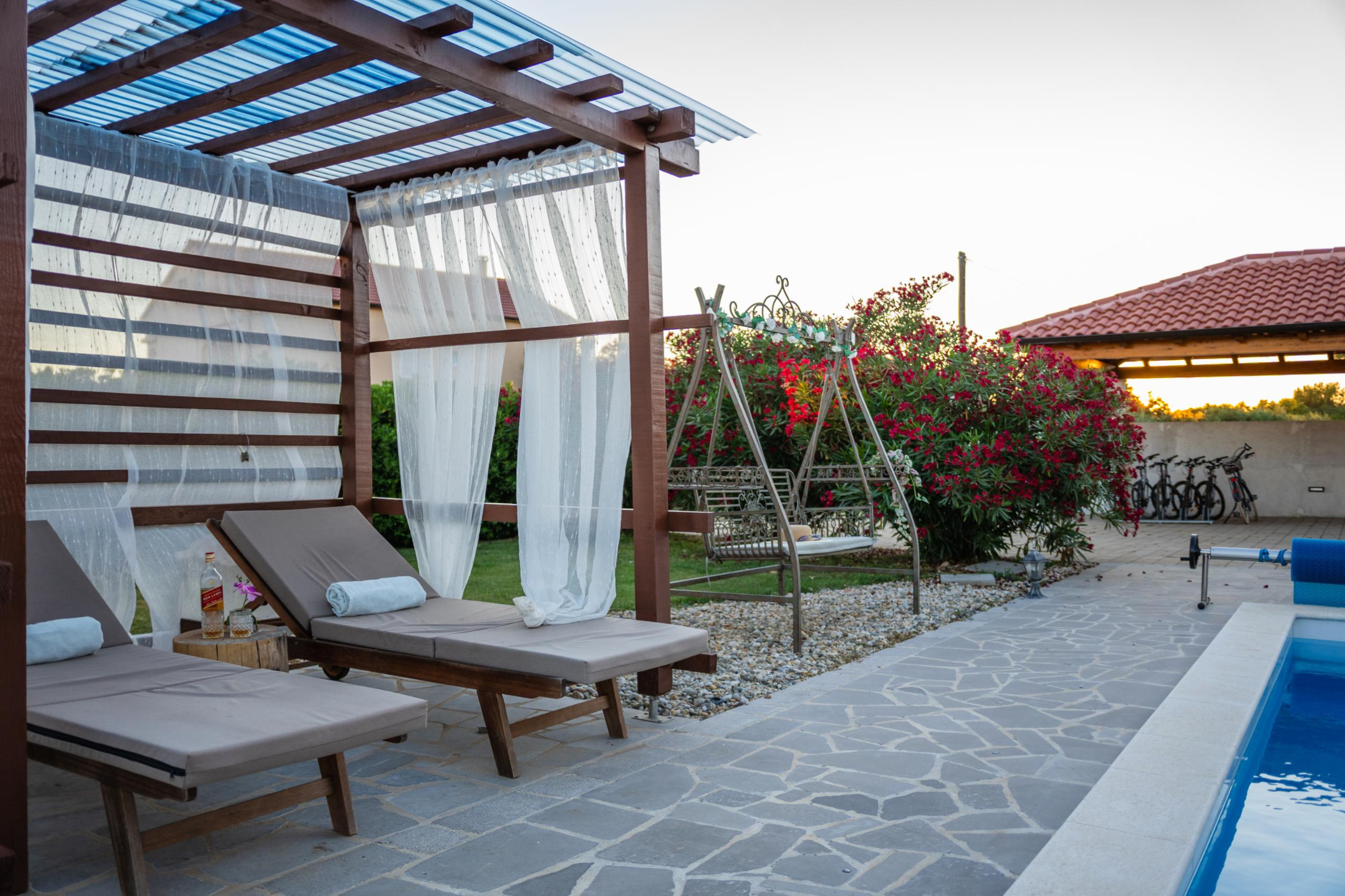 Holiday Home Beti spreads on a beautiful plot with lots of greenery and small botanical and decorative details, as well as many amenities such as a heated pool, covered terrace with a BBQ and dining area, pool table, jacuzzi, a children`s playground and many more.