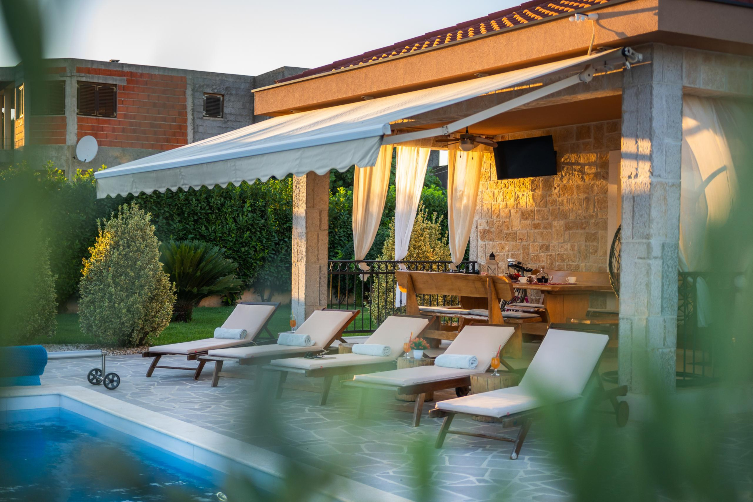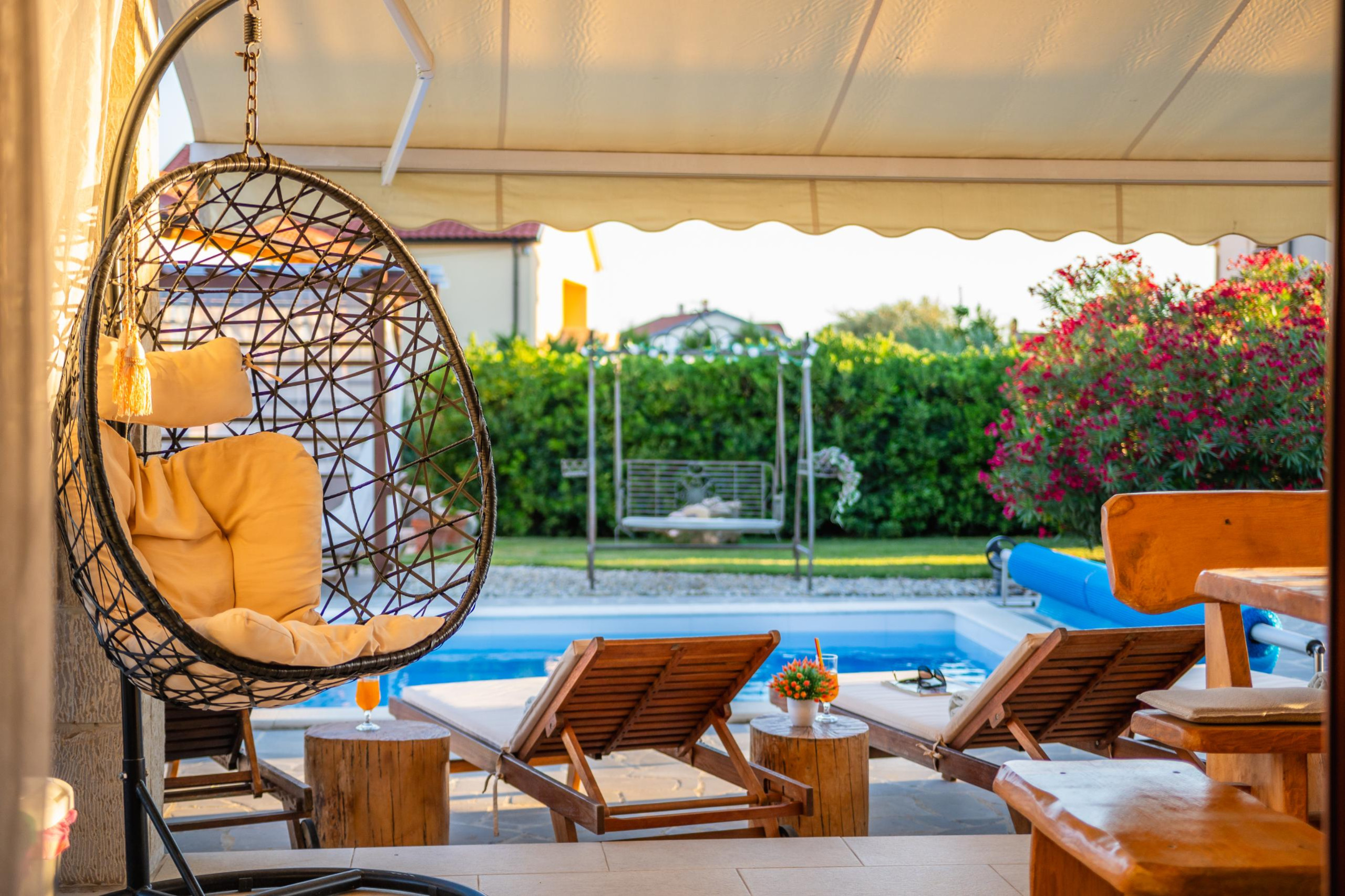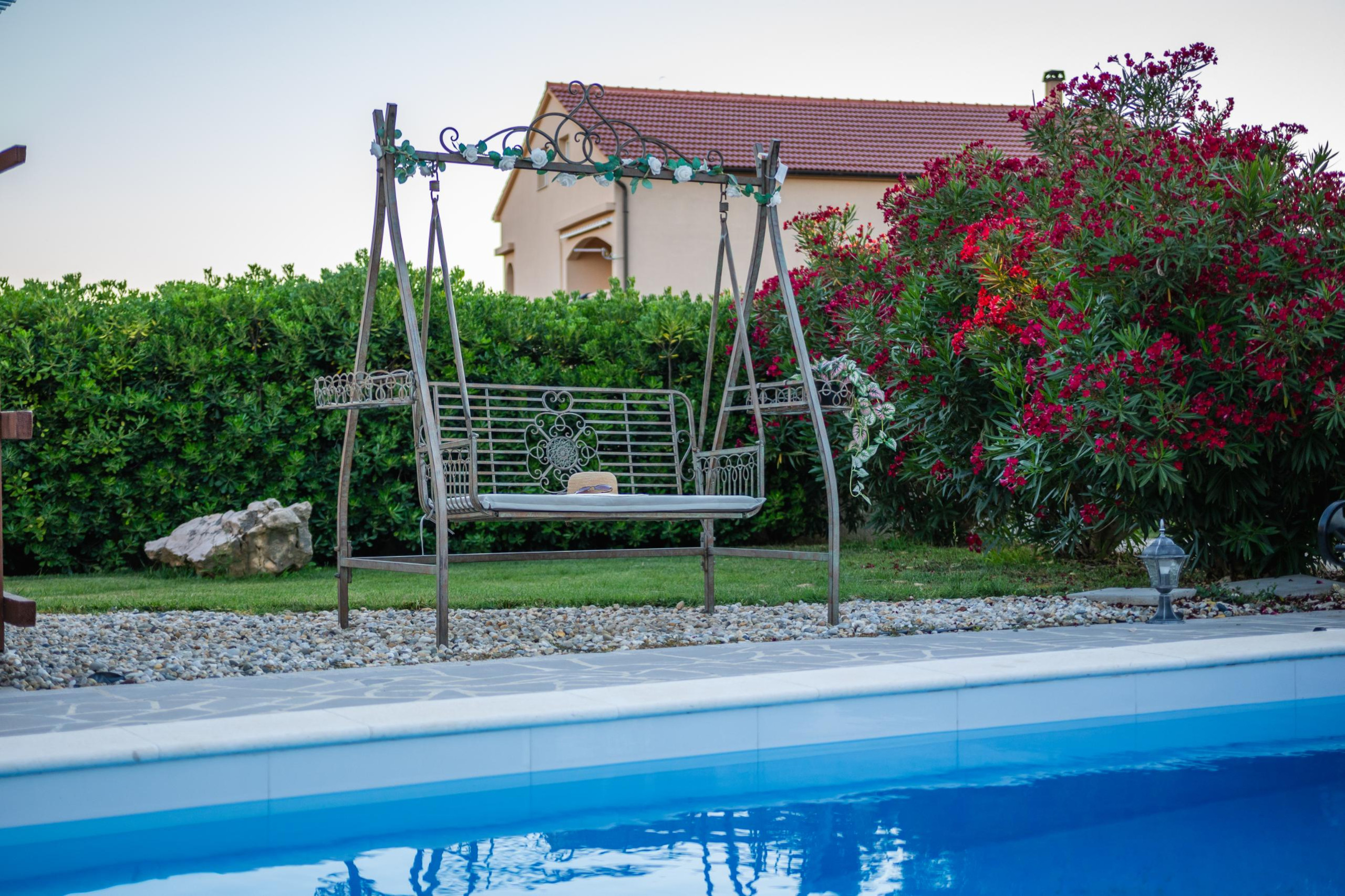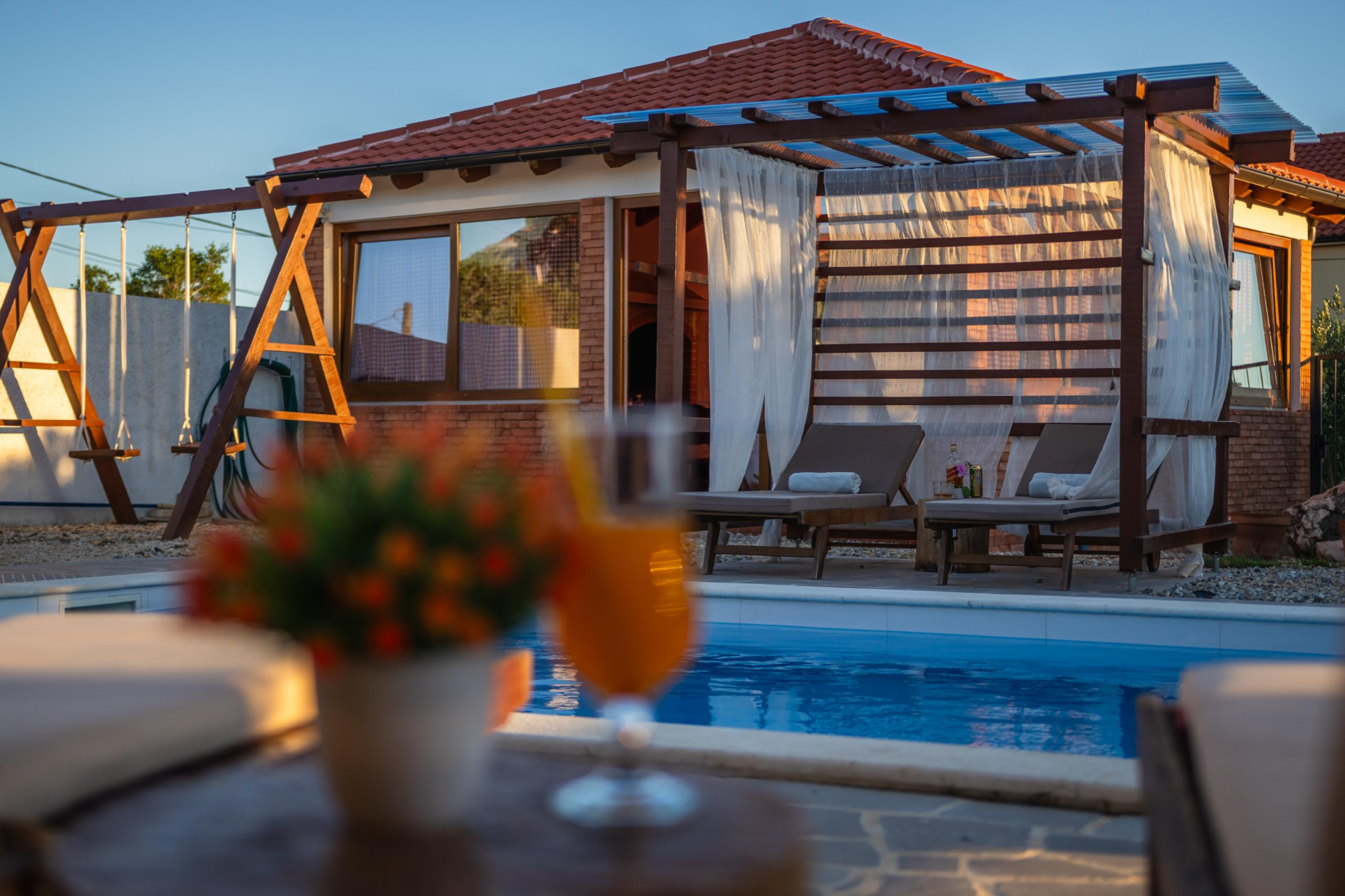 Holiday Home Beti spreads on a beautiful plot with lots of greenery and small botanical and decorative details, as well as many amenities such as a heated pool, covered terrace with a BBQ and dining area, pool table, jacuzzi, a children`s playground and many more.