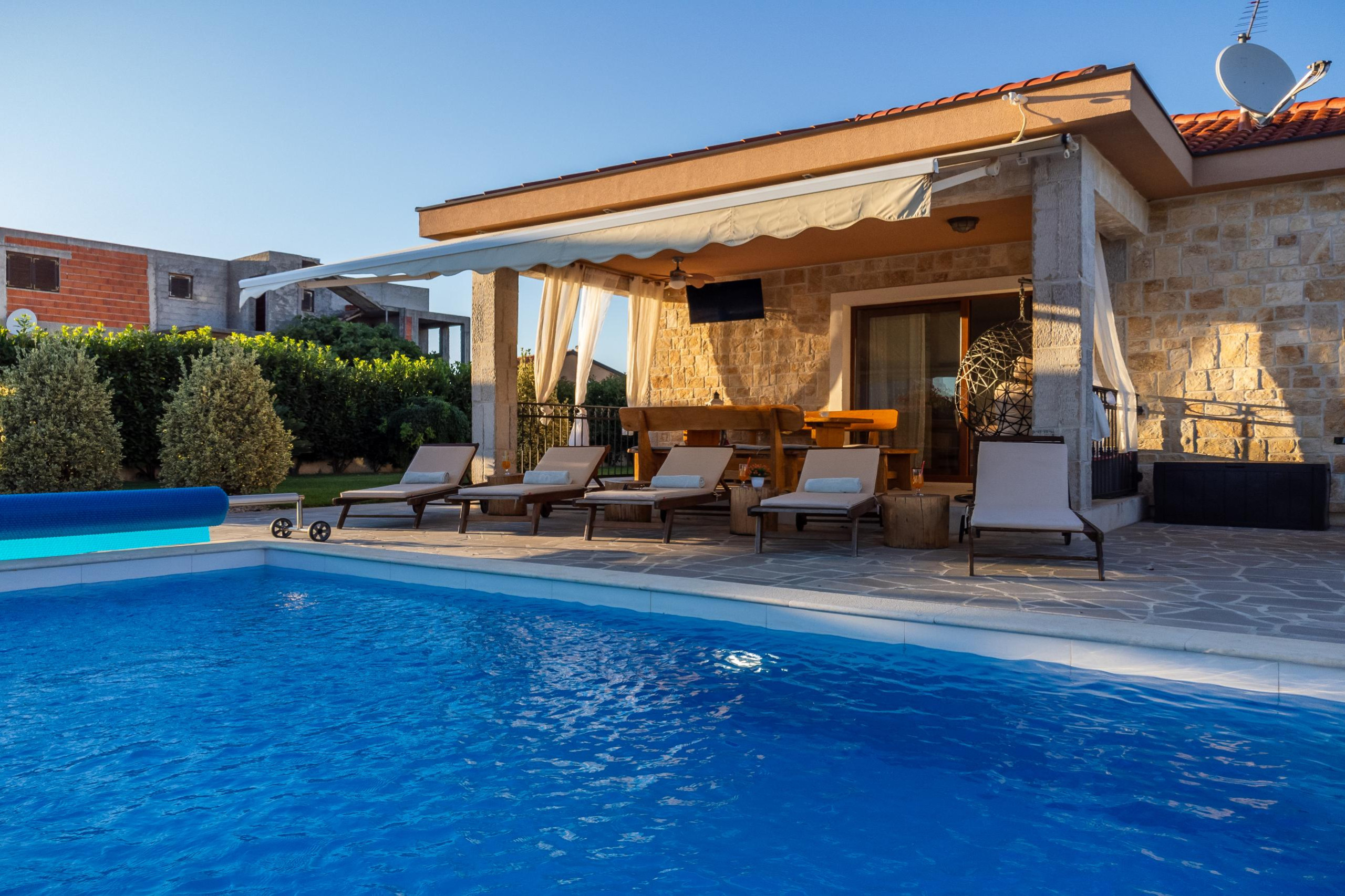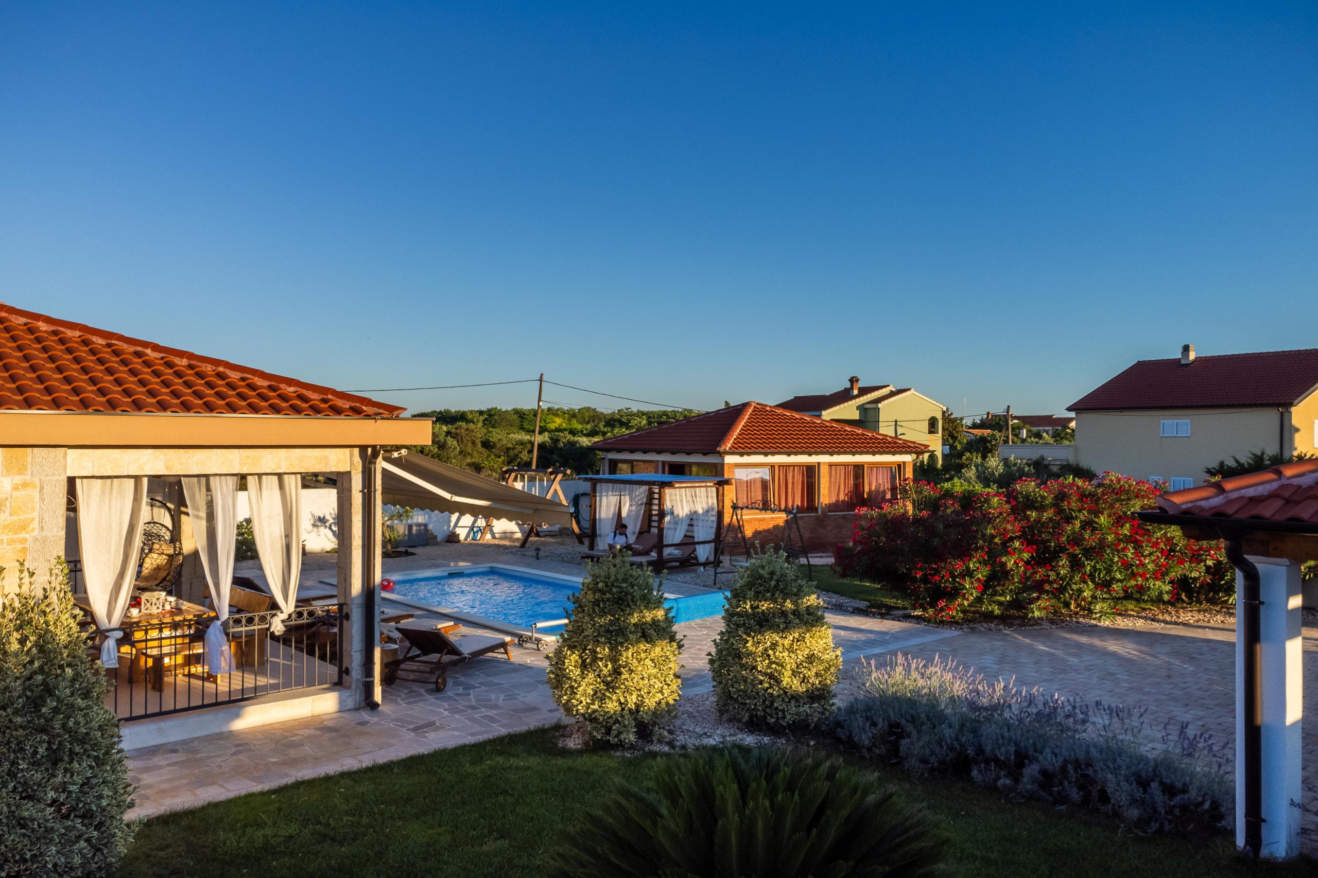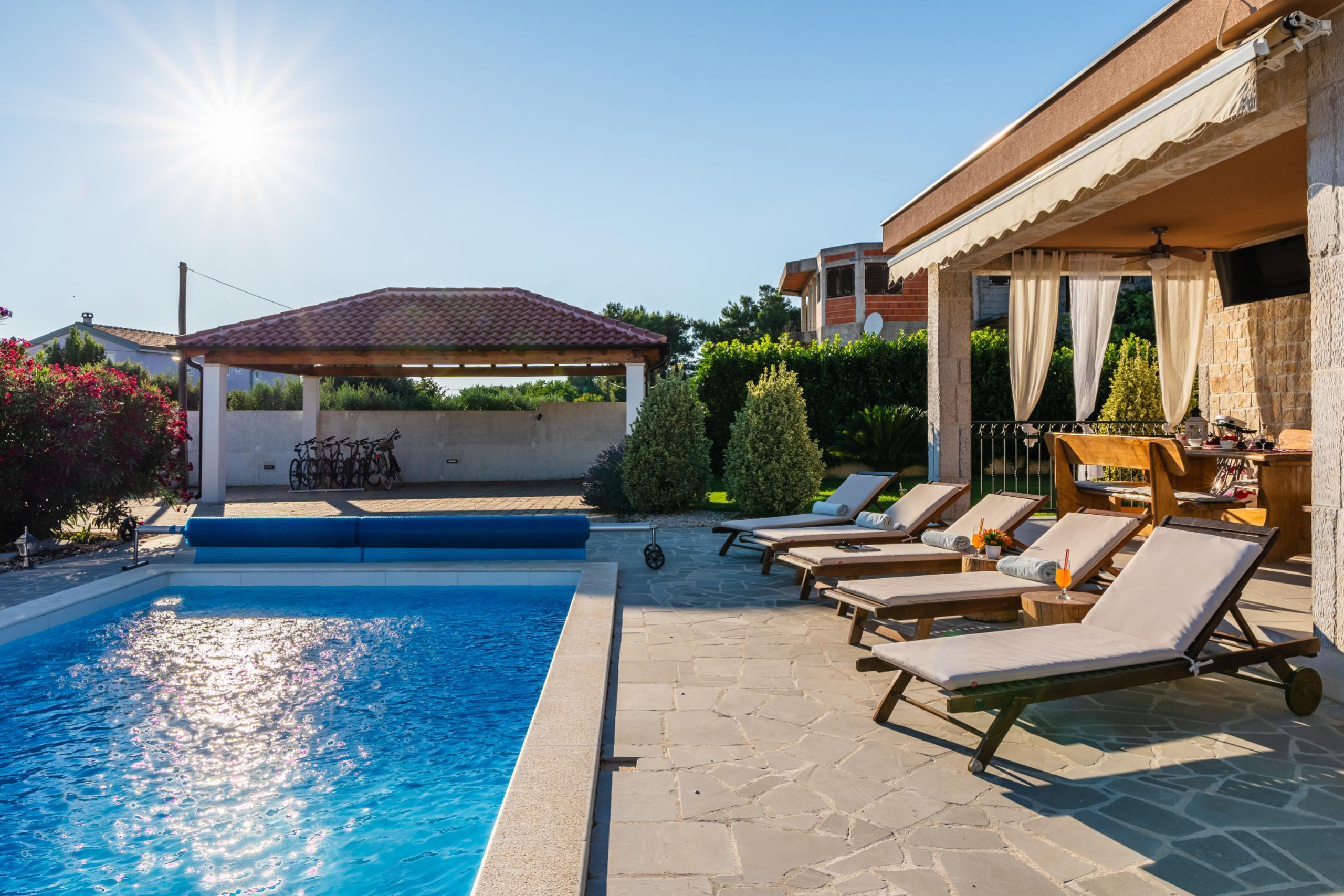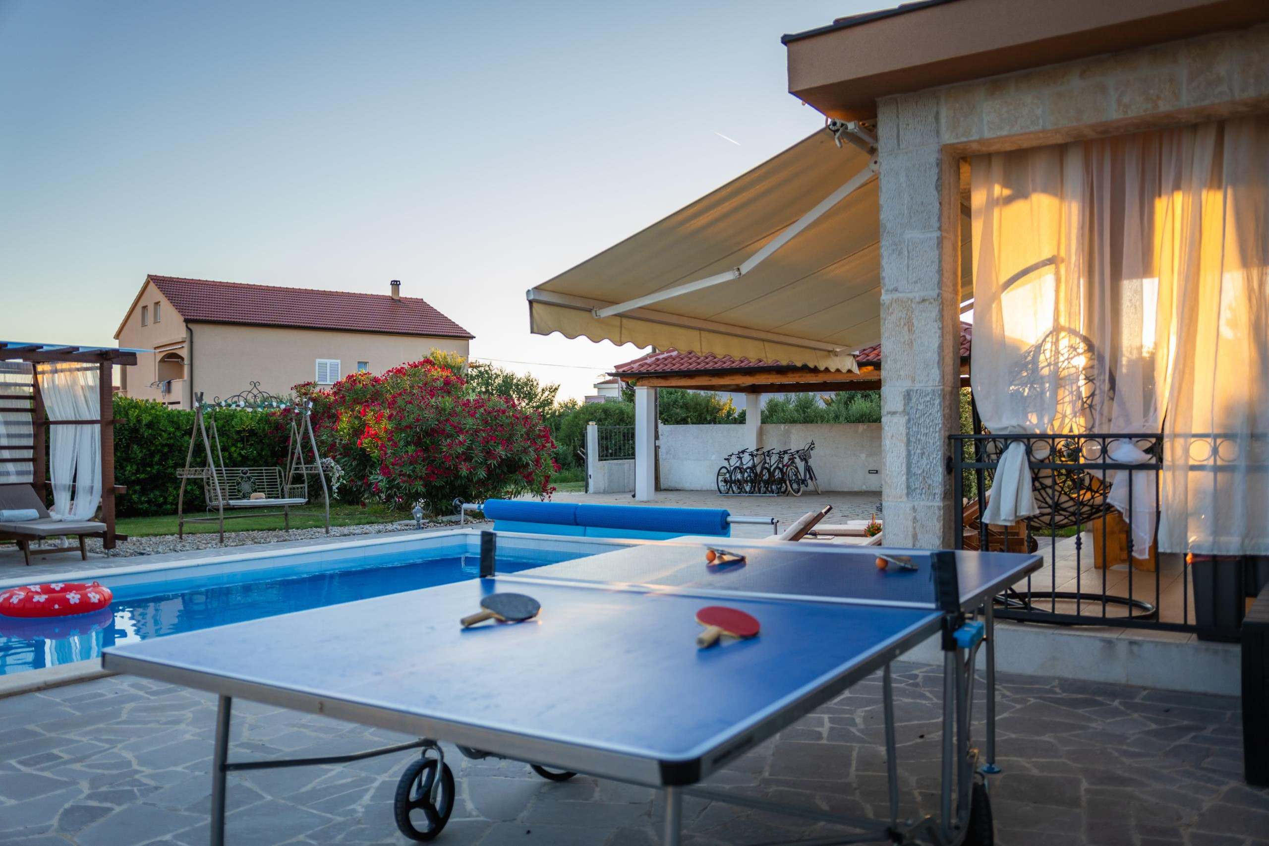 Holiday Home Beti spreads on a beautiful plot with lots of greenery and small botanical and decorative details, as well as many amenities such as a heated pool, covered terrace with a BBQ and dining area, pool table, jacuzzi, a children`s playground and many more.