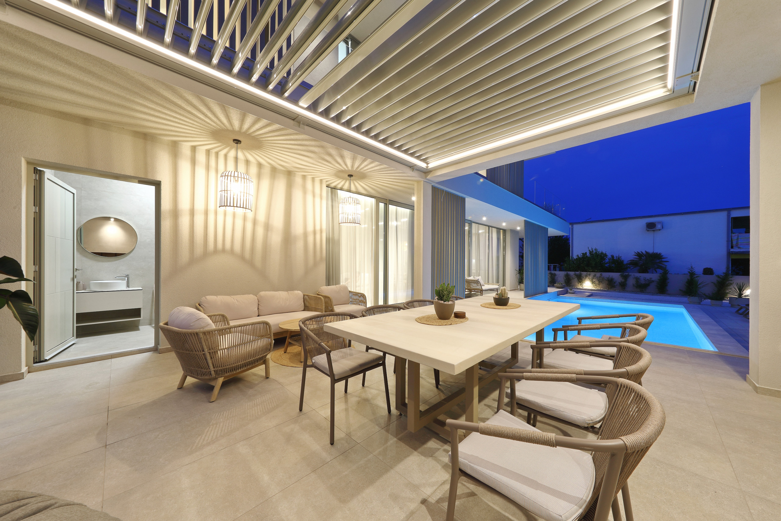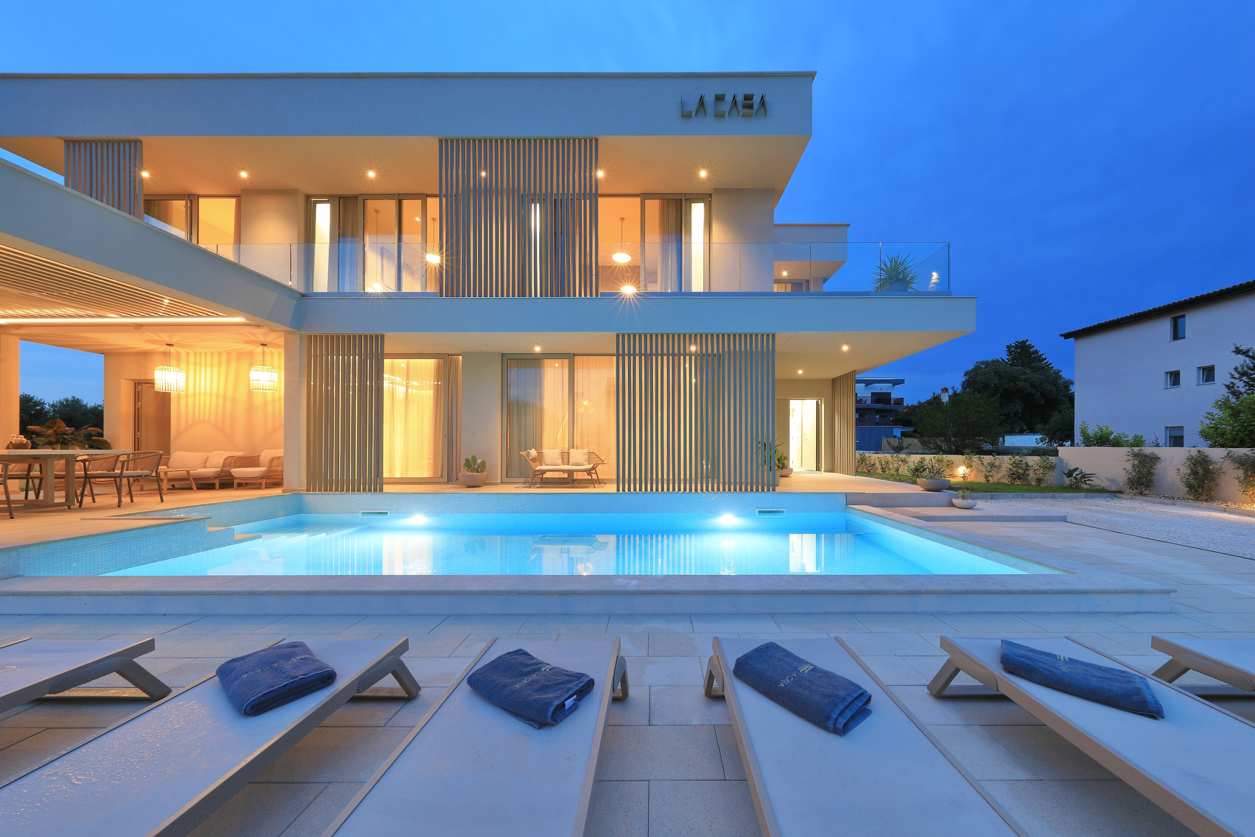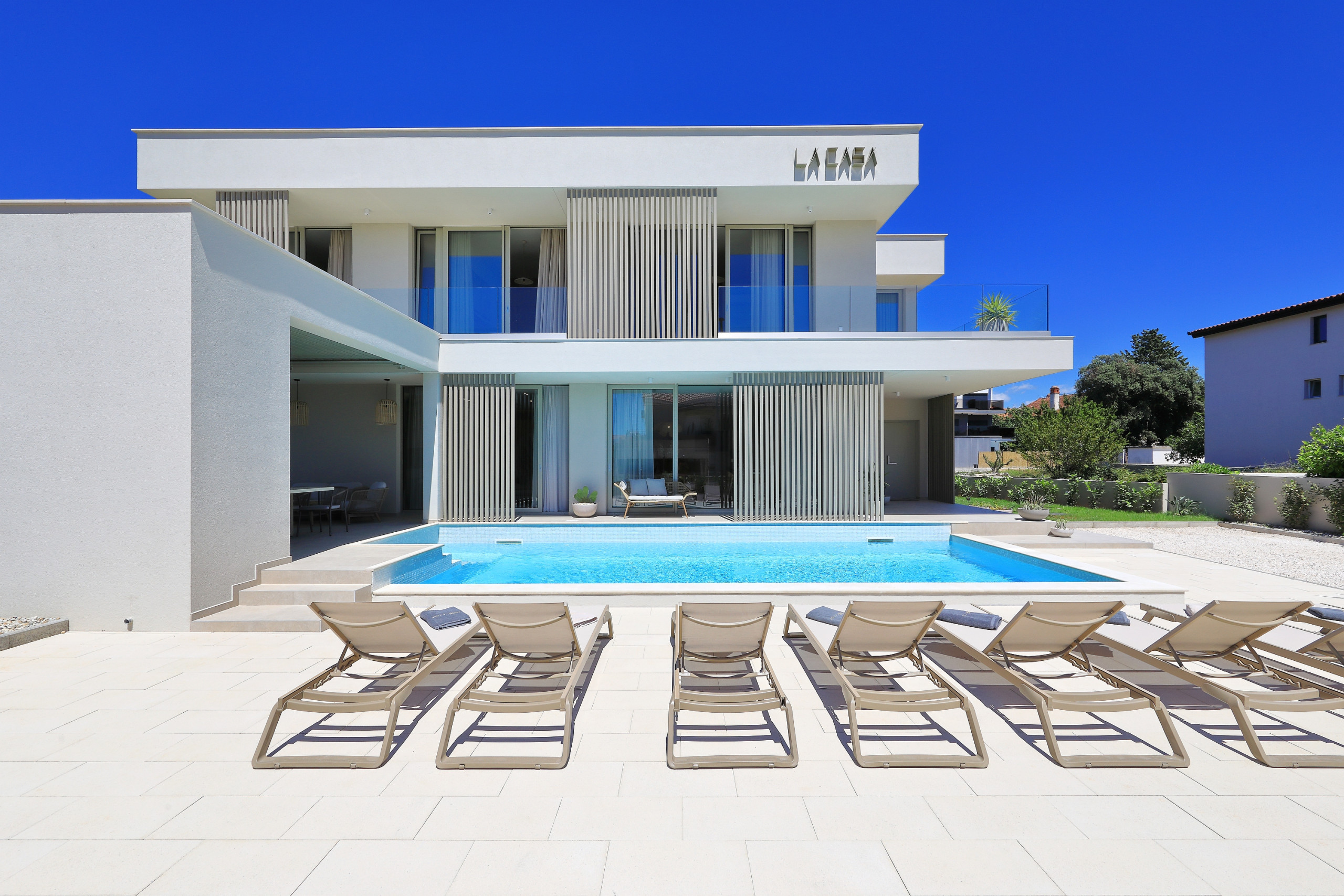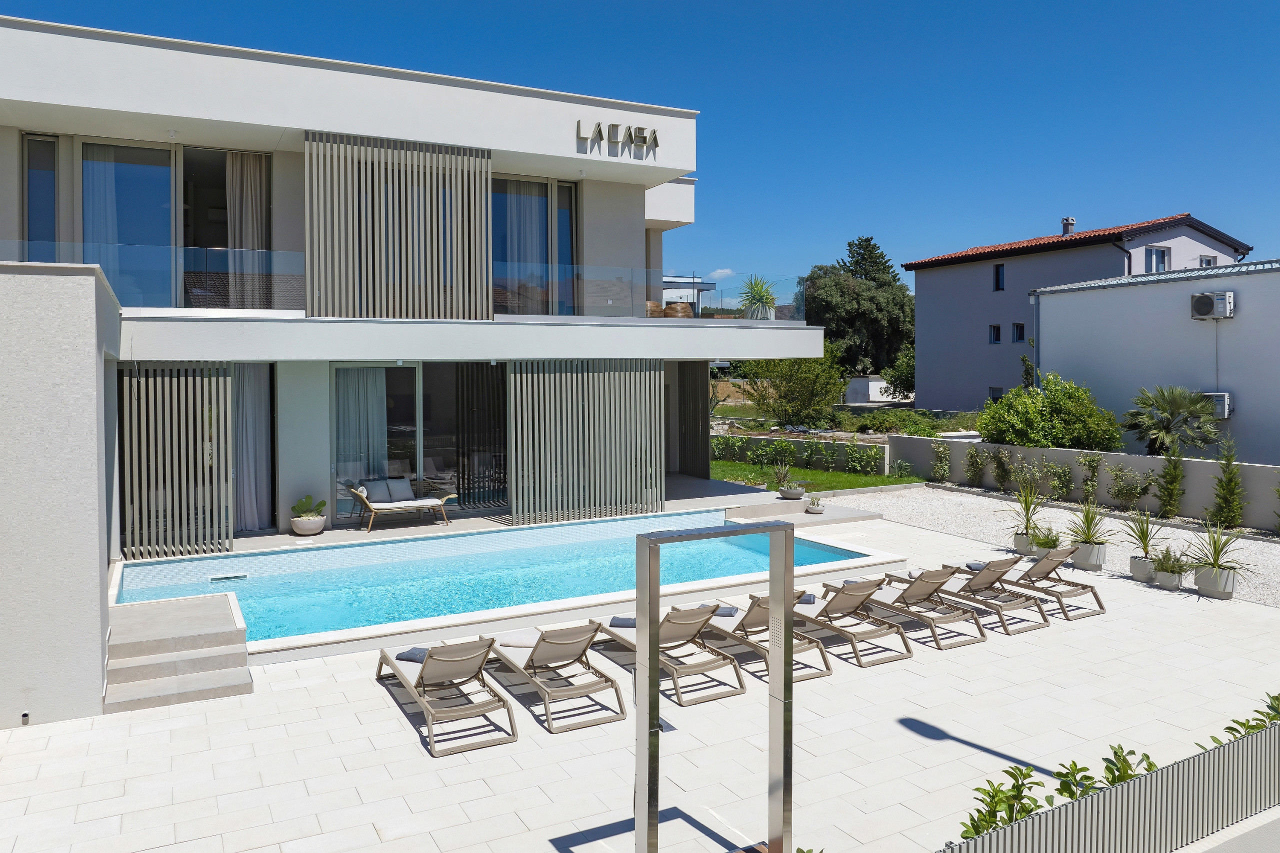 Villa La Casa accommodates up to 8 guests and features four elegant bedrooms – three with double beds and one with two single beds. Each bedroom has its own fully equipped bathroom, ensuring maximum comfort and privacy. All rooms are air-conditioned and come with a TV. The spacious open-plan living room and kitchen exude luxury and contemporary design. The fully equipped kitchen meets the needs of even the most demanding guests, while the stylish living area provides the perfect space for socializing and relaxation. In addition to 4 bathrooms in the bedrooms, guests also have access to 2 separate toilets, one in the living room and the other outside by the outdoor dining area, ensuring maximum comfort and convenience.