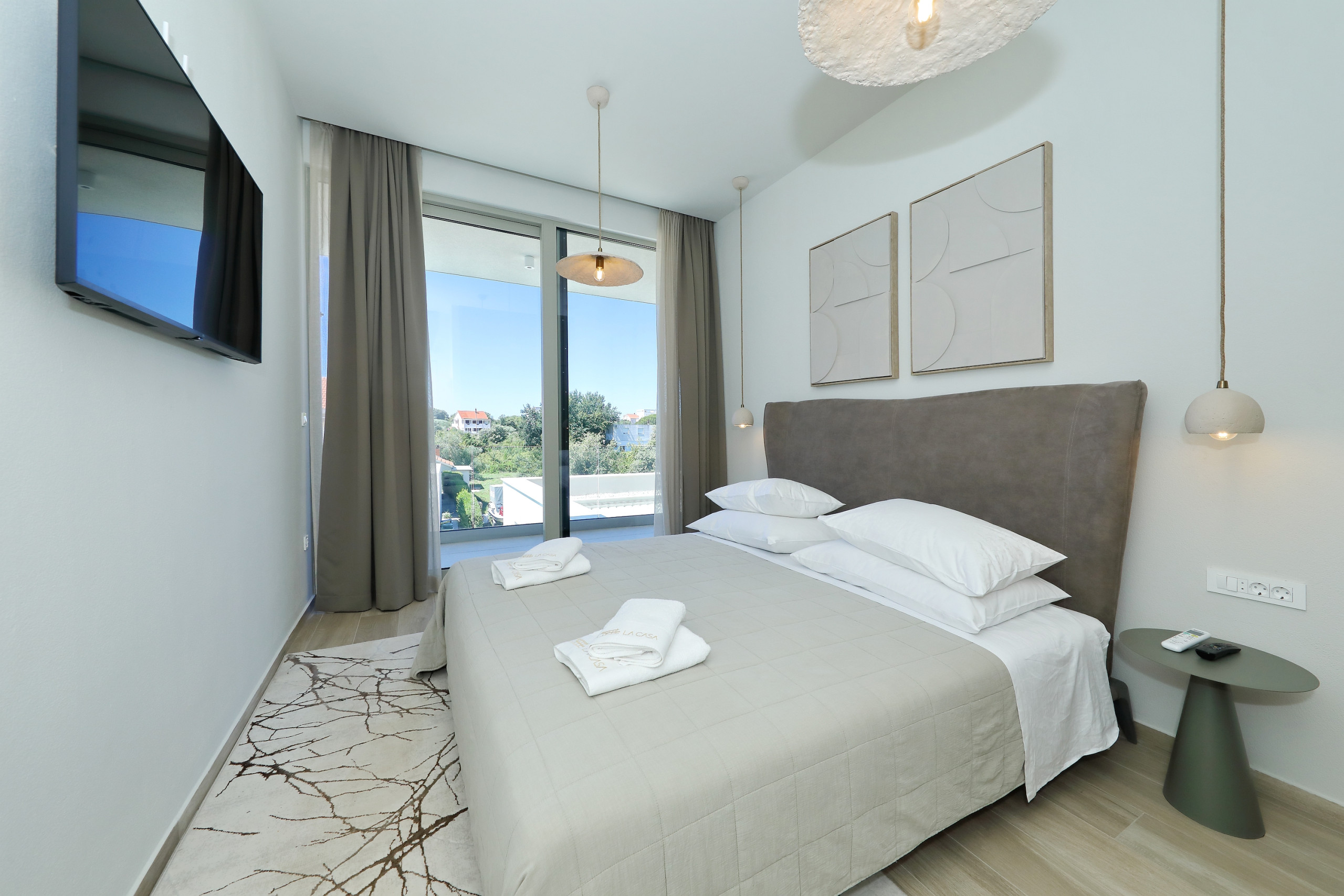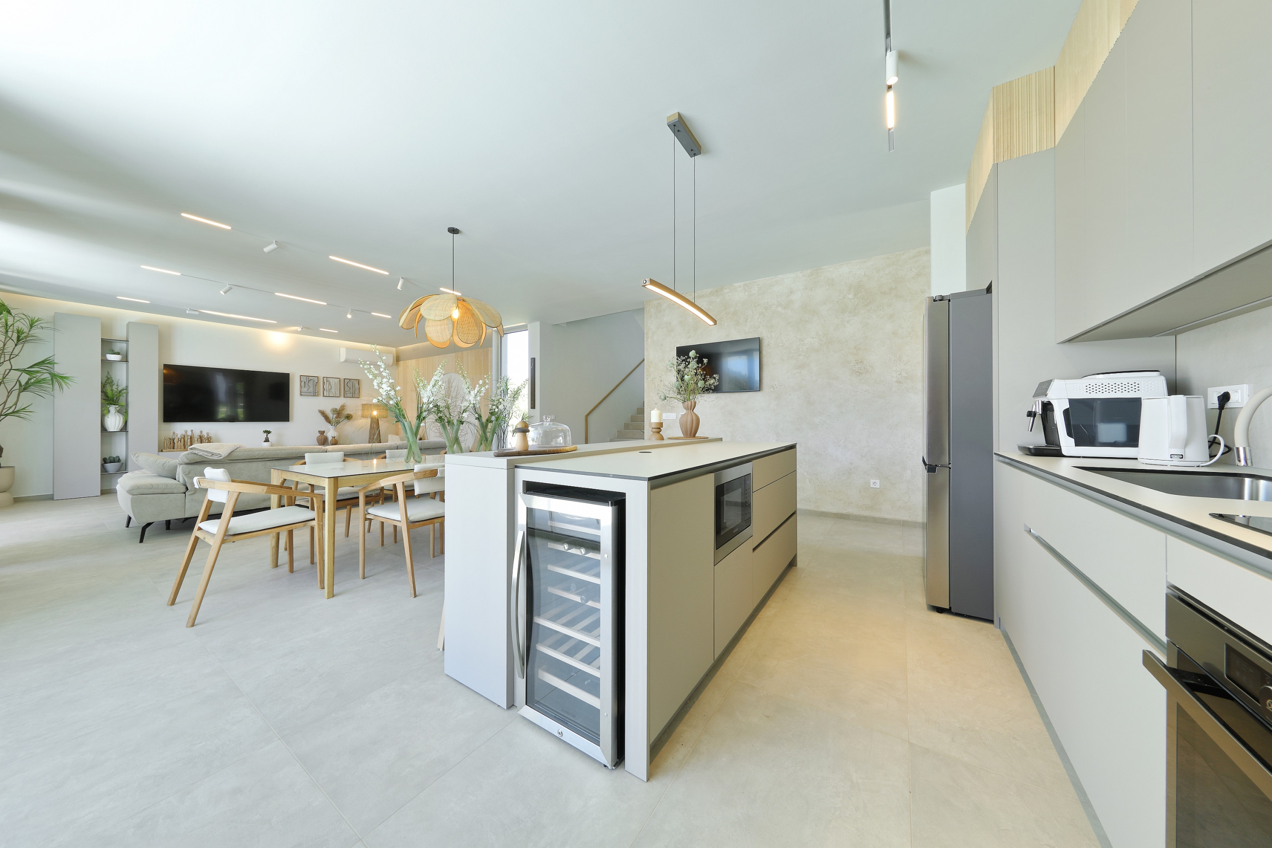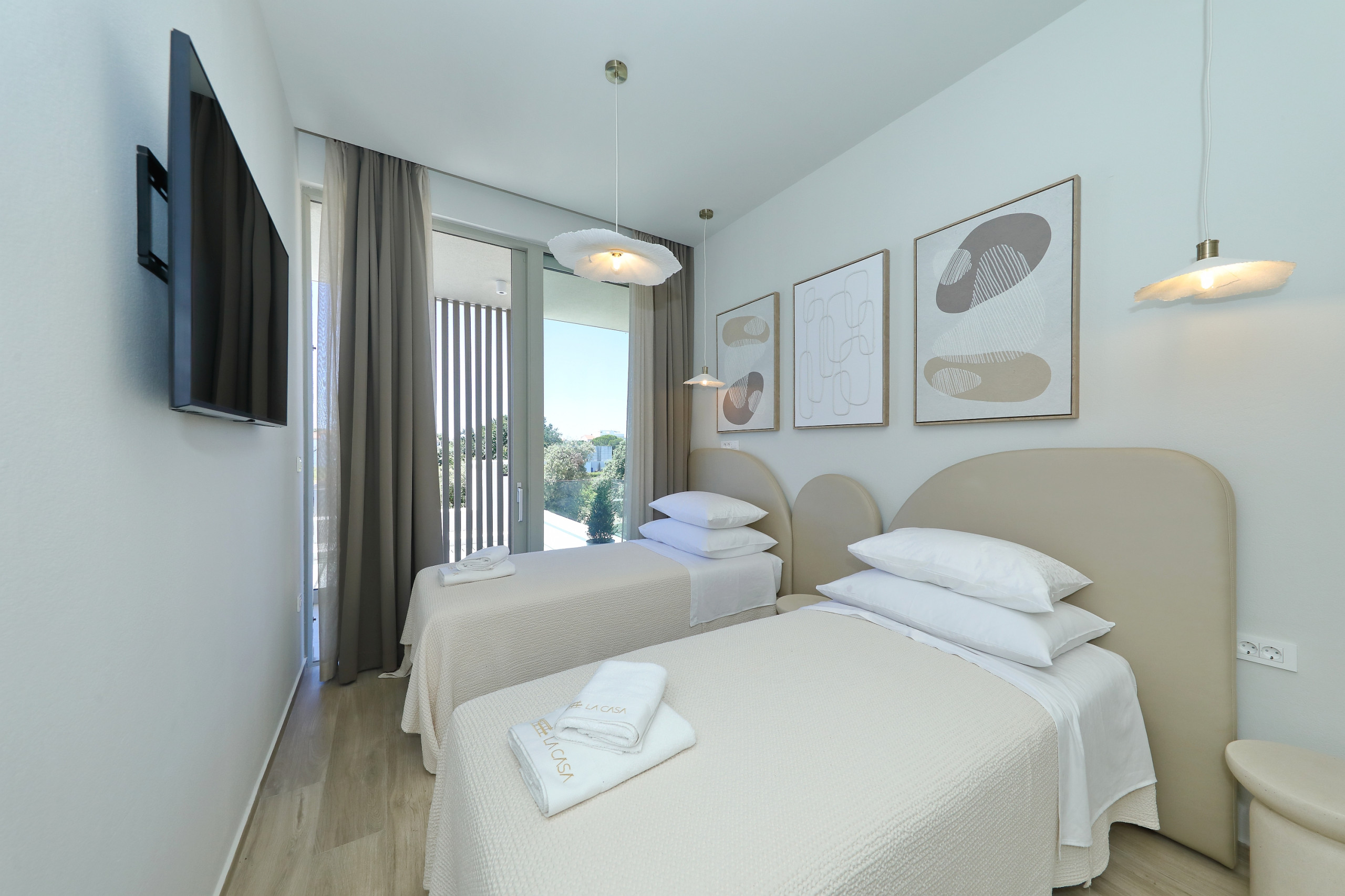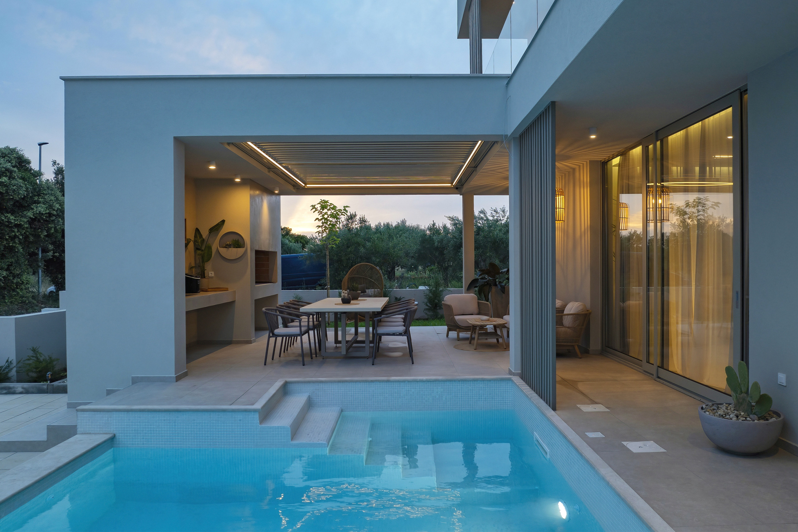 Villa La Casa accommodates up to 8 guests and features four elegant bedrooms – three with double beds and one with two single beds. Each bedroom has its own fully equipped bathroom, ensuring maximum comfort and privacy. All rooms are air-conditioned and come with a TV. The spacious open-plan living room and kitchen exude luxury and contemporary design. The fully equipped kitchen meets the needs of even the most demanding guests, while the stylish living area provides the perfect space for socializing and relaxation. In addition to 4 bathrooms in the bedrooms, guests also have access to 2 separate toilets, one in the living room and the other outside by the outdoor dining area, ensuring maximum comfort and convenience.