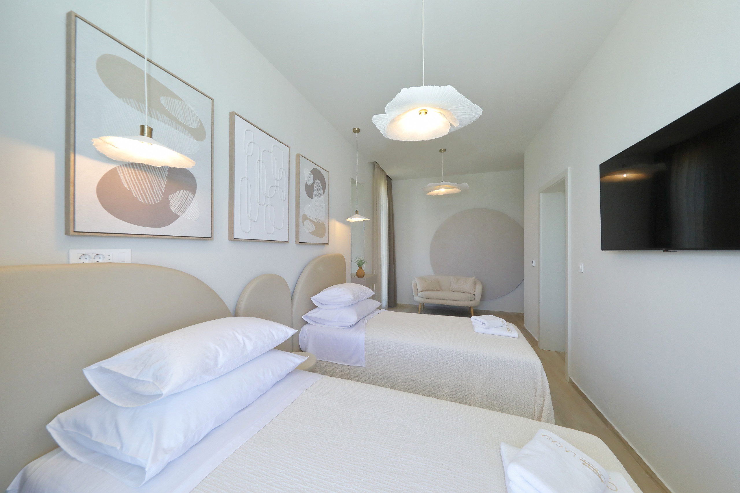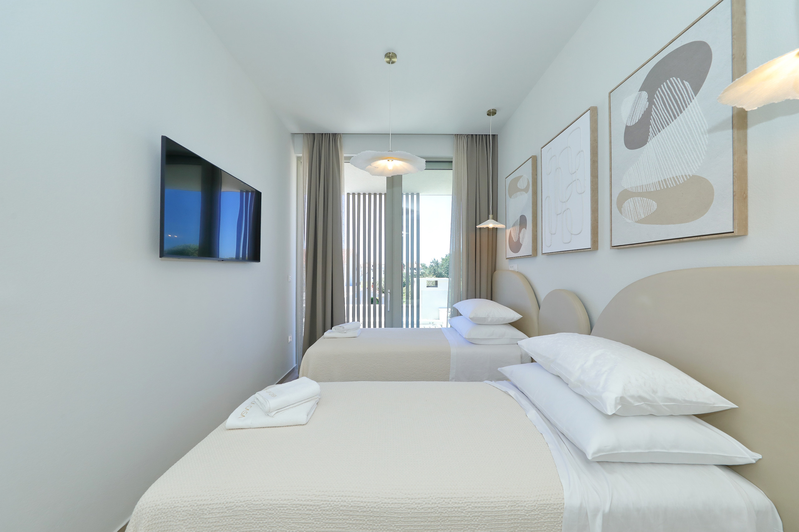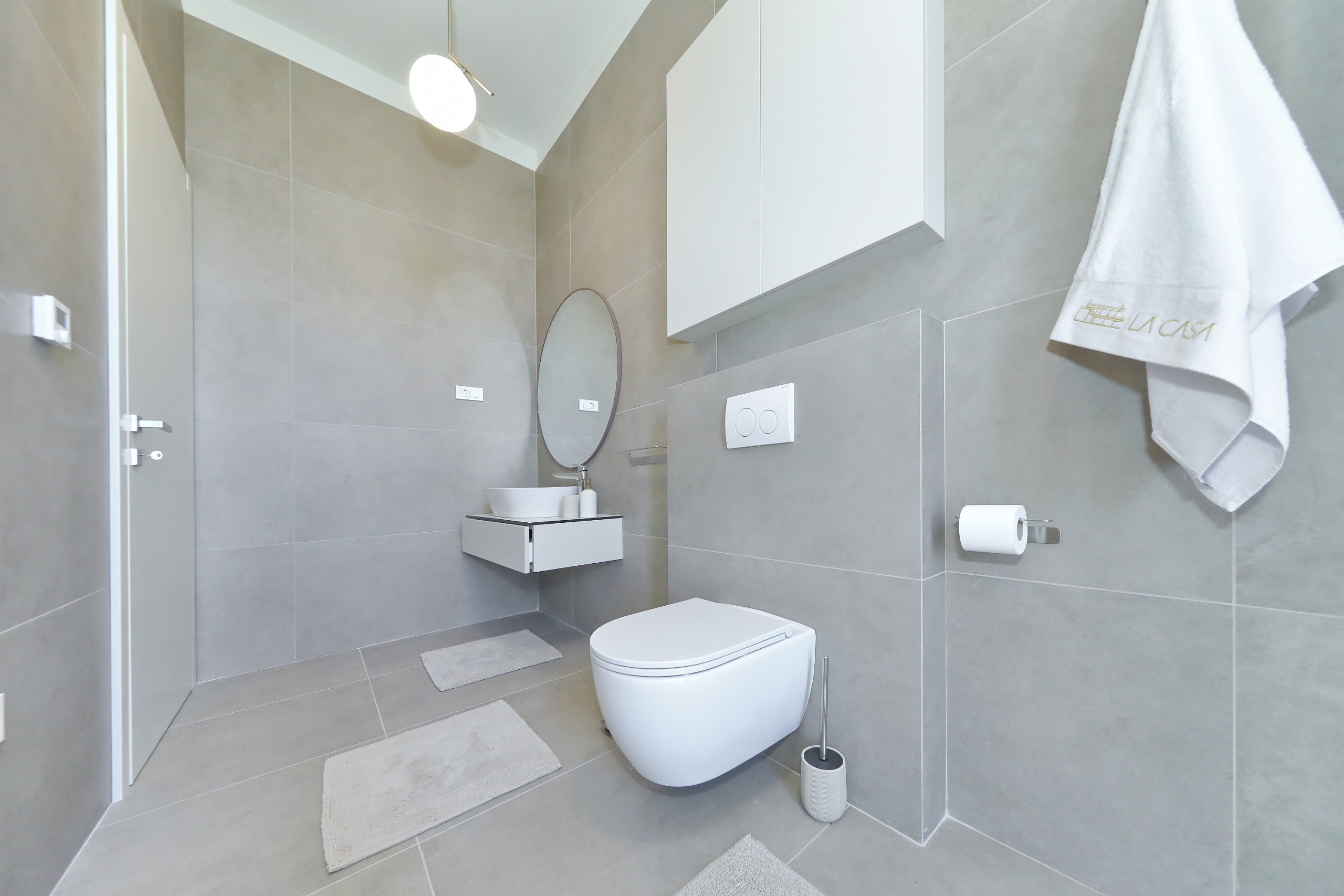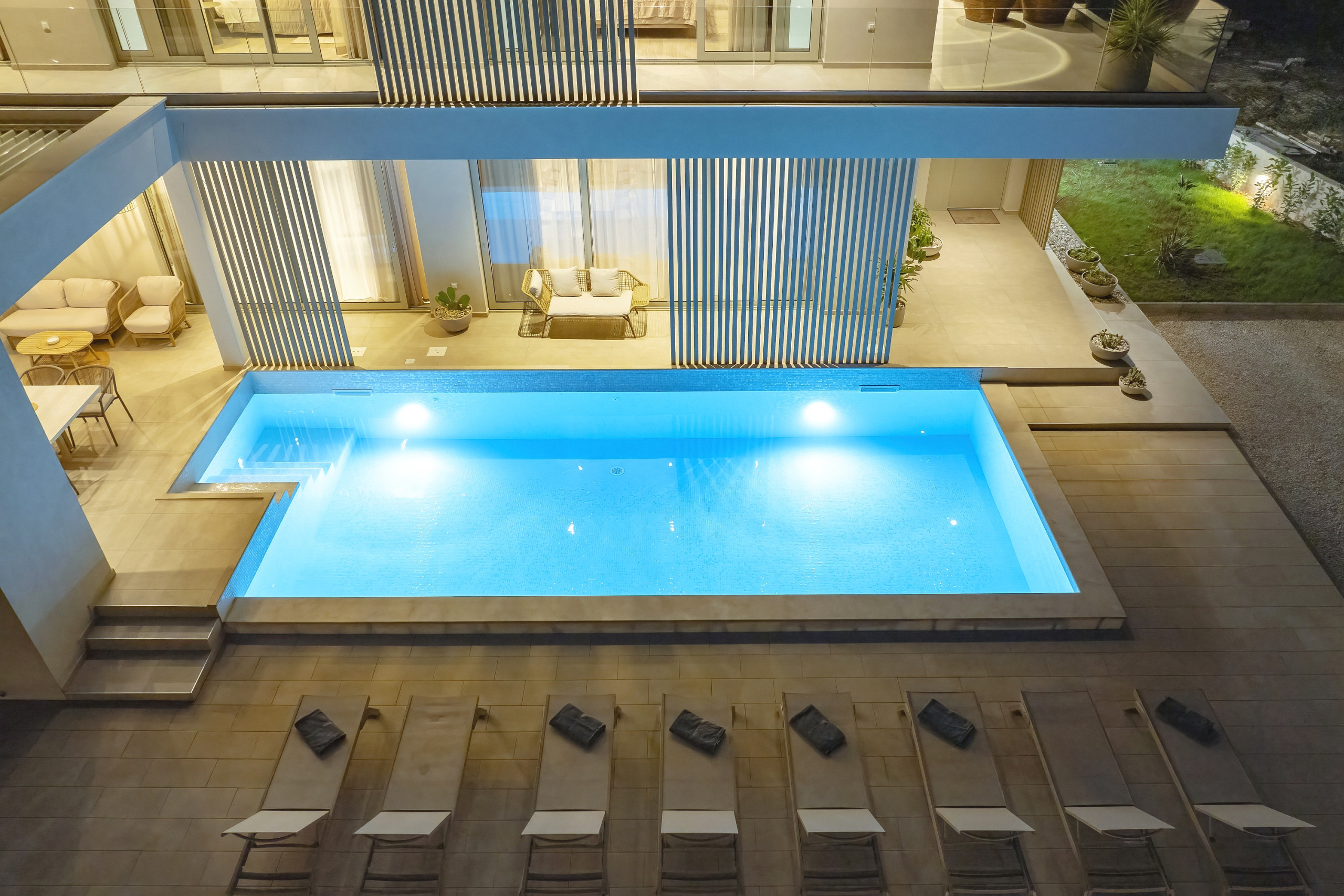 Villa La Casa accommodates up to 8 guests and features four elegant bedrooms – three with double beds and one with two single beds. Each bedroom has its own fully equipped bathroom, ensuring maximum comfort and privacy. All rooms are air-conditioned and come with a TV. The spacious open-plan living room and kitchen exude luxury and contemporary design. The fully equipped kitchen meets the needs of even the most demanding guests, while the stylish living area provides the perfect space for socializing and relaxation. In addition to 4 bathrooms in the bedrooms, guests also have access to 2 separate toilets, one in the living room and the other outside by the outdoor dining area, ensuring maximum comfort and convenience.