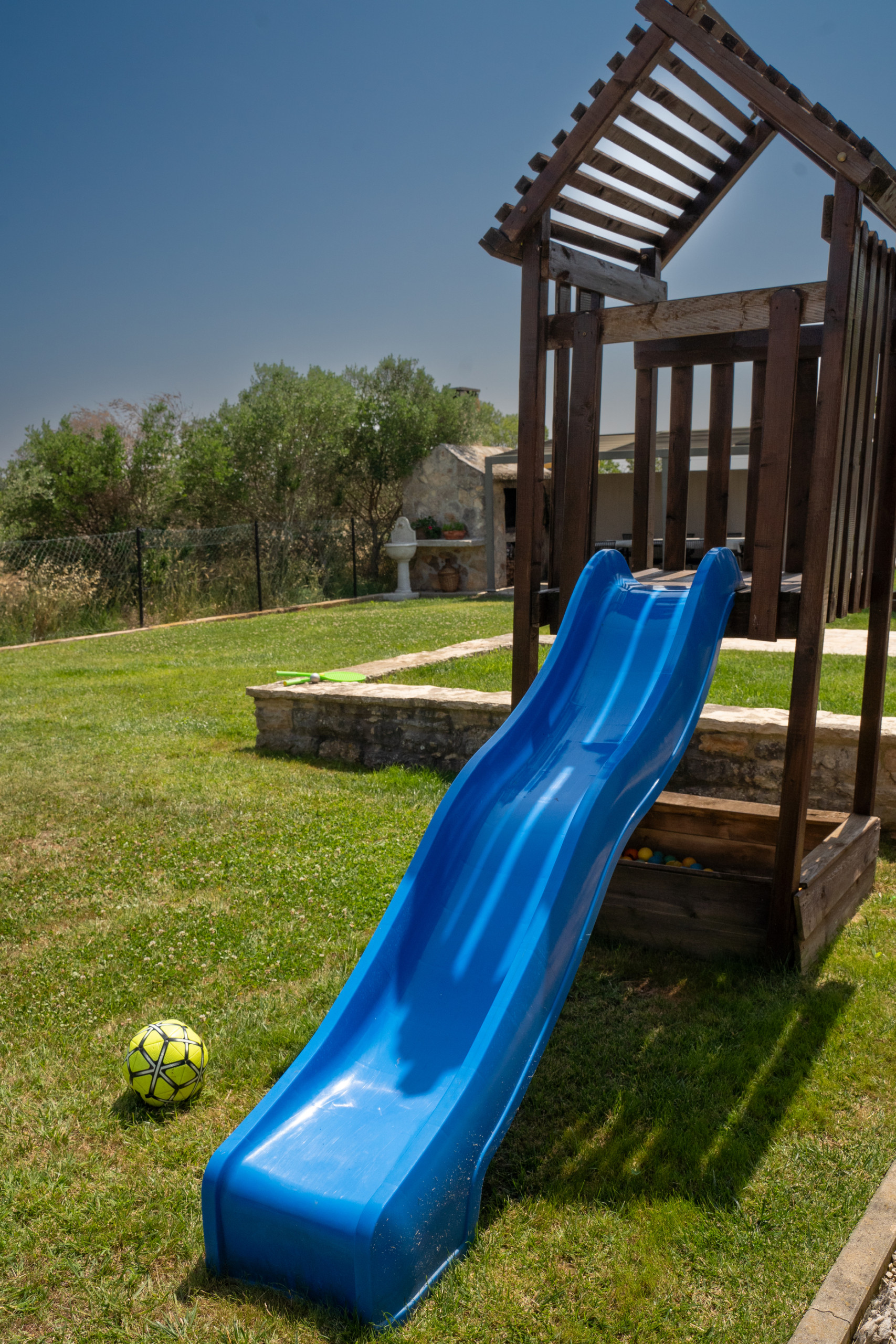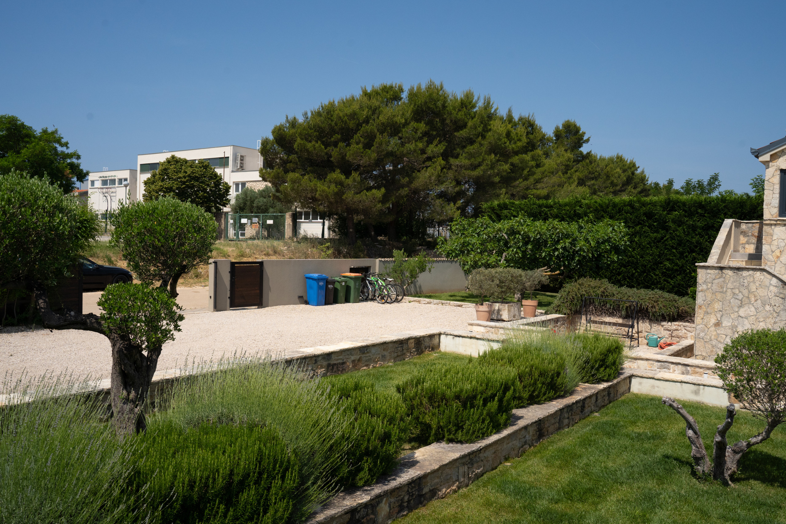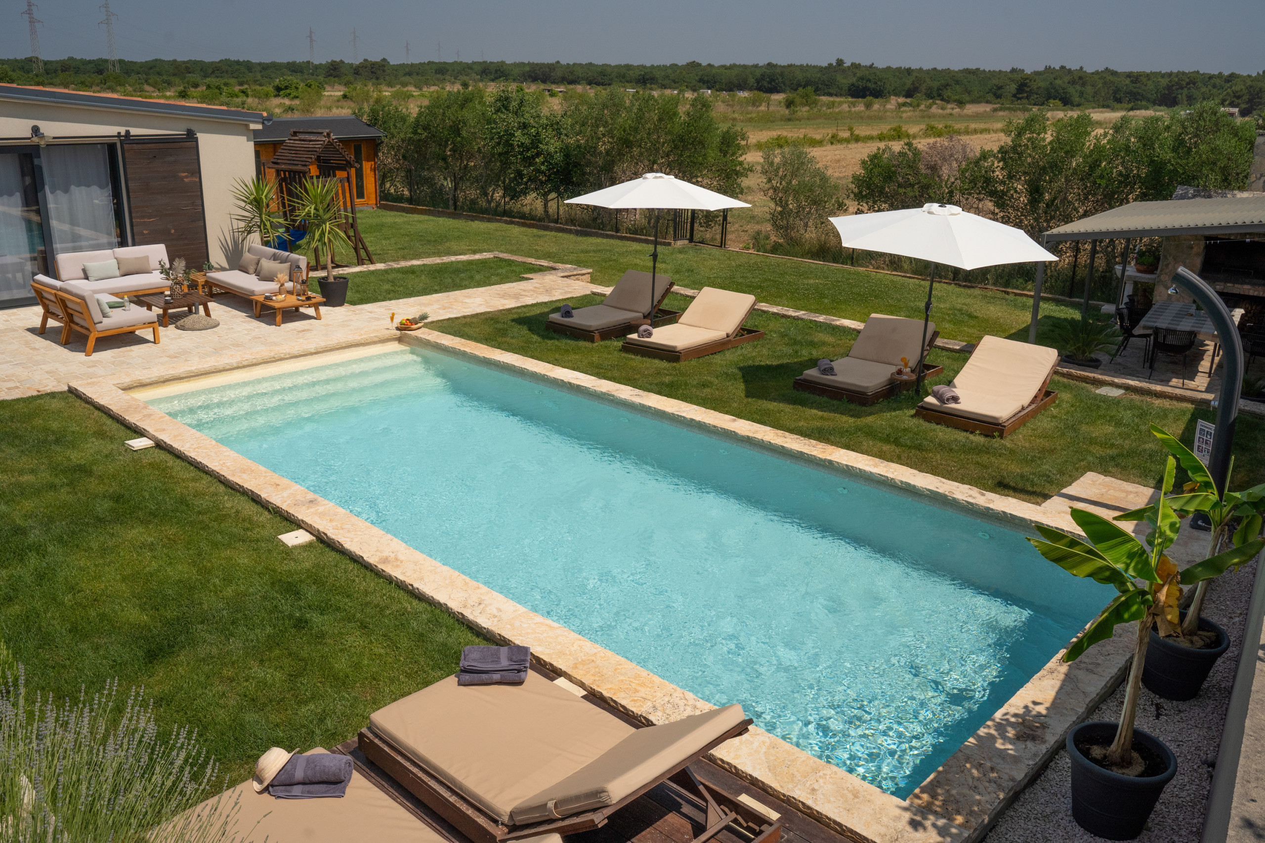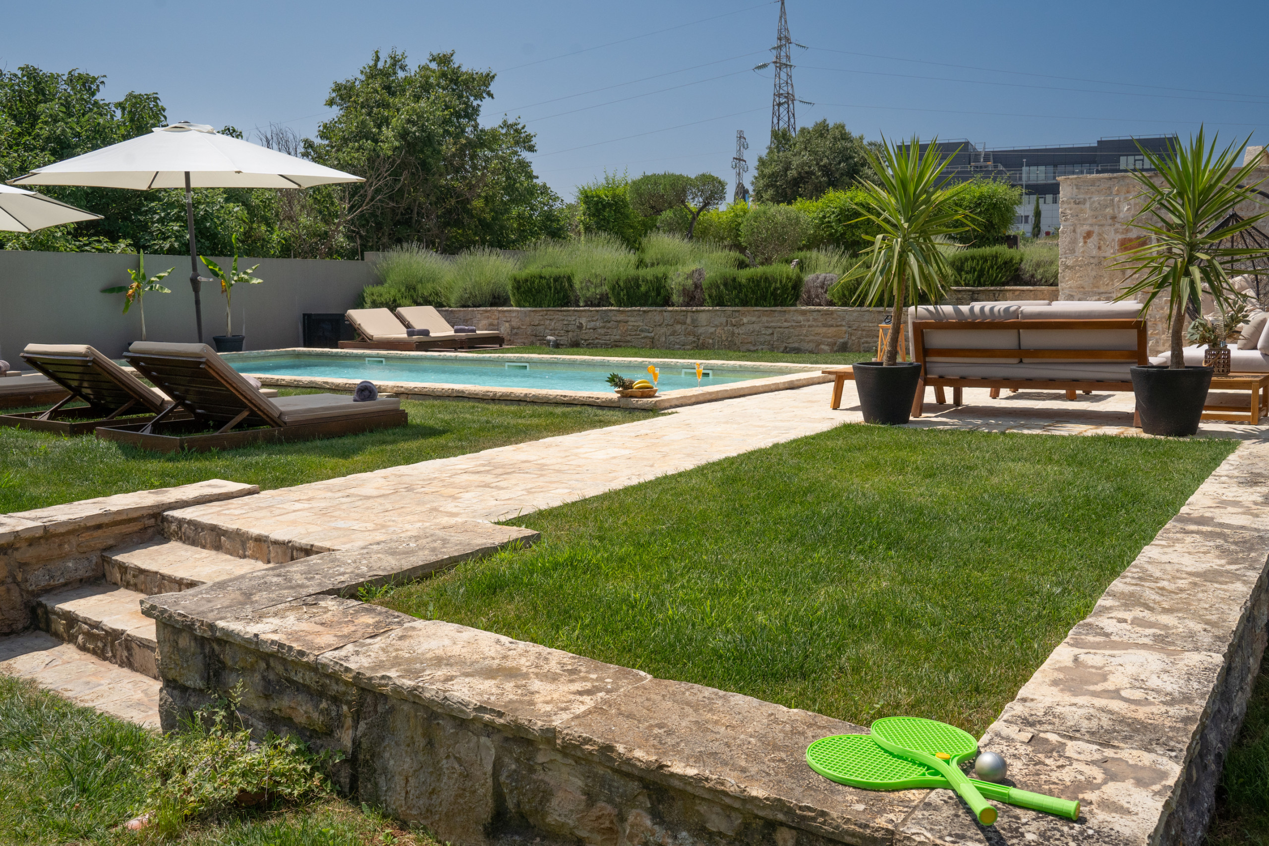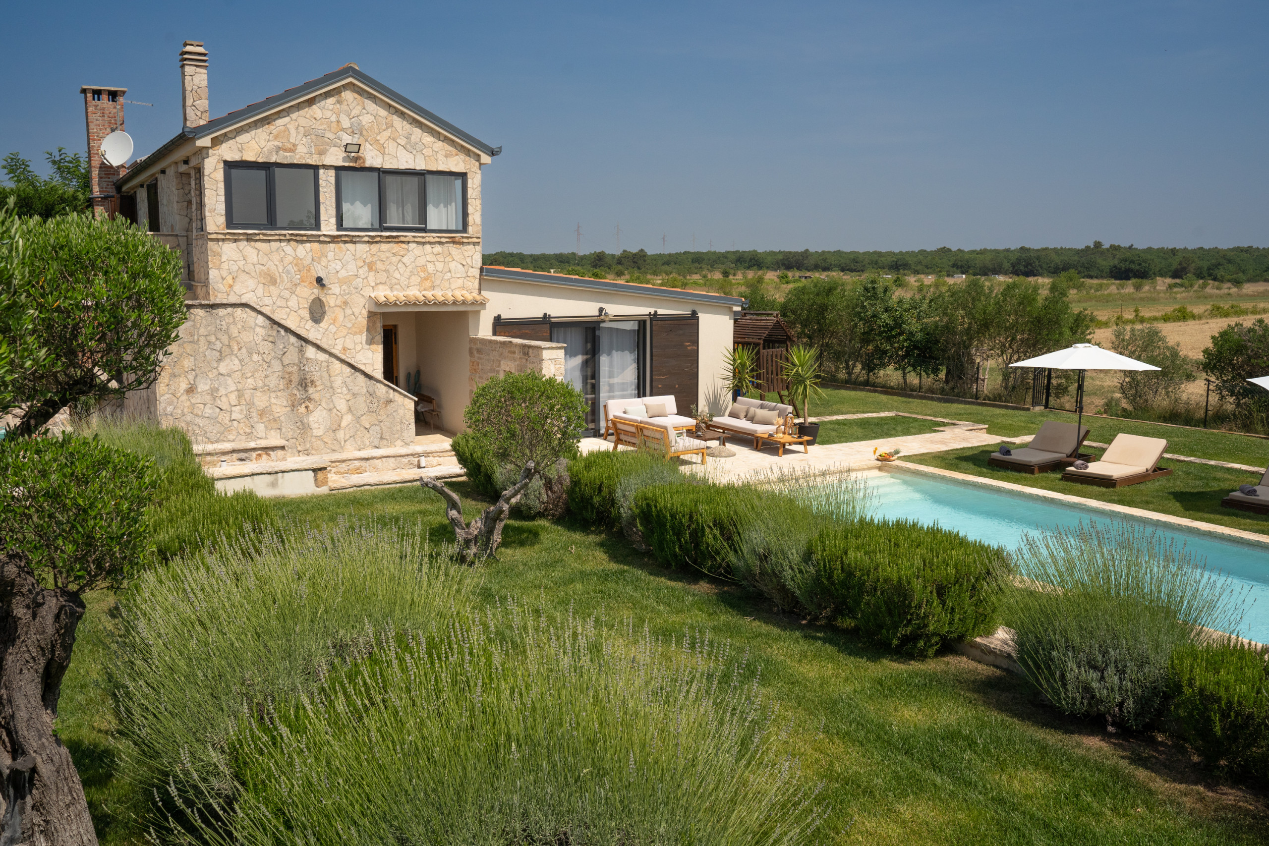 The outdoor area is a true Mediterranean oasis - in the center of the courtyard there is a large heated swimming pool (40 m²), surrounded by fragrant herbs, olive trees and local spices. In the corner of the garden there is a covered terrace with a barbecue - perfect for preparing a meal at sunset or enjoying a morning coffee as the sun rises. Evenings by the jacuzzi, under the clear Dalmatian sky, turn into a real little treat for the soul and body.