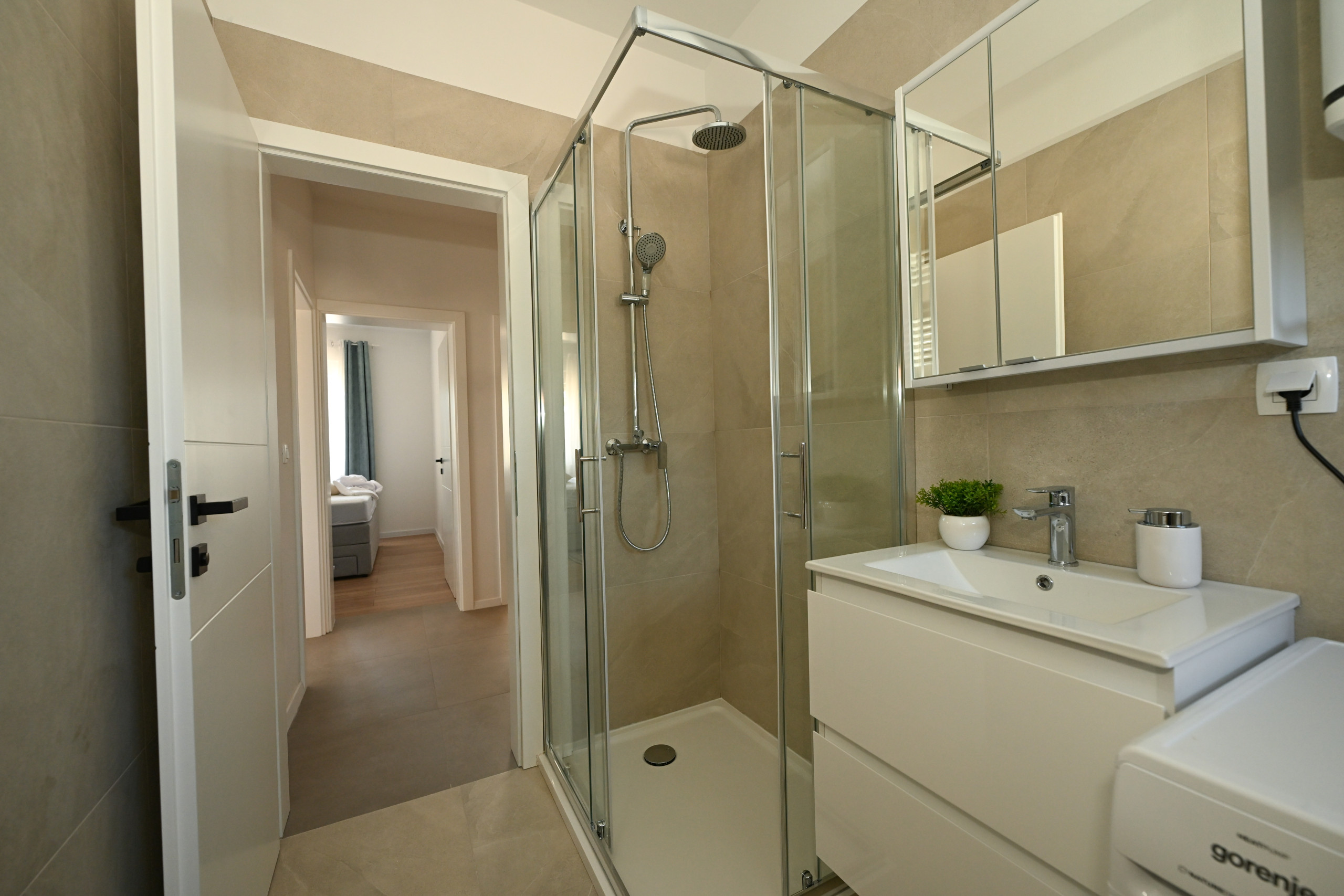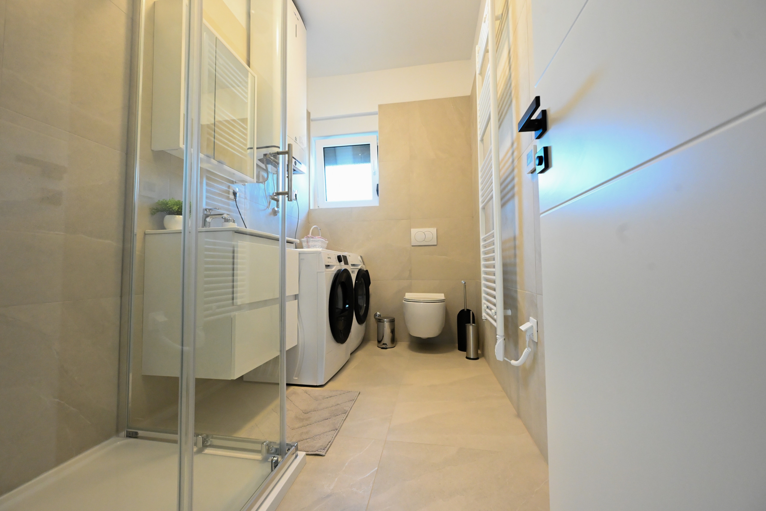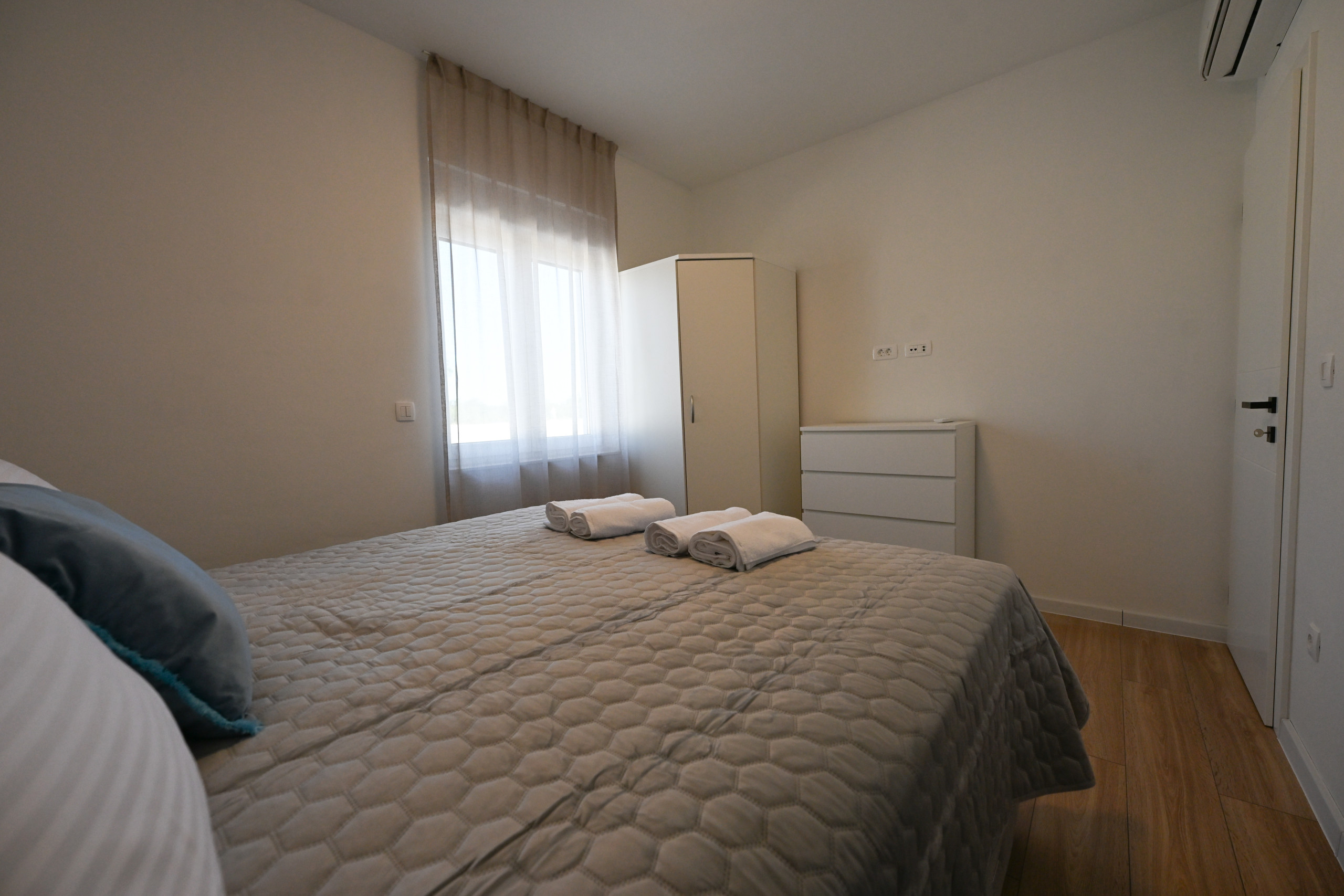 The villa accommodates six guests in three spacious bedrooms, each with a double bed (180x200 cm). One or two additional guests can sleep on a sofa bed in the living room. There are two modern bathrooms with showers, one of which is equipped with a washing machine and dryer, making longer stays more convenient.