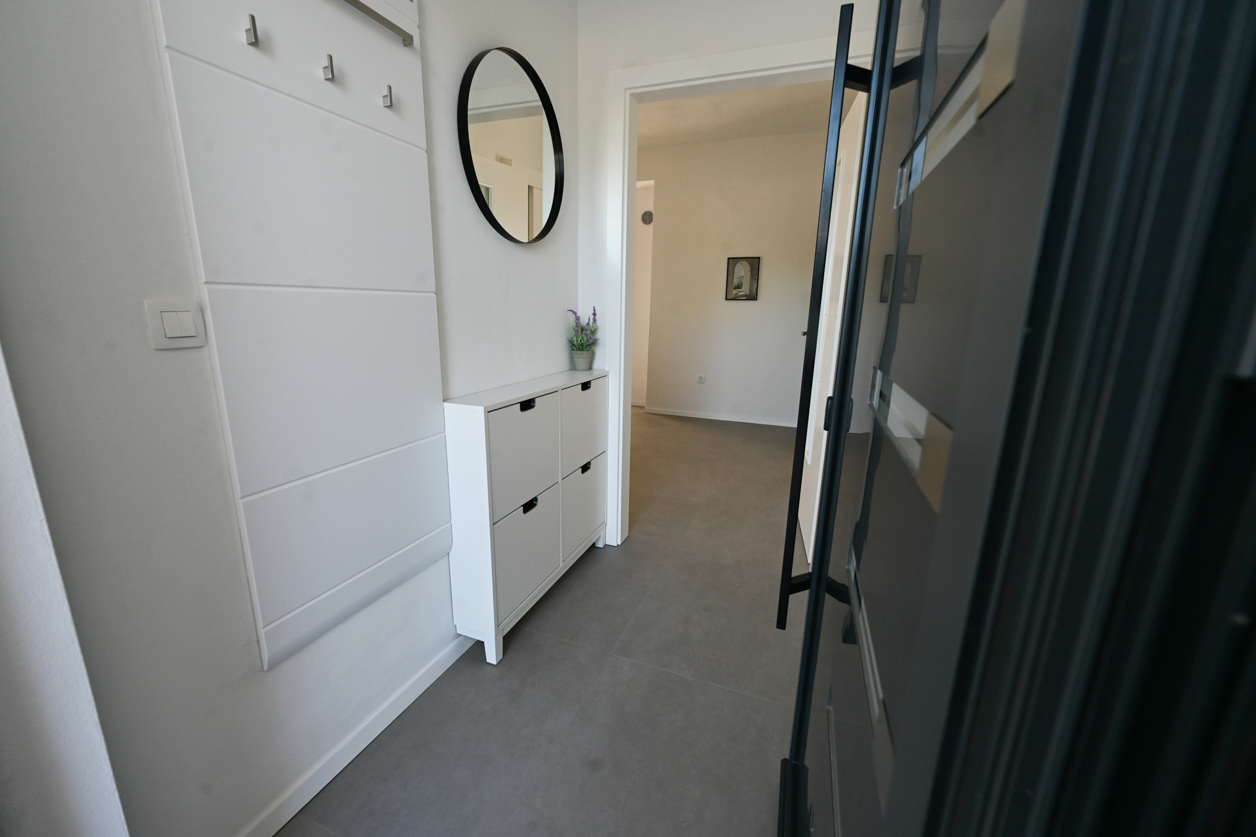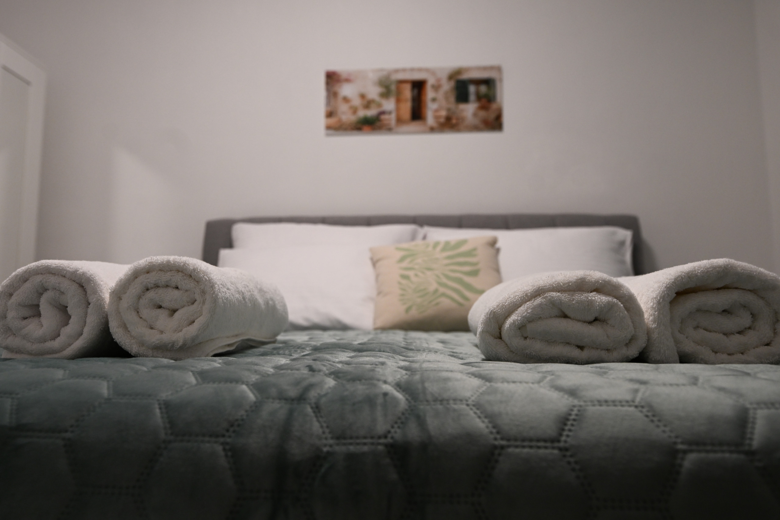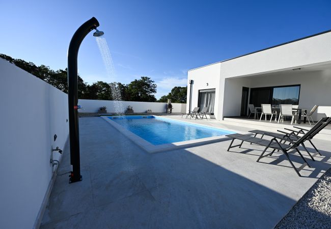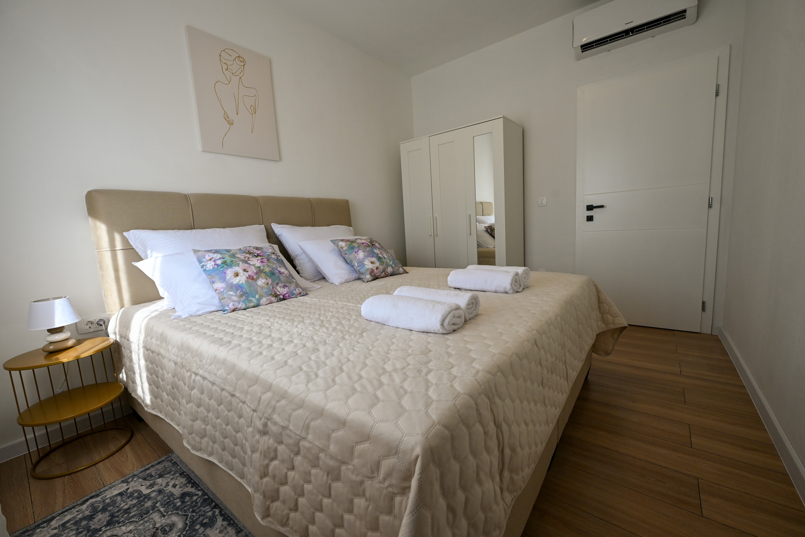 The villa accommodates six guests in three spacious bedrooms, each with a double bed (180x200 cm). One or two additional guests can sleep on a sofa bed in the living room. There are two modern bathrooms with showers, one of which is equipped with a washing machine and dryer, making longer stays more convenient.