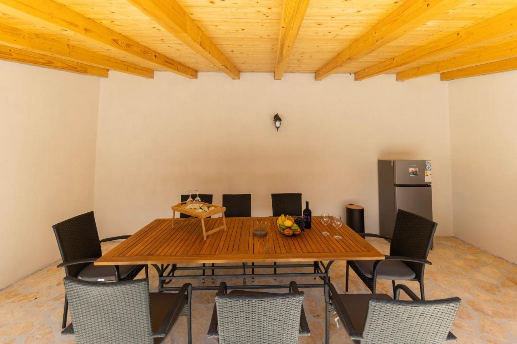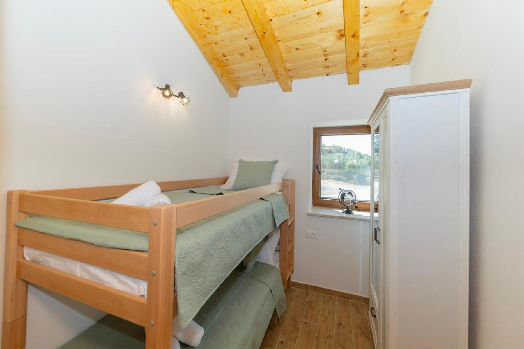 The villa accommodates up to eight people, featuring four comfortable bedrooms. Three rooms are equipped with double beds, while the fourth has a bunk bed, ideal for children or younger family members. The spacious living room provides the perfect space for relaxation, and the kitchen is fully equipped with all necessary appliances and tools to prepare your favorite meals, making your stay both convenient and enjoyable.