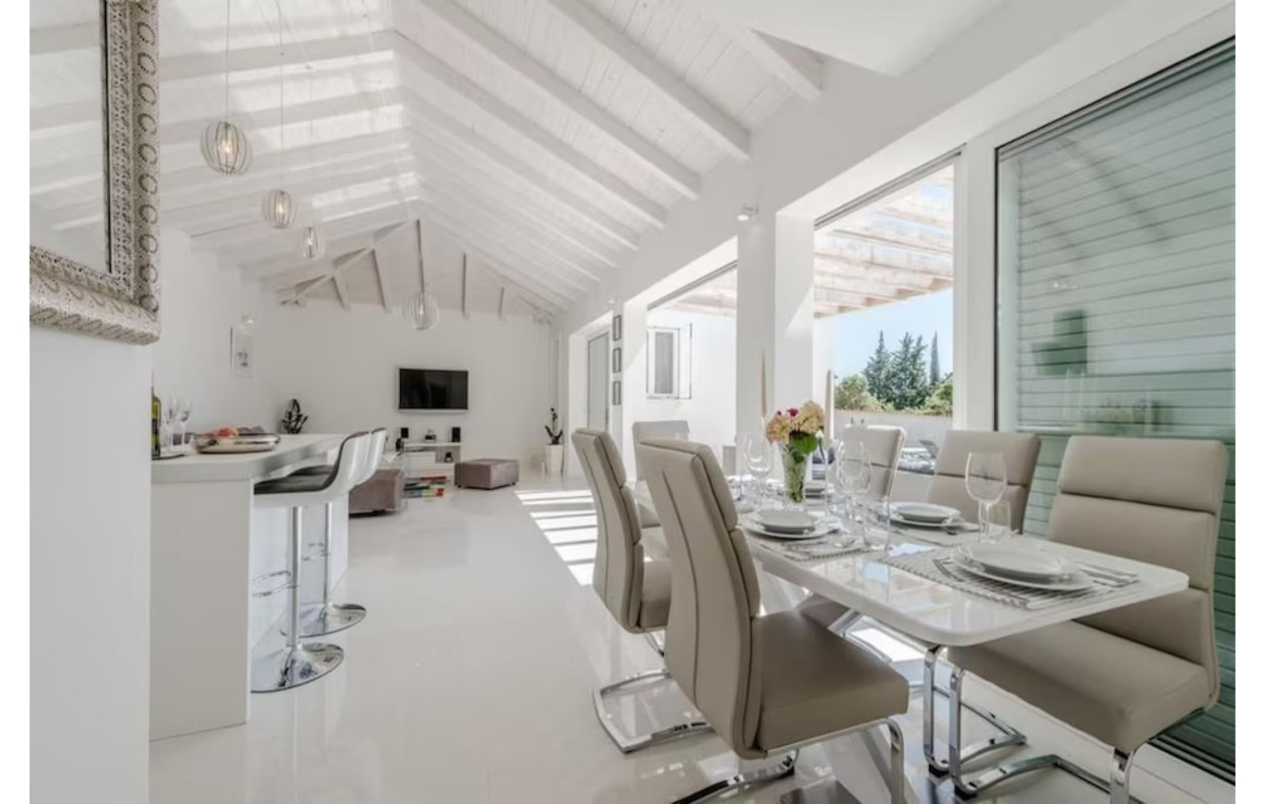 The ground floor features a fully equipped kitchen connected to the dining area and living room, with direct access to the terrace and the pool area. An additional bathroom is also located on this floor. Guests have access to free and secure parking.