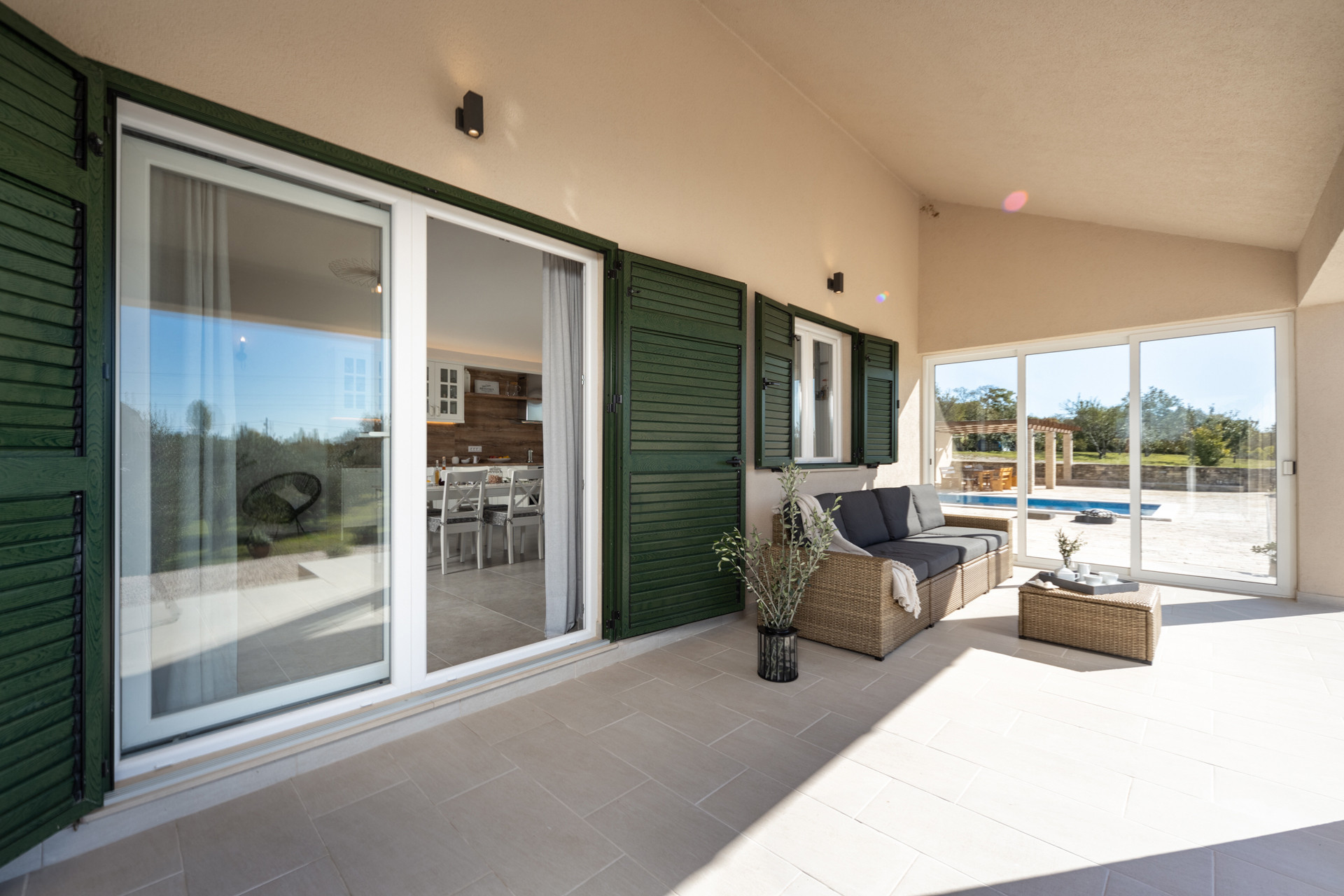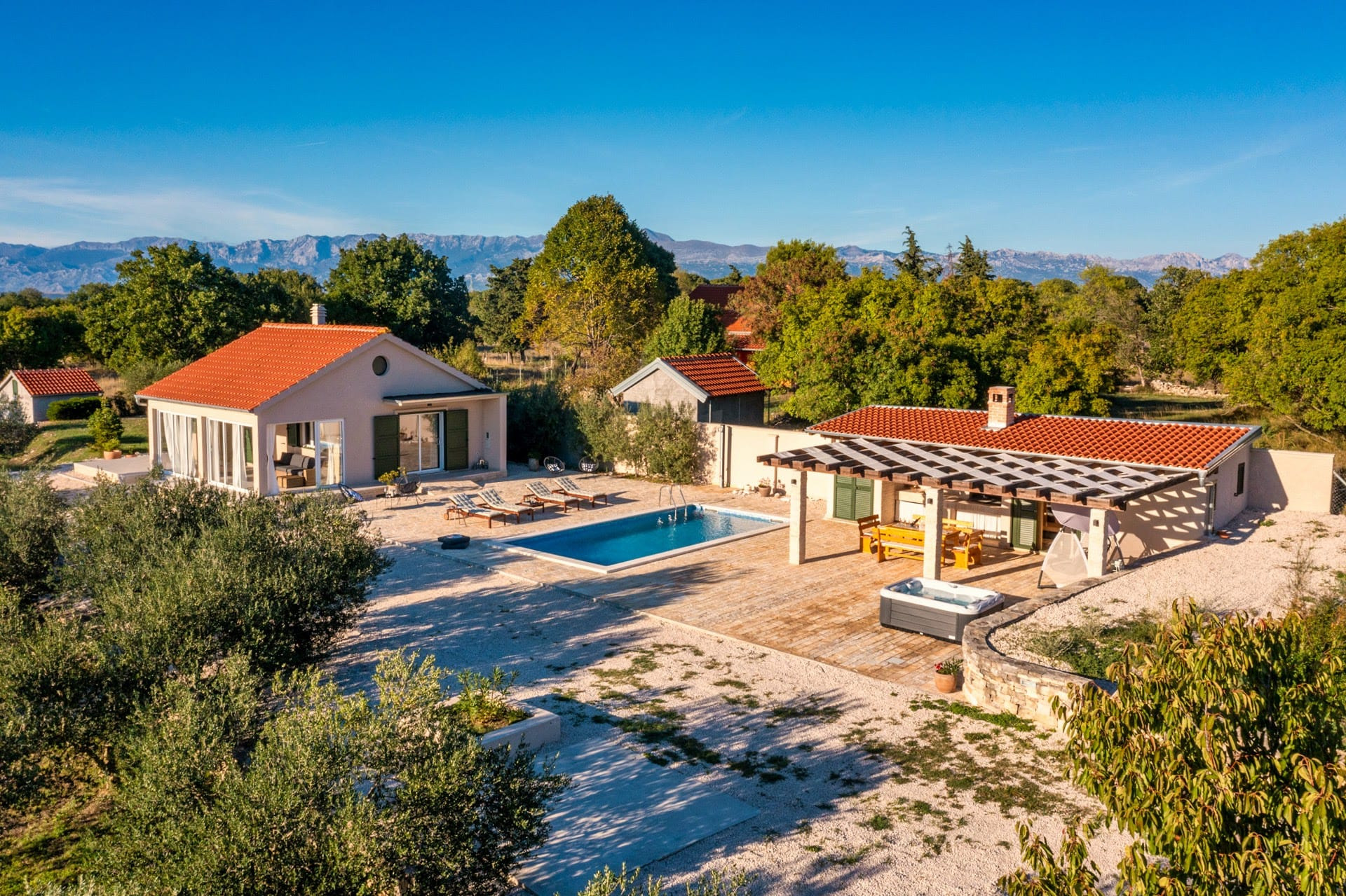 The spacious outdoors offer a pool, a jacuzzi and a sauna for those moments of relaxation and unwinding. In addition to the villa, the guests will certainly enjoy the covered terrace with a beautiful BBQ area and an outdoor dining area – a perfect place to create wonderful memories preparing and sharing family meals and spending valuable moments with your family and friends.