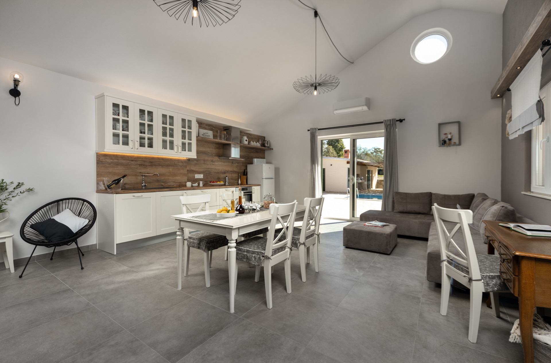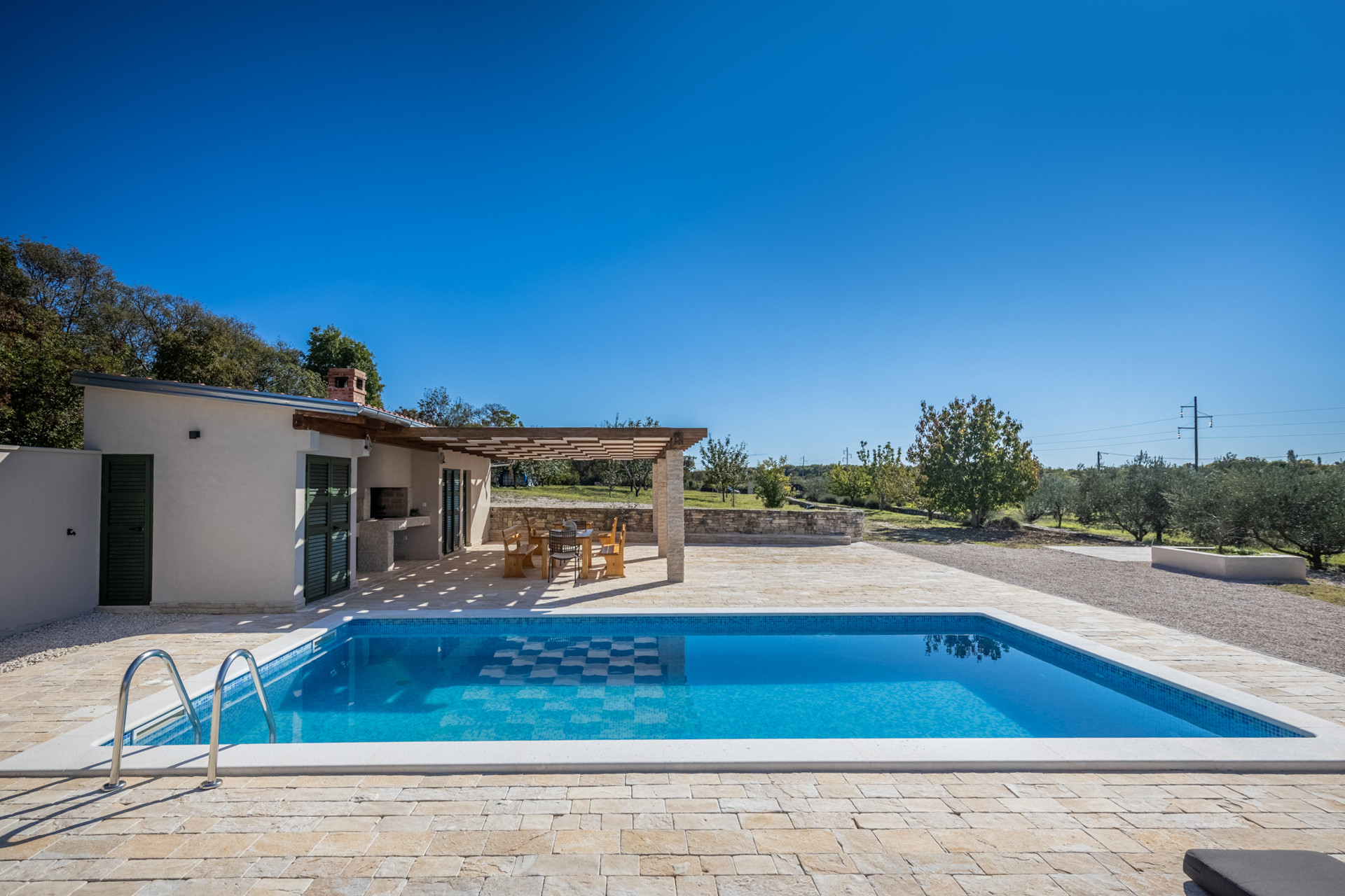 The complete estate is 14 000 m2, while the living space is 75m2. Guests have one bedroom with a double bed at their disposal, as well as a convertible double sofa, making this Villa ideal for a maximum of four guests. The house has a kitchen, dining room and living room where all is at a hand`s reach, especially the exit to the terrace and pool area. A feeling of uninterrupted connection between the indoors and the outdoors is amazing.