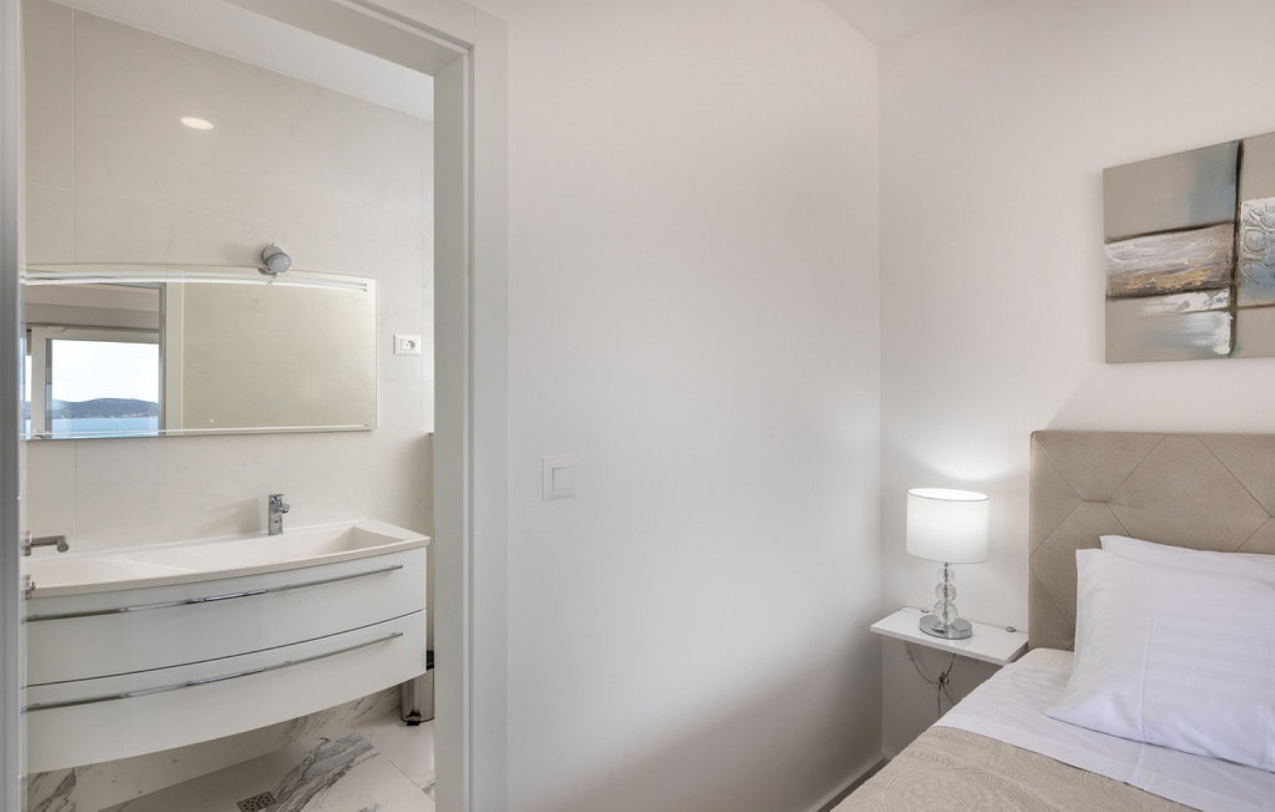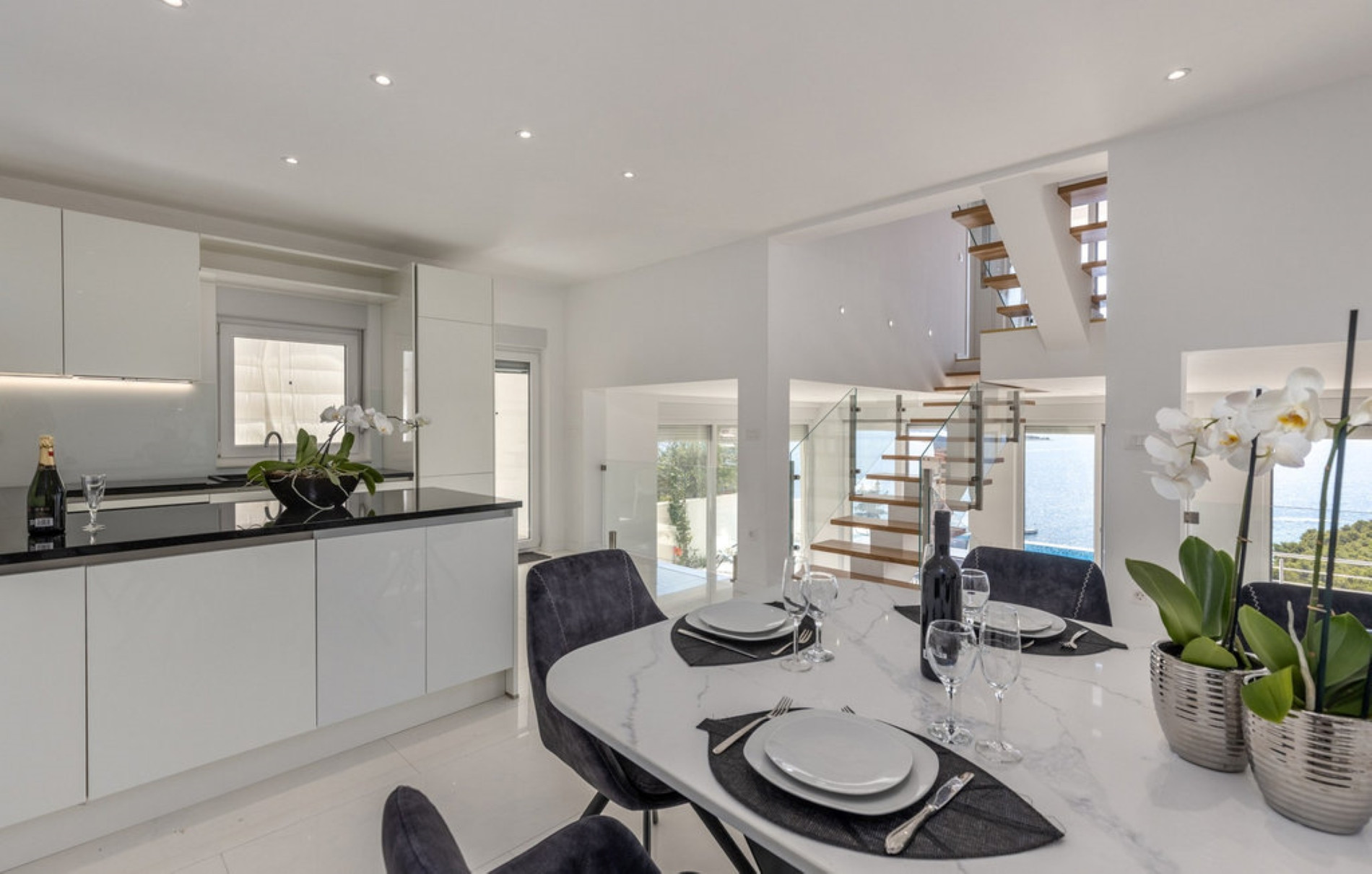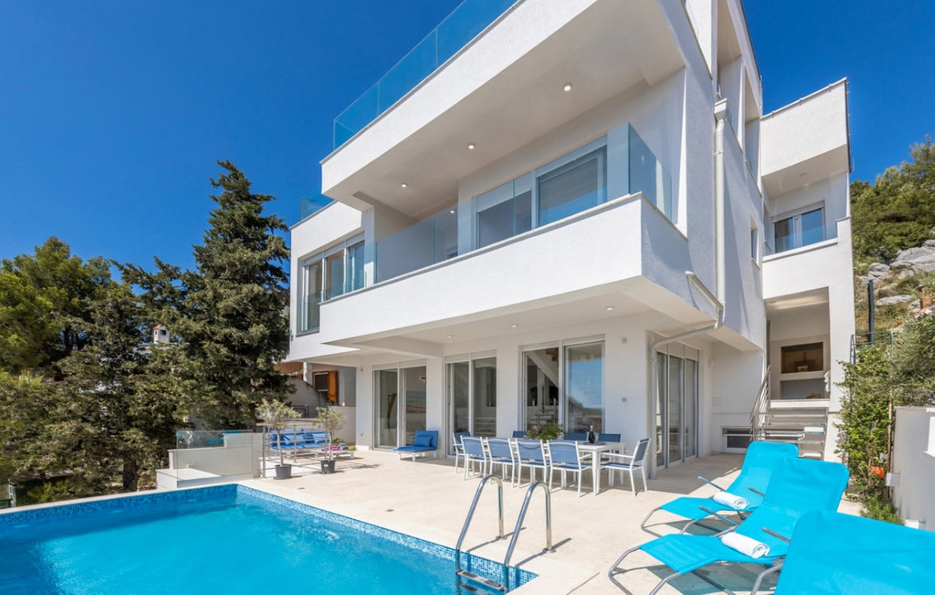 Only 100 meters from the Adriatic Sea, Villa Fleur can accommodate up to 10 guests (optimally 8). Fully air-conditioned, the villa offers a spacious living room, a modern kitchen and a dining room with enough space for ten people. The comfortable living room is equipped with a TV, sofas, coffee table and armchairs, while an additional room with an iron and a separate toilet increases the practicality of the stay.