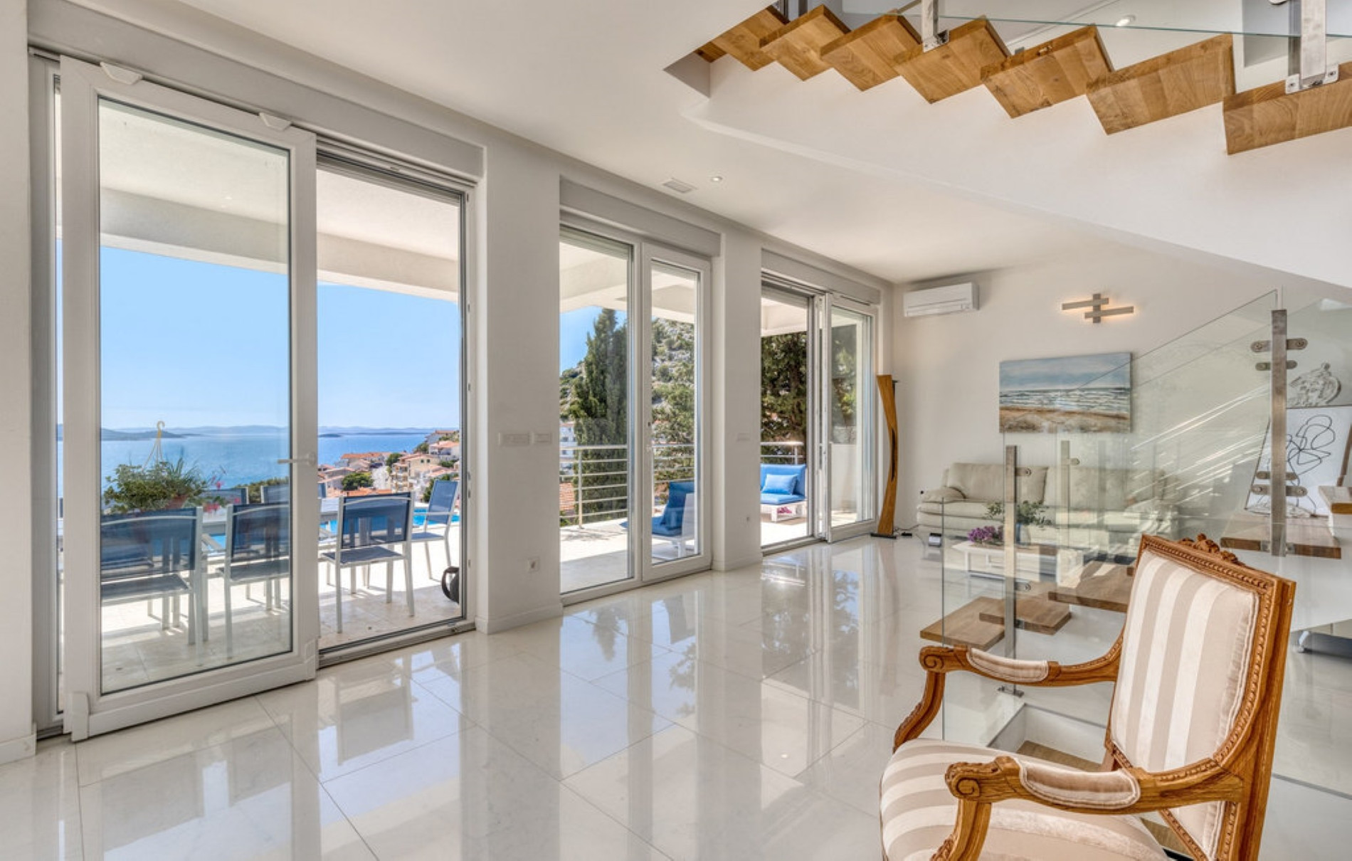 On the upper floor there are four bedrooms with double beds, each with its own bathroom and a beautiful view of the sea.