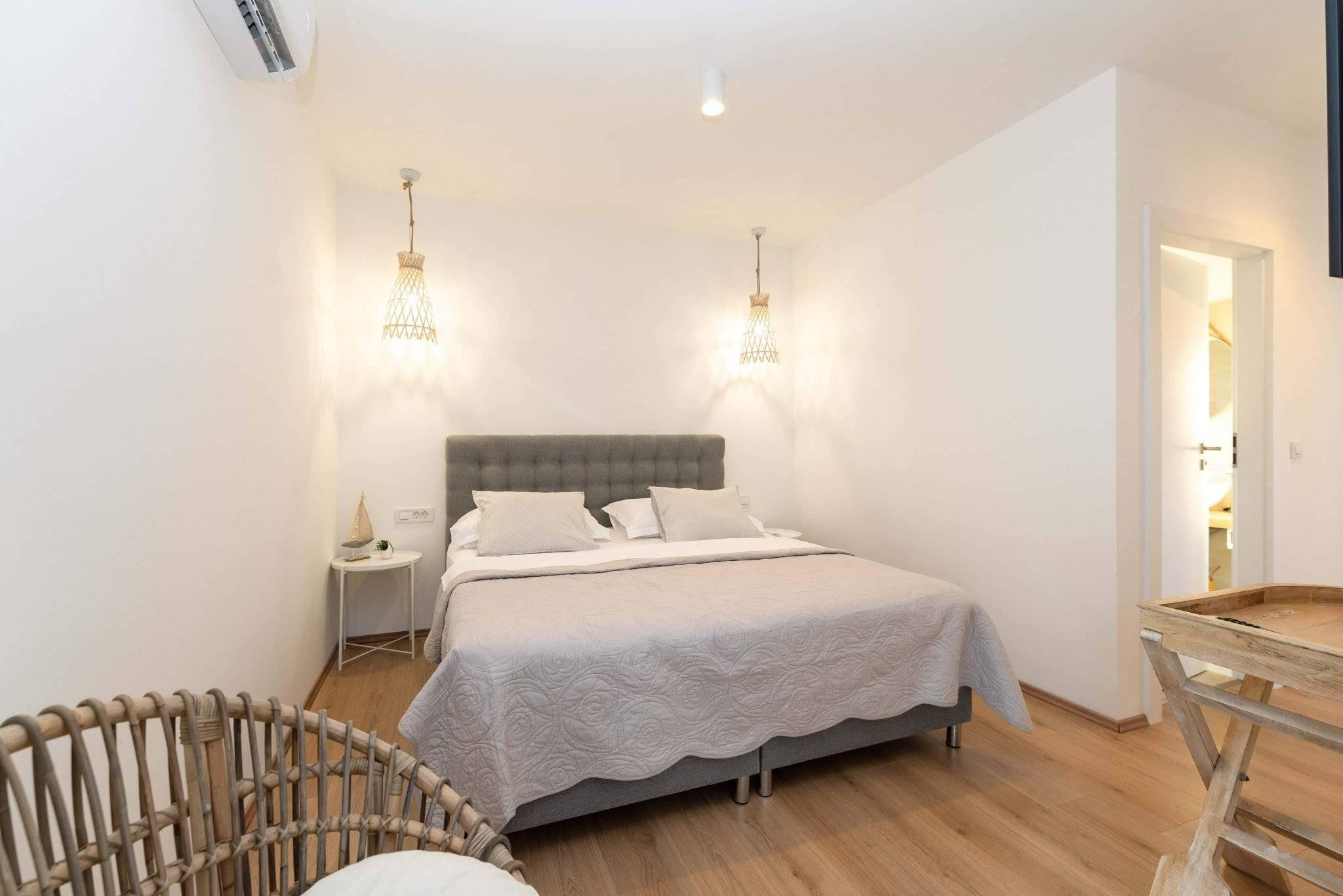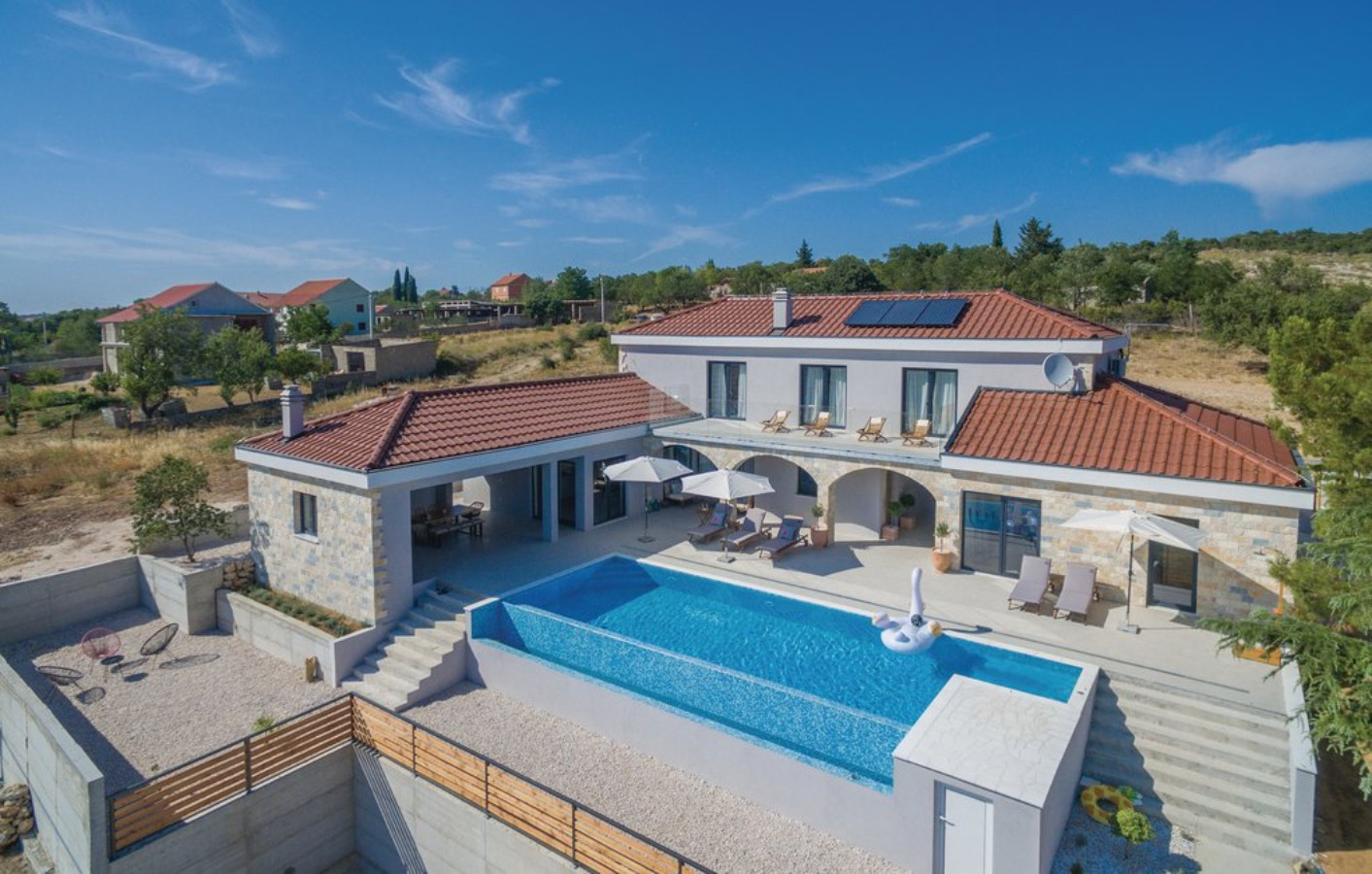 The Villa is situated on a 665 m2 property with a magnificent house of 191 m2. On it`s 3 floors, it provides communal and intimate areas. A total of 10 guests can accommodate the five bedrooms with double beds. Each of the bedrooms has an en-suite bathroom, that will allow a separate intimate space, as well as an exit to a beautiful balcony with outdoor furniture. The communal part consists of a fully equipped kitchen, dining room and living room and offers enough space for an uninterrupted gathering of family and friends. Going further in exploring this amazing space, you will find a kitchenette equipped with a seating area and a bar, to enjoy company while sipping on a glass of wine in a room inspired by dalmatian culture and décor. There are also three additional toilets throughout the Villa.