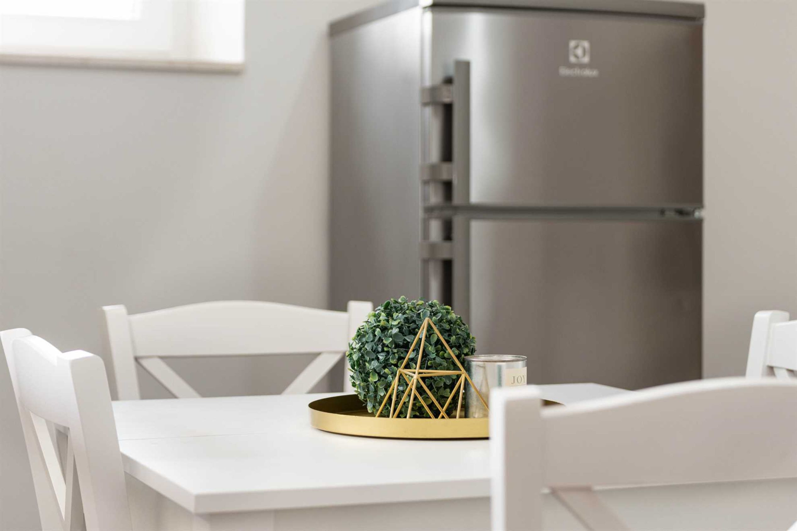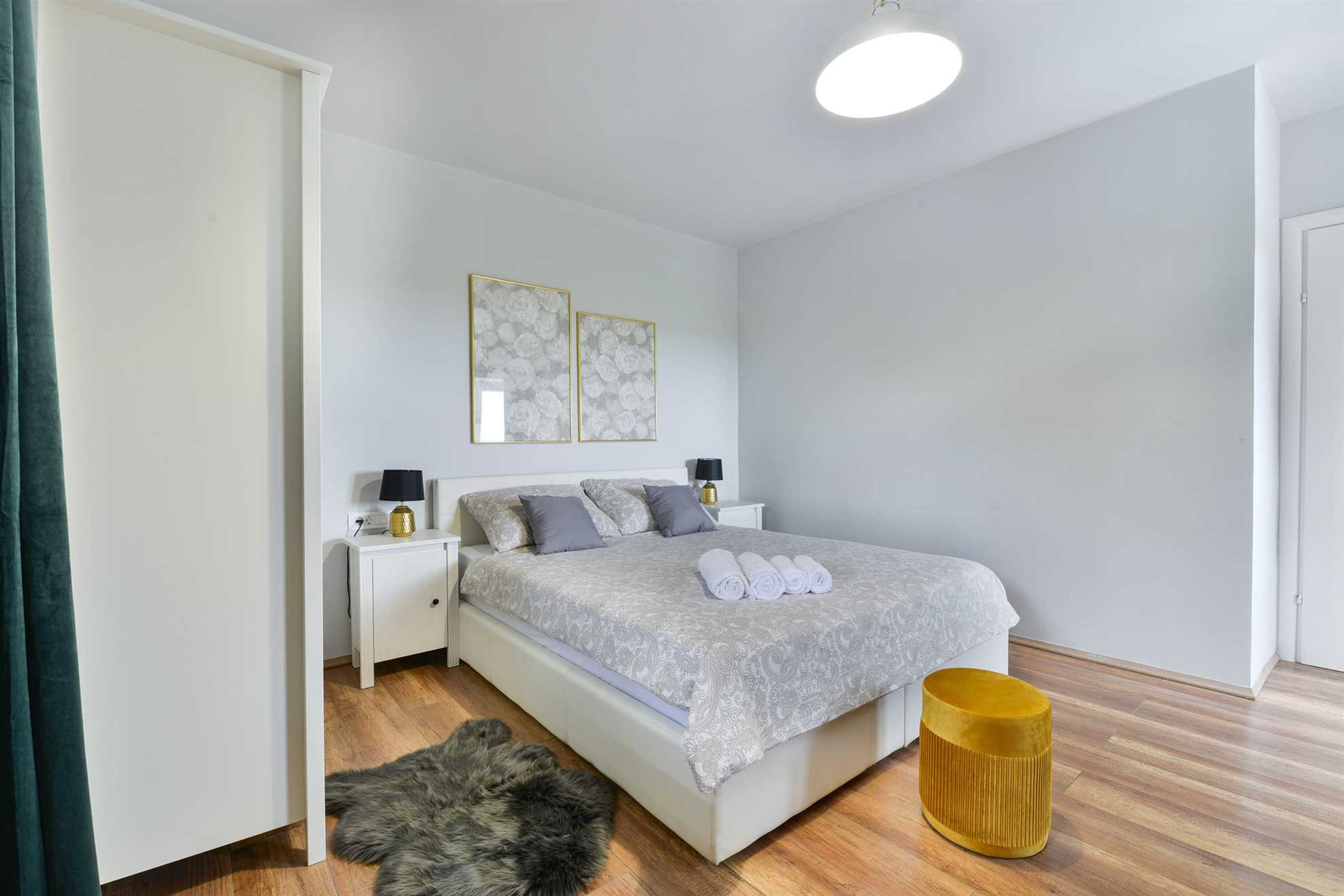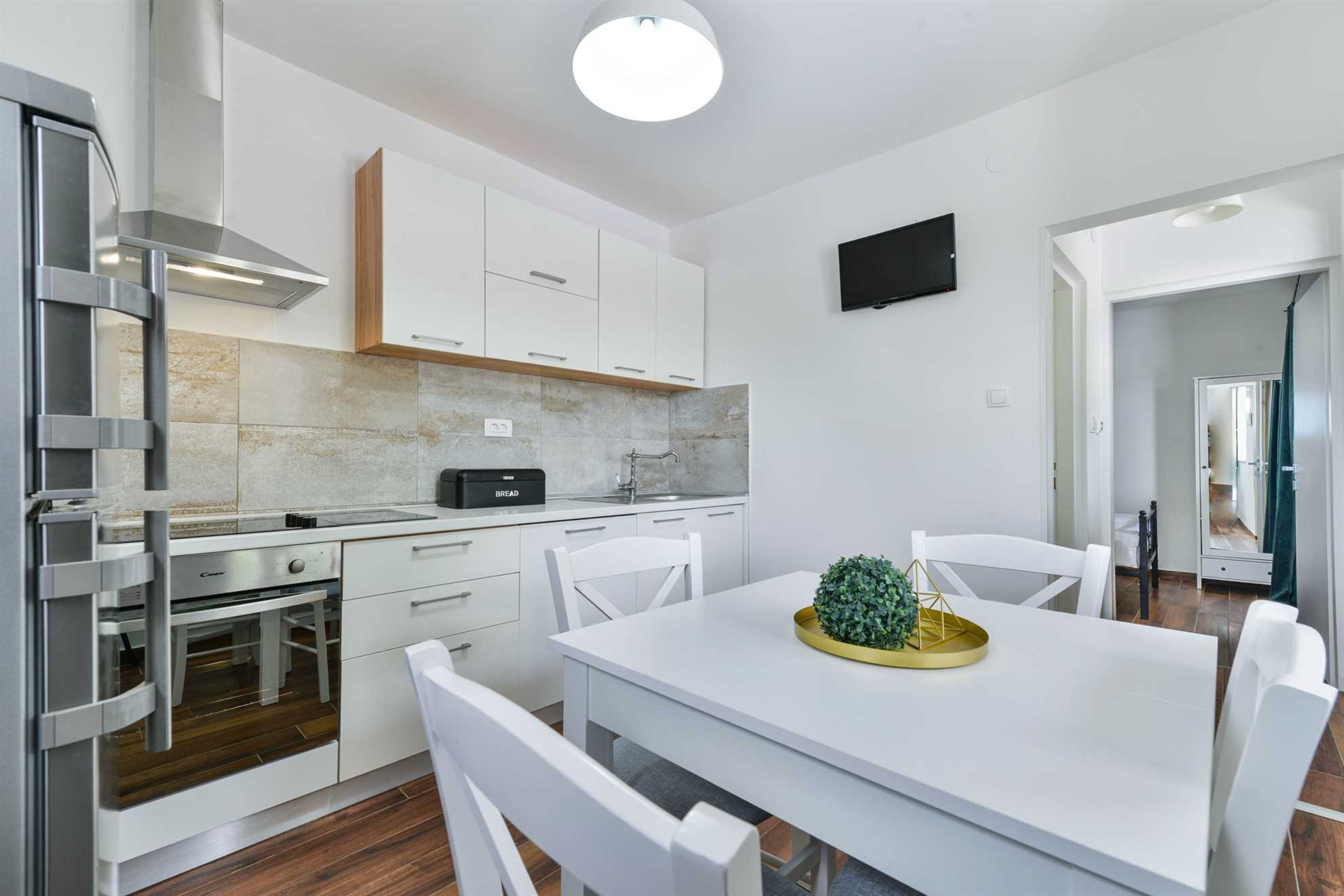 The fully equipped kitchen with high-quality appliances is connected to the dining area, perfect for morning coffee or quick meals, while the spacious living room offers an inviting place to relax and spend time together. A comfortable sofa, satellite TV and air conditioning ensure a pleasant atmosphere throughout the day.