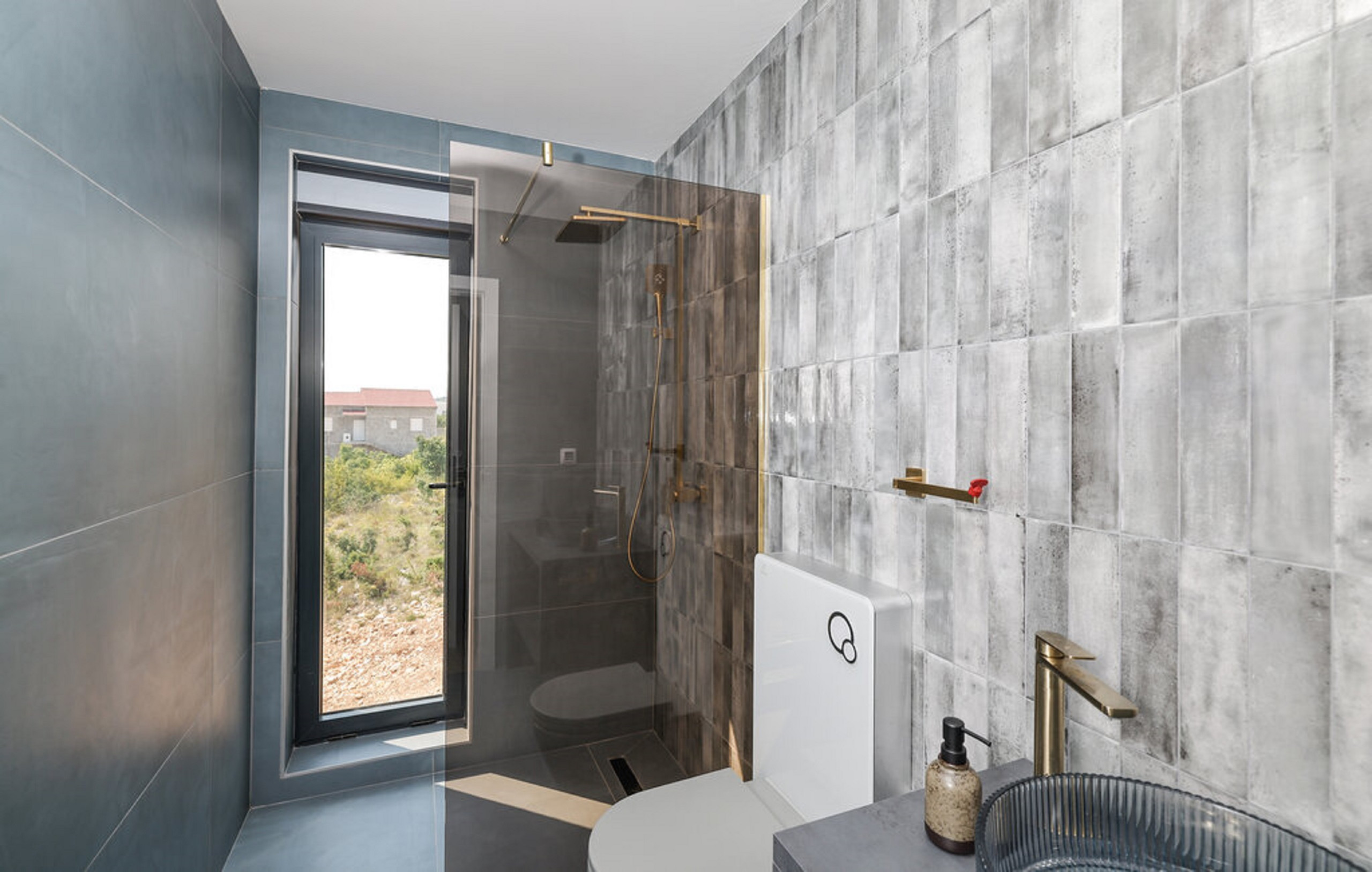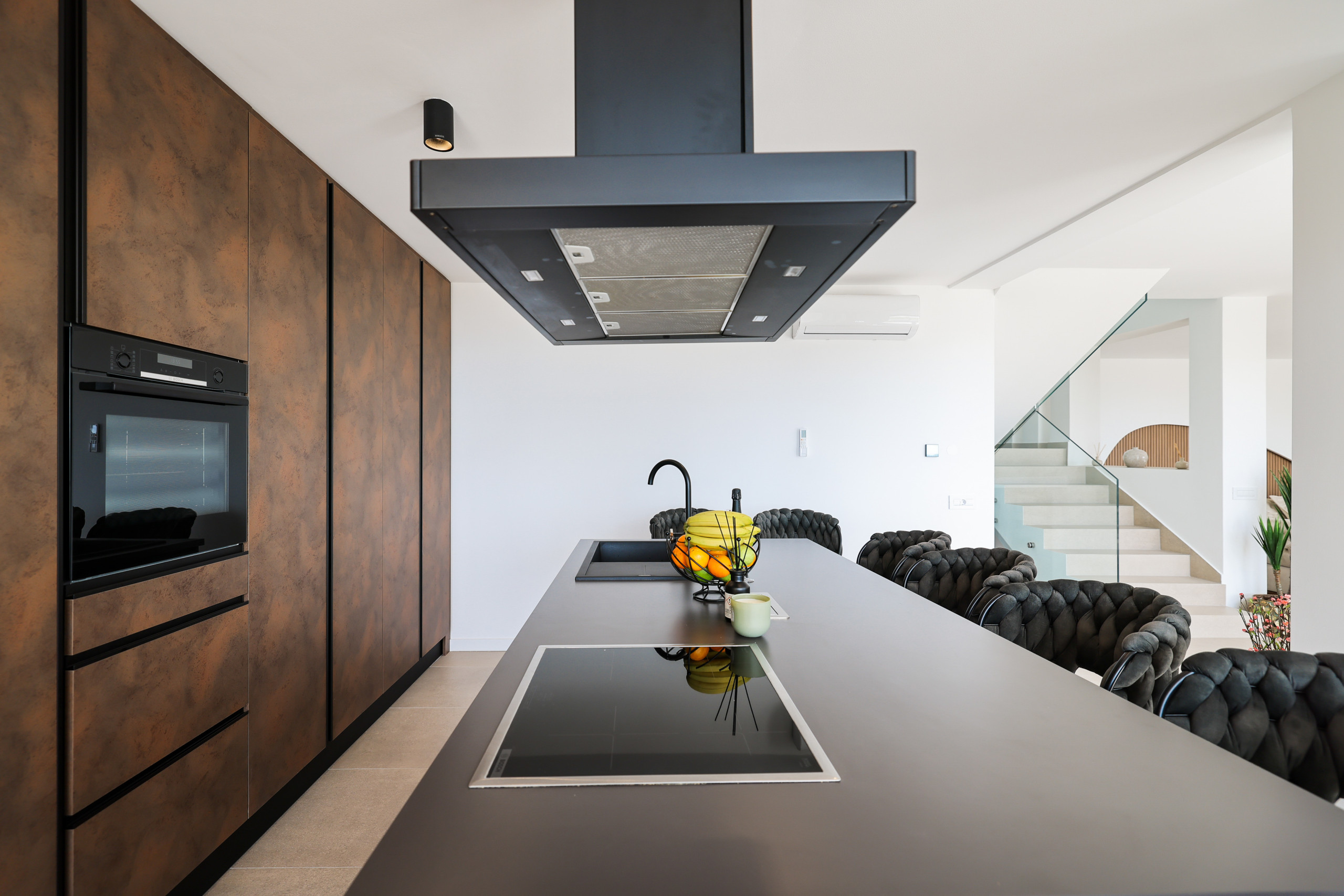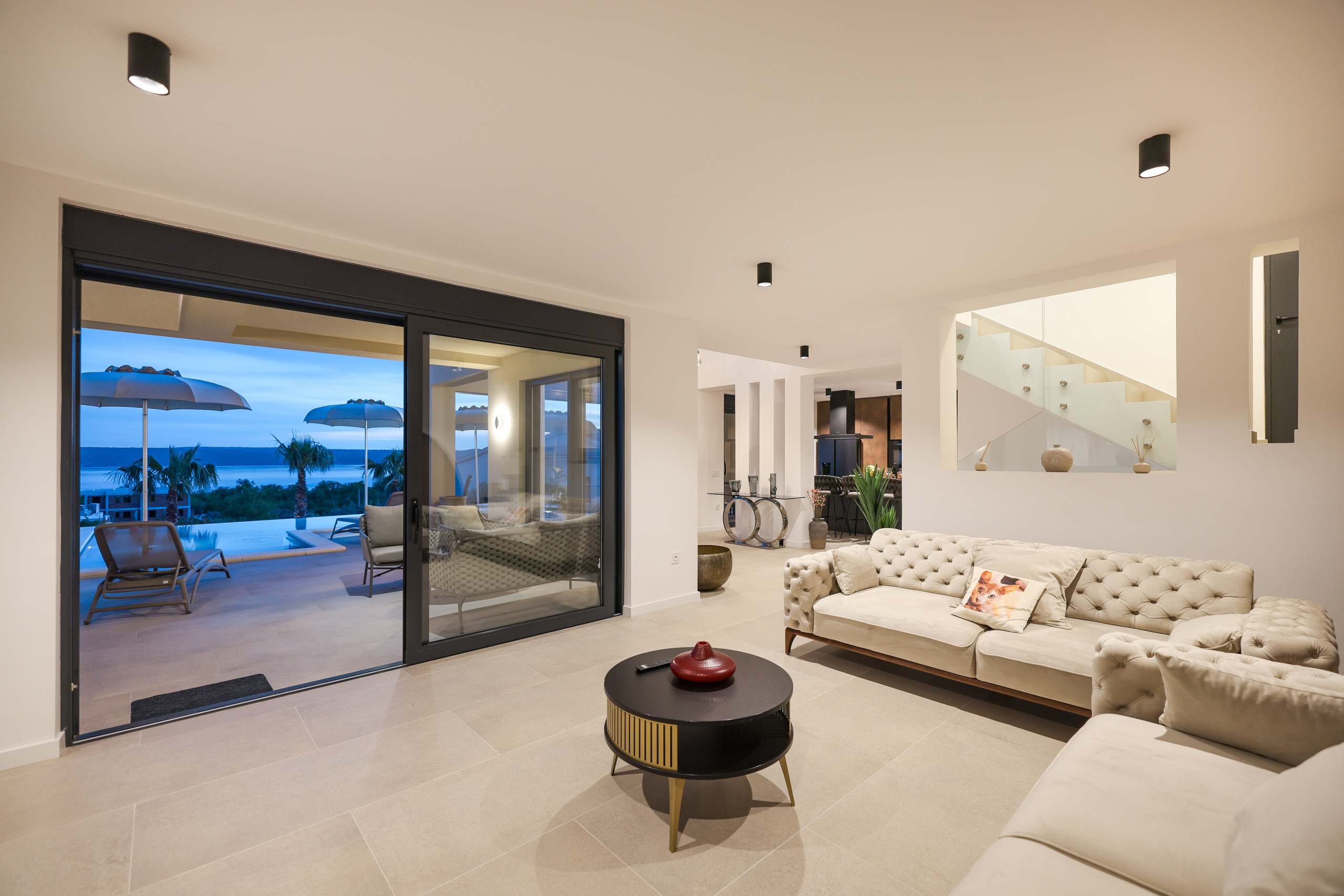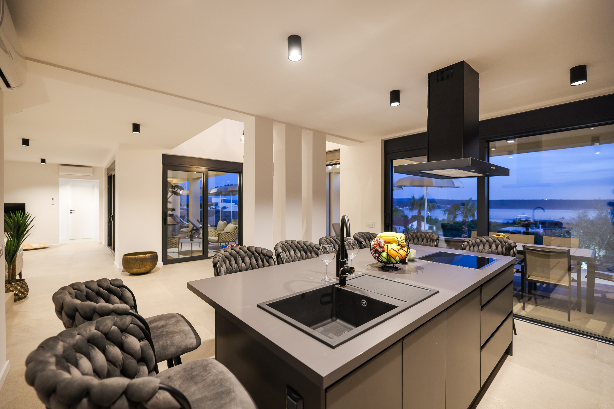On the first floor are all the bedrooms, two of which have access to a balcony with a mesmerizing sea view. Every detail of the interior has been carefully designed in a sophisticated industrial style, which perfectly complements the modern exterior of the villa.