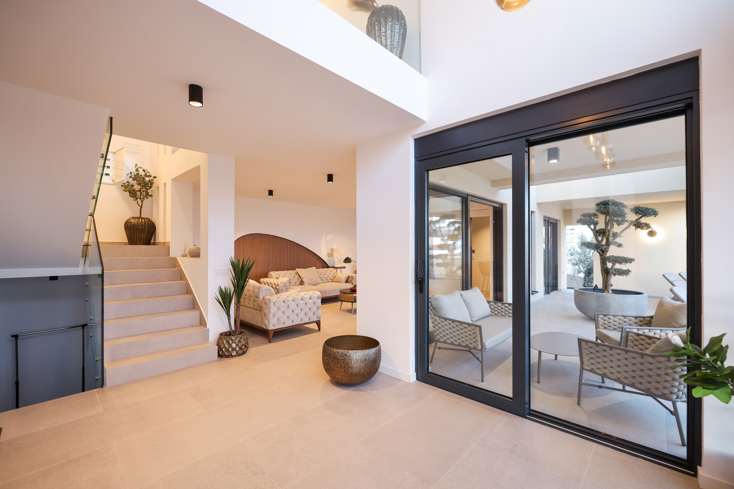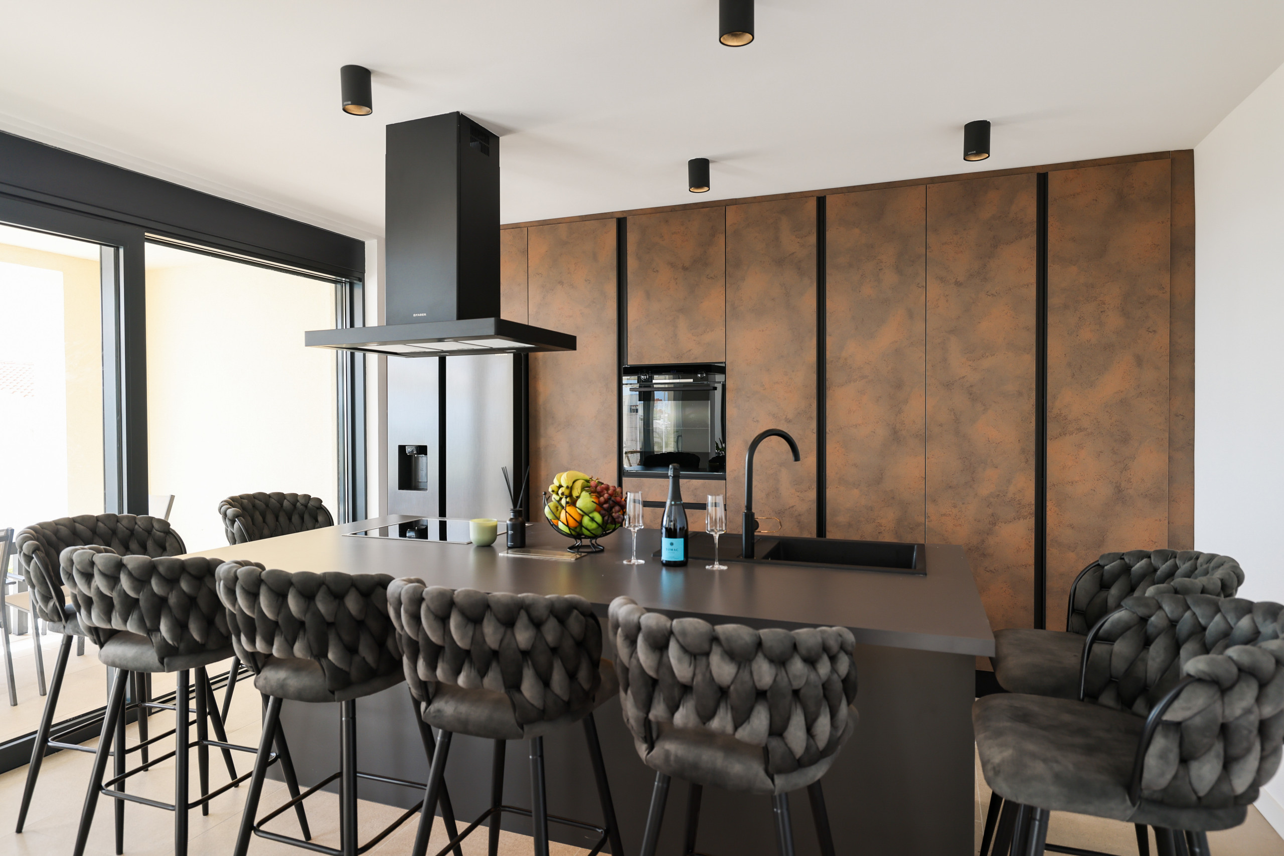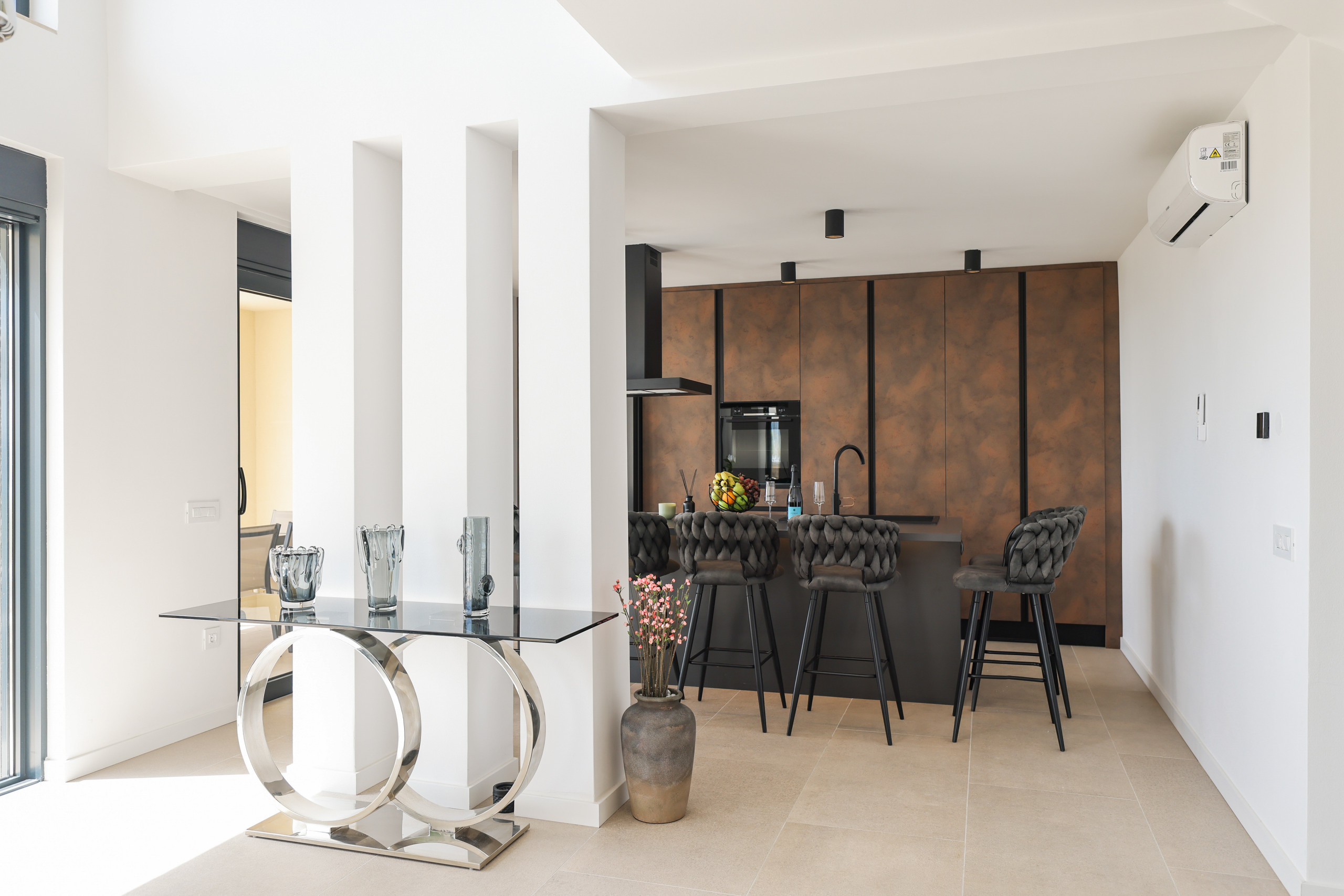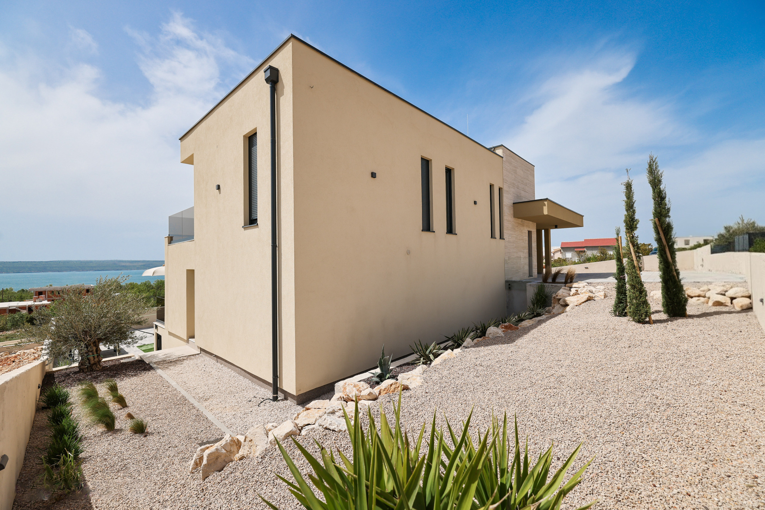On the first floor are all the bedrooms, two of which have access to a balcony with a mesmerizing sea view. Every detail of the interior has been carefully designed in a sophisticated industrial style, which perfectly complements the modern exterior of the villa.