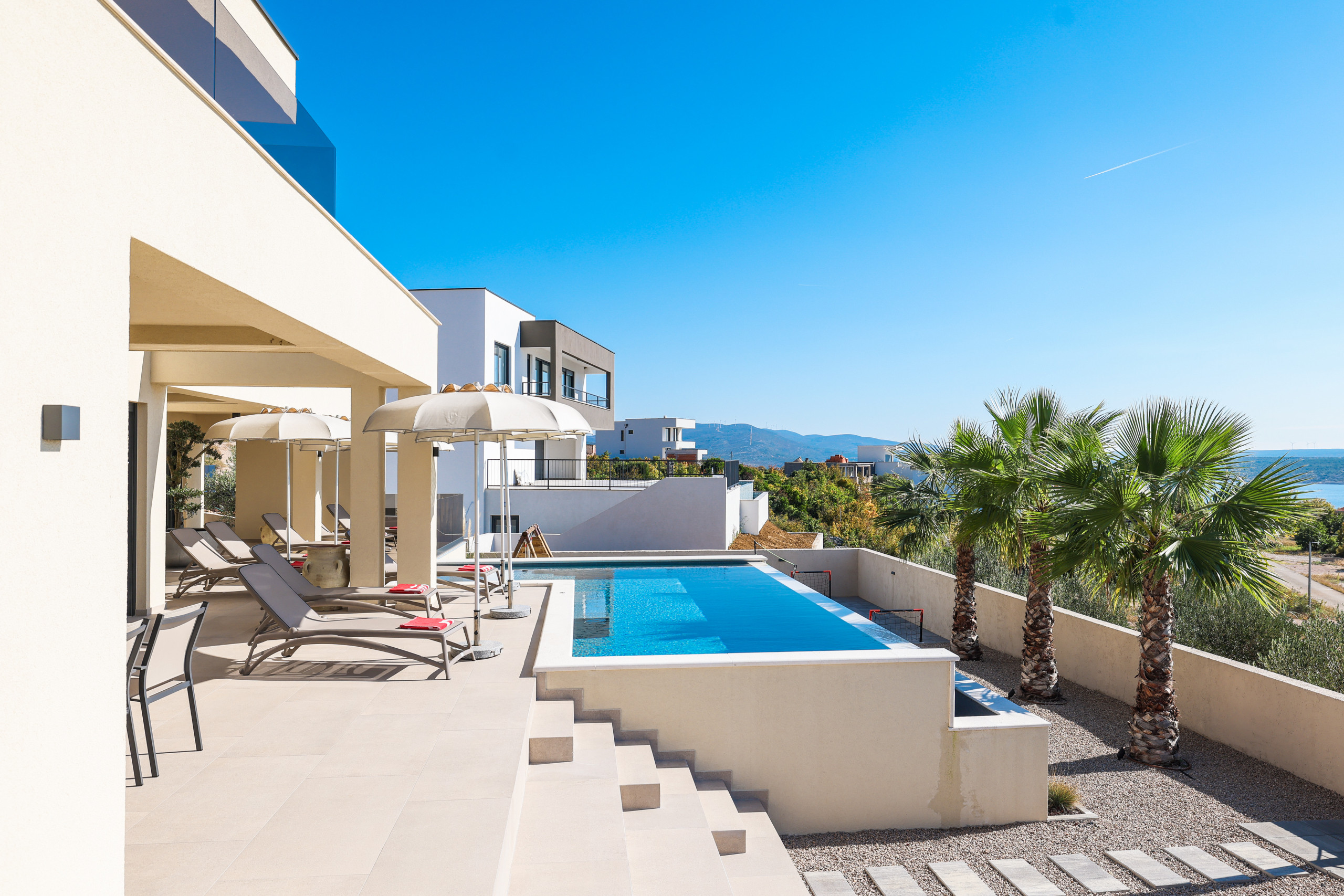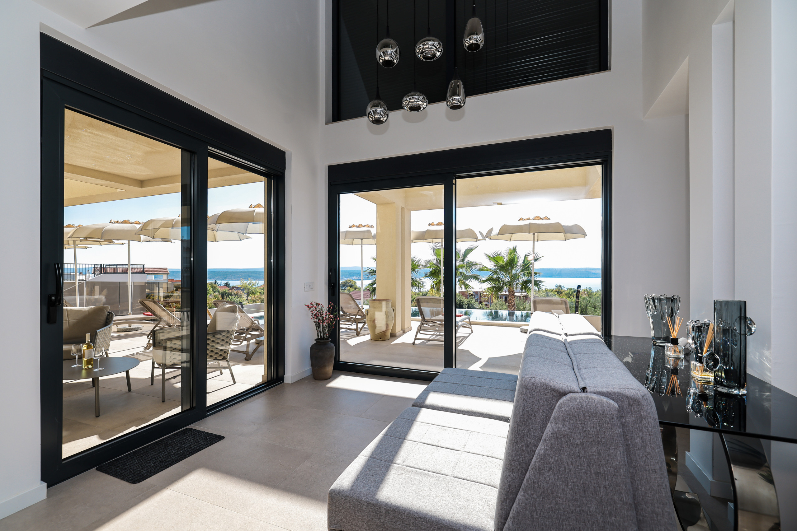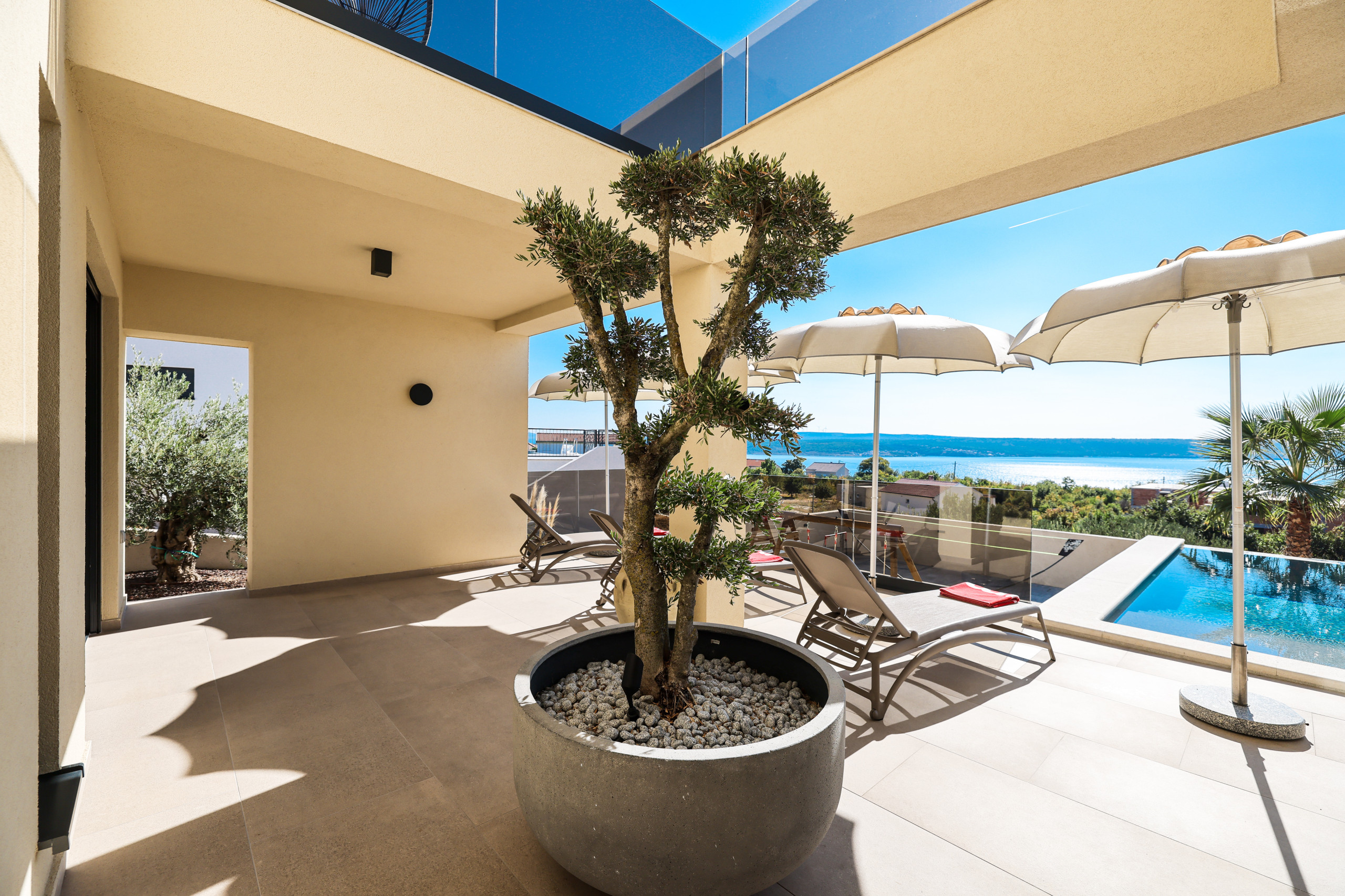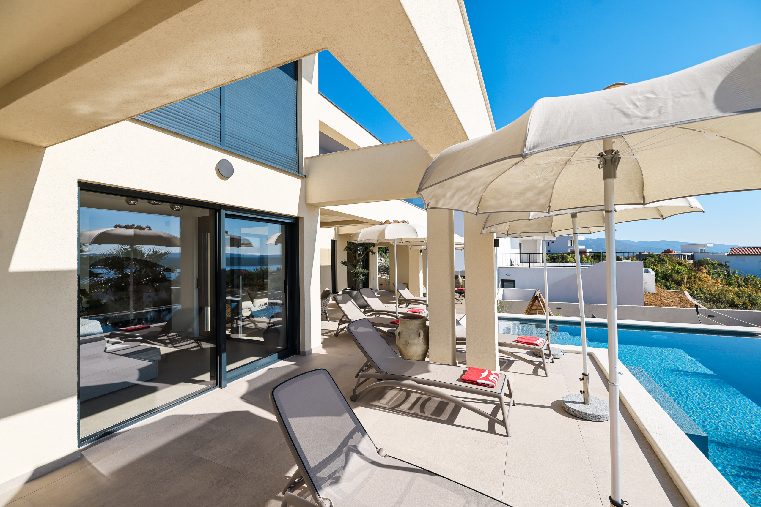 The villa Novue can accommodate up to 10 people, it is ideal for larger families or groups of friends. It contains four spacious bedrooms, each equipped with comfortable double beds and a private bathroom with shower. In the living room there is a large sofa that can be used as an extra bed for two people, providing additional flexibility in accommodating guests.