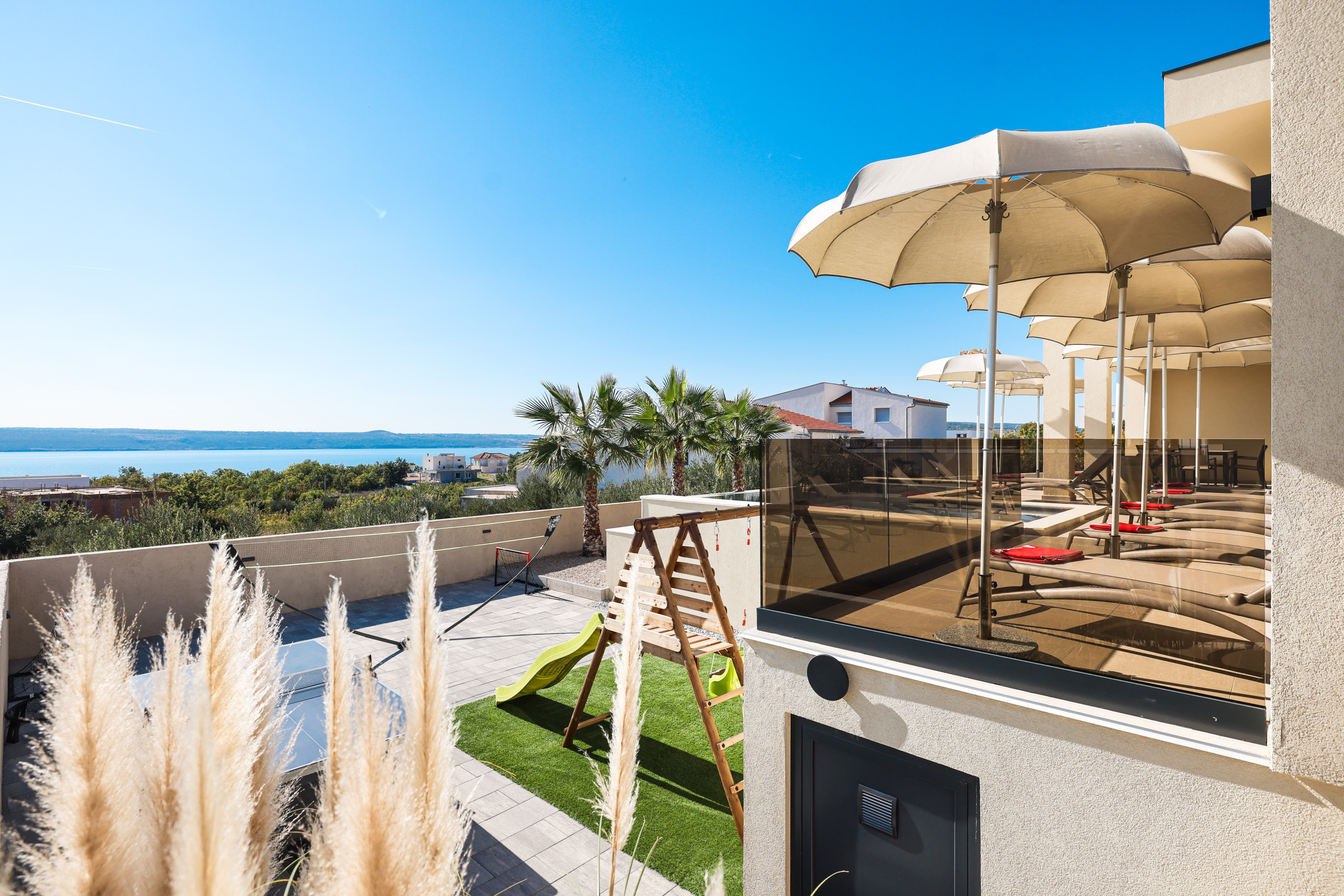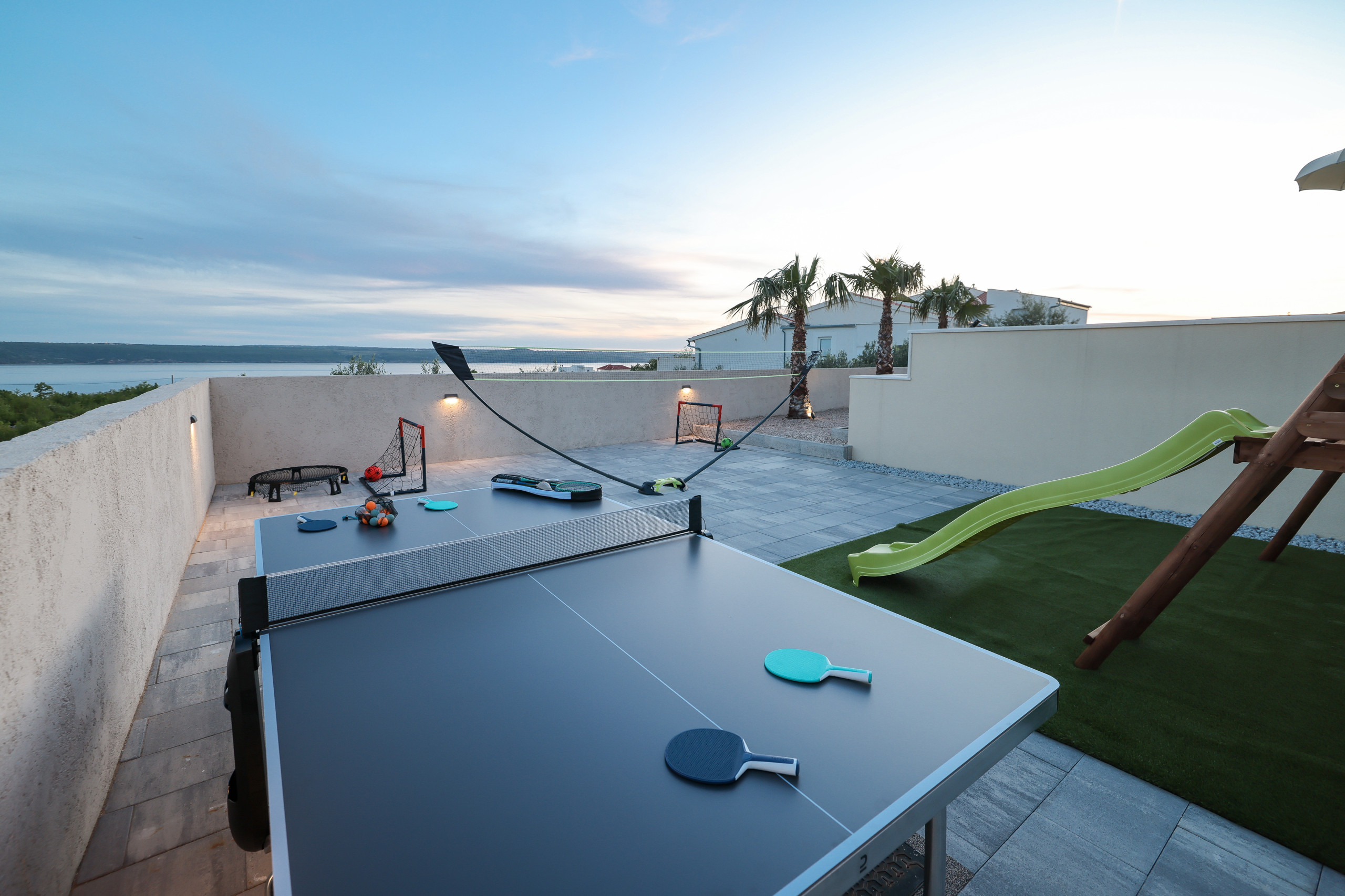 In the yard there is a heated swimming pool of 40 m², surrounded by sunbeds and umbrellas, perfect for relaxing and sunbathing. Next to the pool is a spacious terrace, ideal for hanging out outdoors and enjoying warm summer evenings. The yard offers a beautiful view of the sea. Children will love the play area, which includes a badminton net, playhouse and soccer goals.