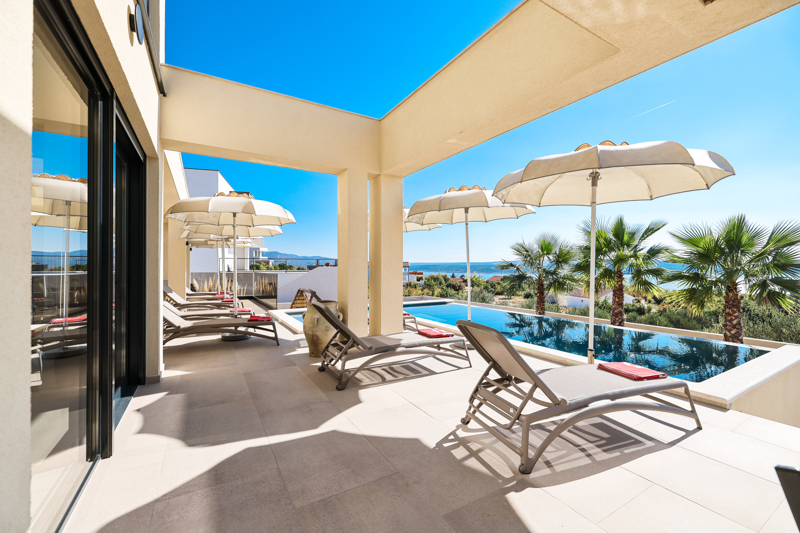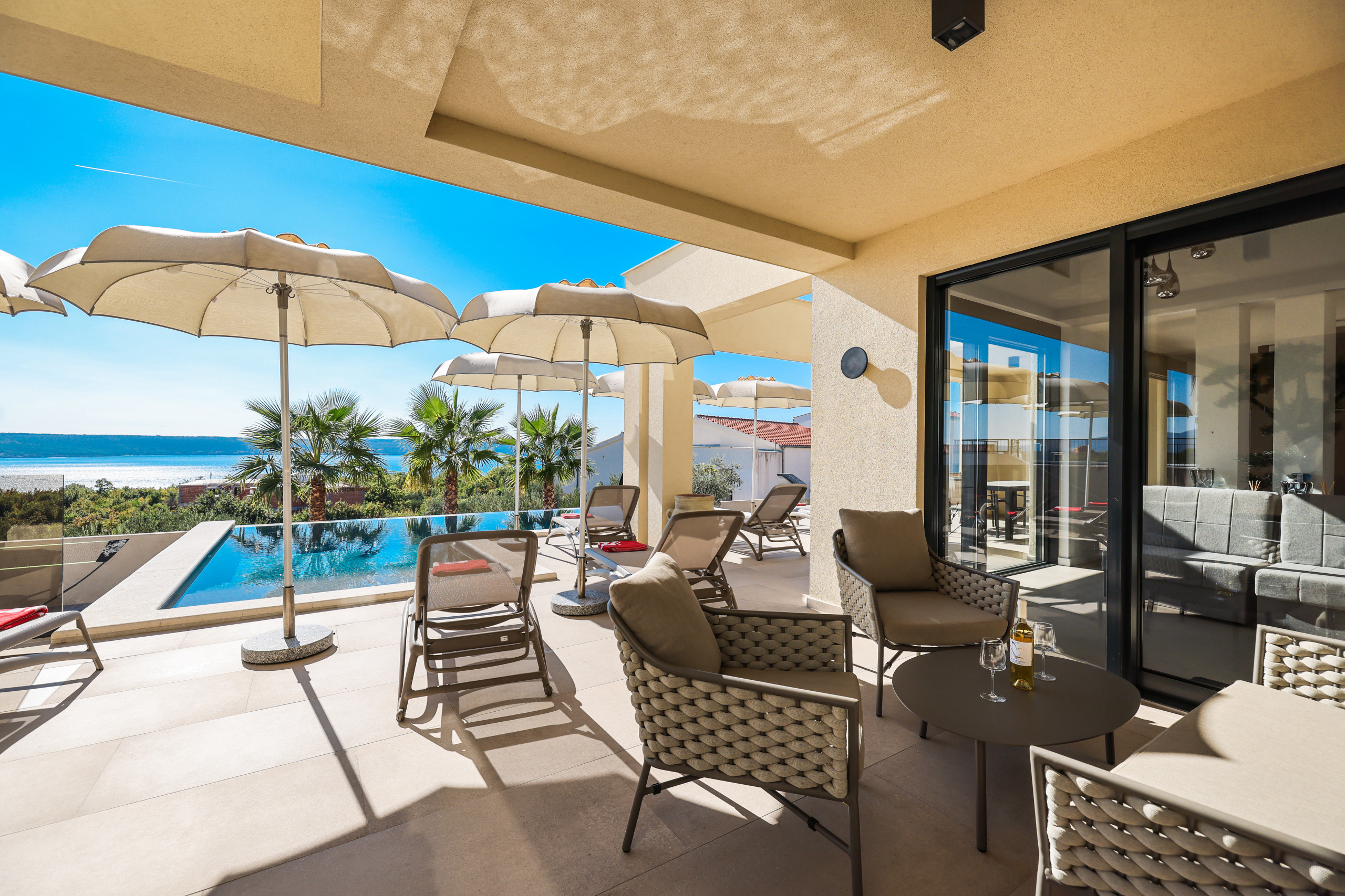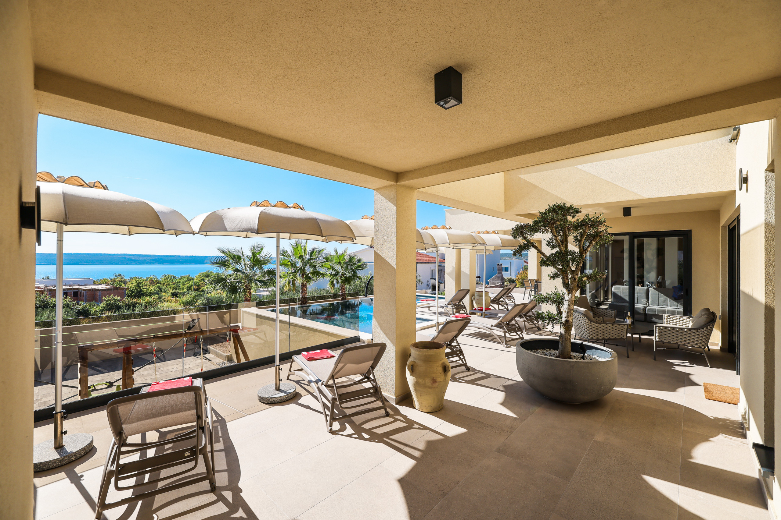 The proximity to the sea, the view from the terraces and the elegance of every corner of this villa guarantee an unforgettable vacation full of luxury and relaxation.