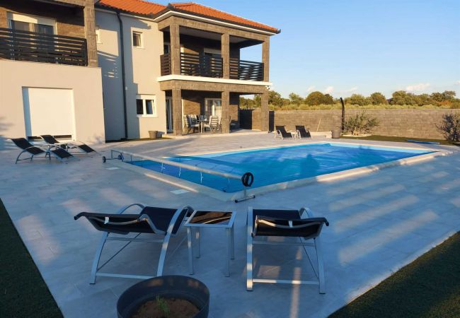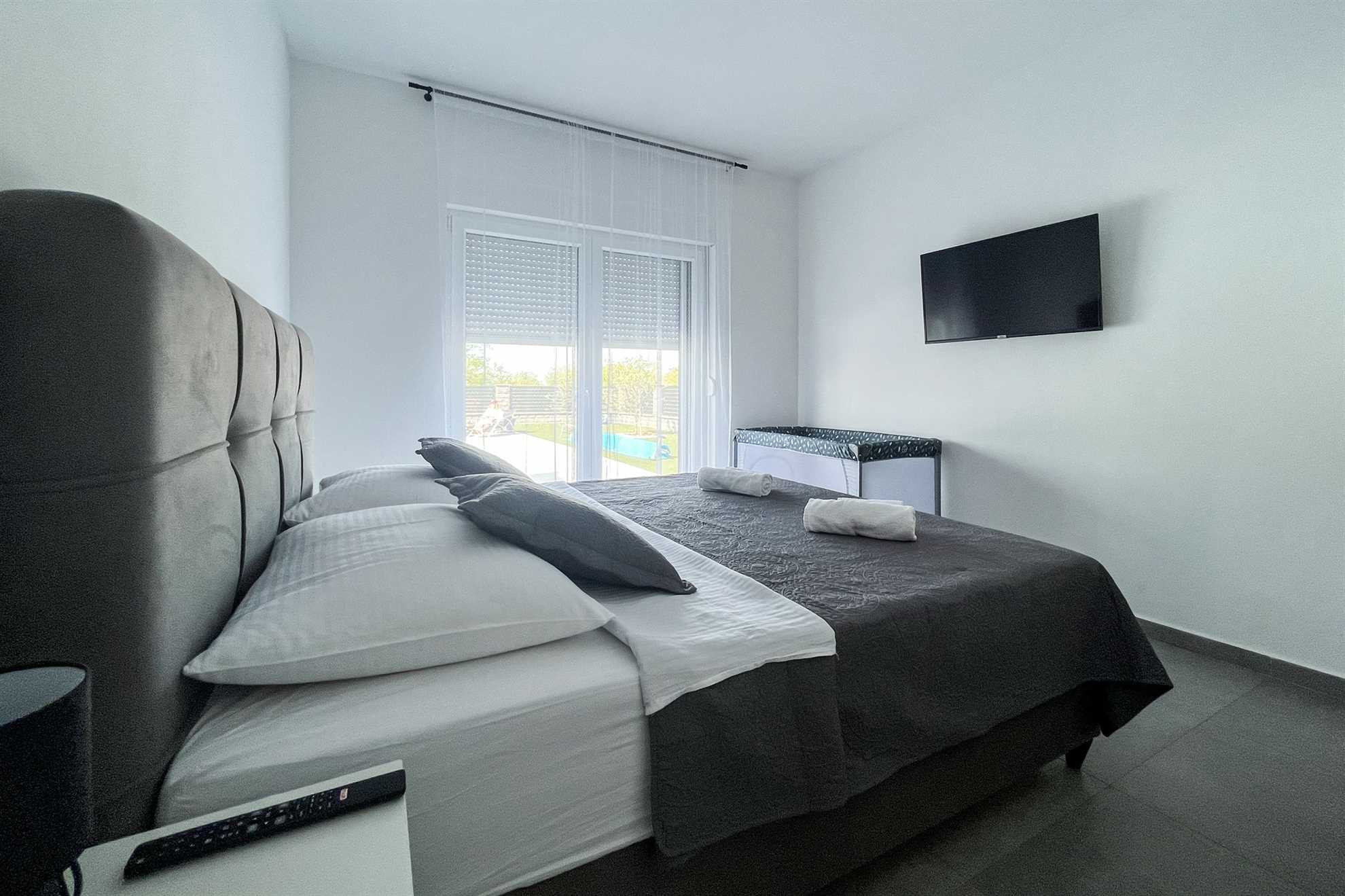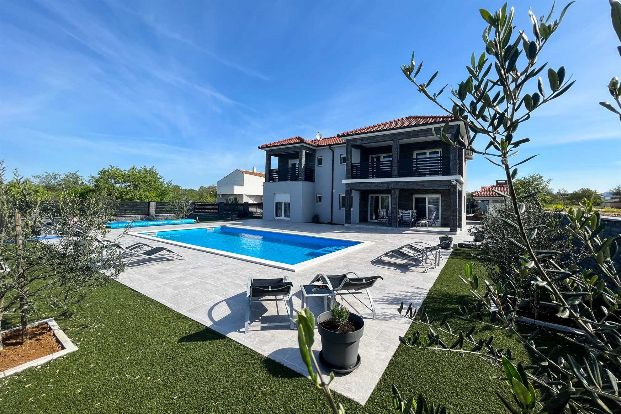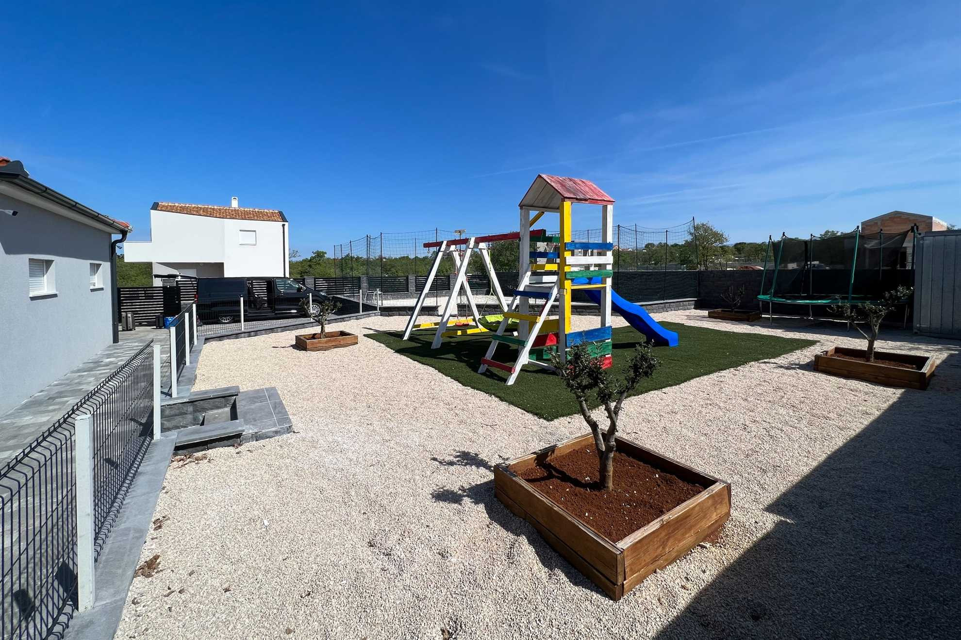 Located in the peaceful village of Murvica, just a few minutes’ drive from historic Zadar, this beautiful and spacious villa provides the perfect retreat for relaxation, fun and making unforgettable memories. With a spacious garden of 1,114 m², the villa offers complete privacy and comfort for up to 12 guests in four elegantly decorated double bedrooms, each with its own modern bathroom. Enjoy cooking in the fully equipped open-plan kitchen, sharing meals in the cozy dining room or relaxing in the contemporary living room that leads directly to the terrace – ideal for your first morning coffee with the sounds of nature. The outdoor area delights with a large heated swimming pool, modern sun loungers, Mediterranean greenery and a top-notch BBQ station with a covered dining area – perfect for enjoying delicious meals with family and friends. Additional magic is added to the stay by numerous entertainment facilities: a basketball court, an outdoor children’s playground, as well as an indoor area with table tennis, billiards and darts, which guarantee hours of laughter and socializing. Surrounded by a quiet family neighborhood, this villa provides the ideal blend of luxury, comfort, and fun for all generations.