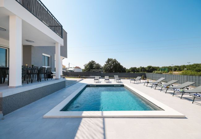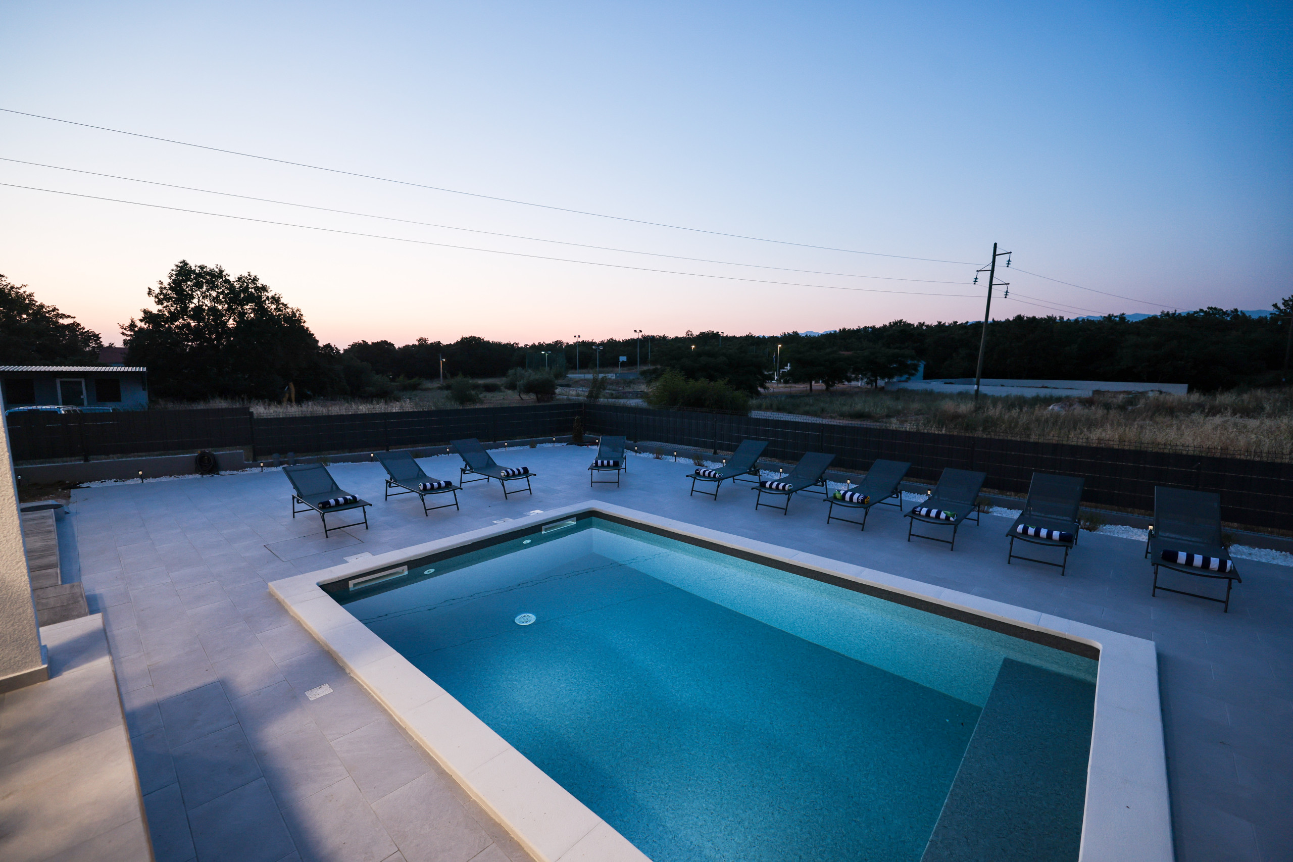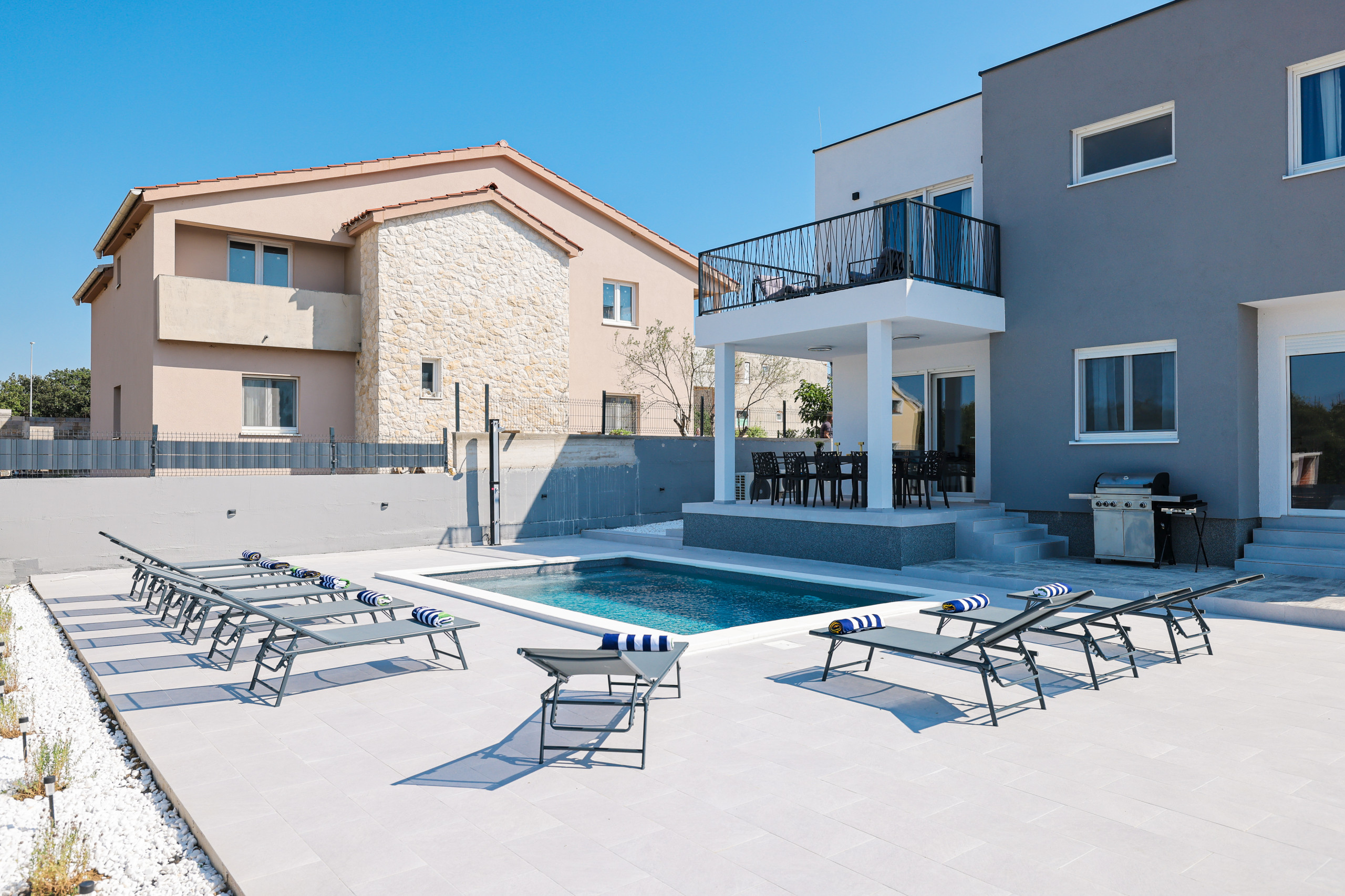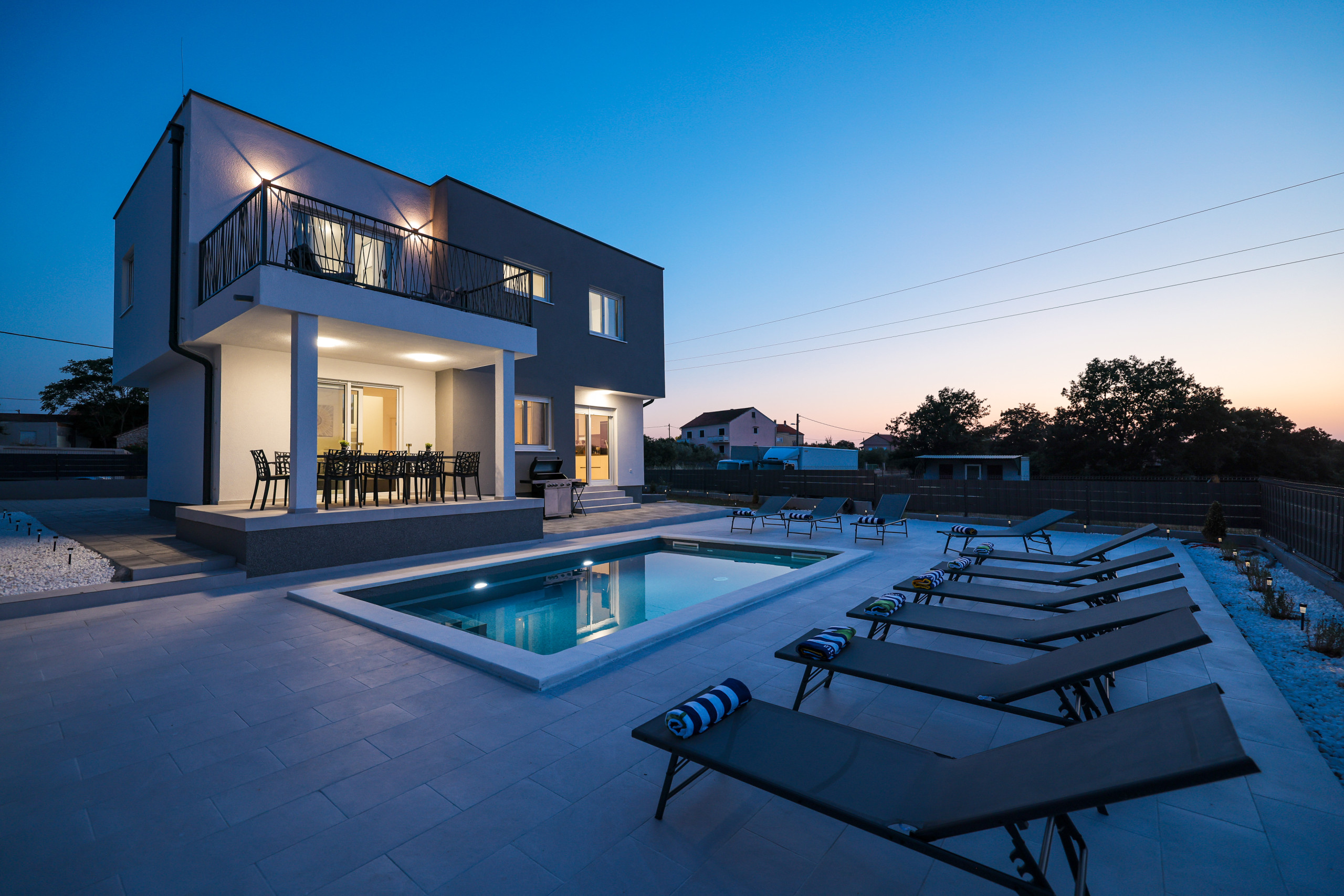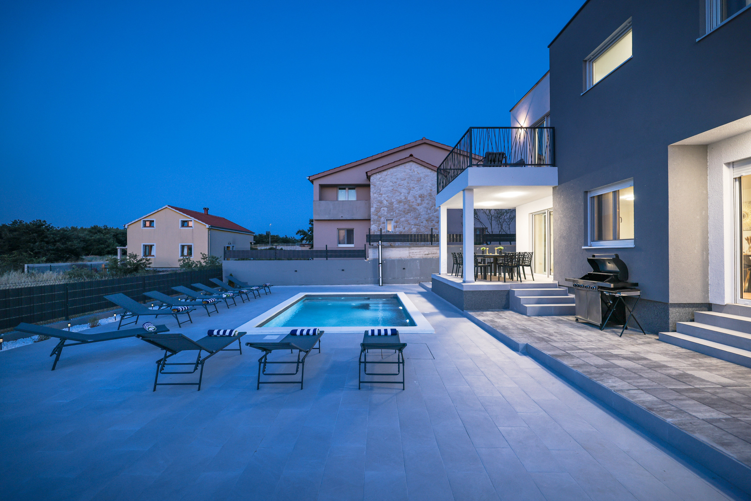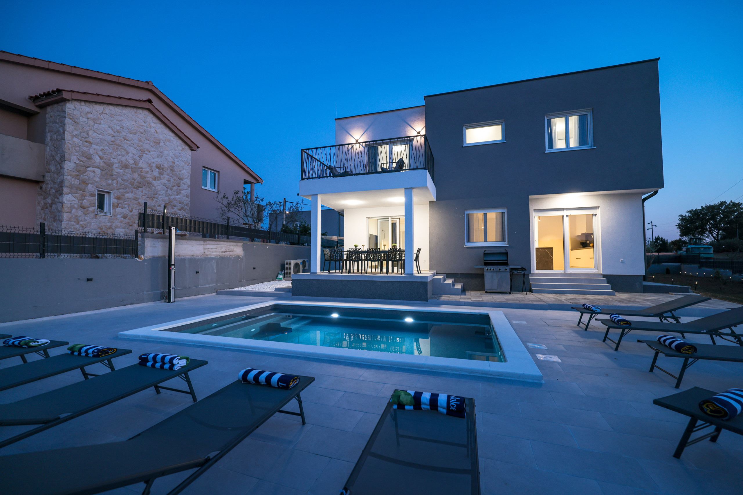 Located in the peaceful village of Murvica, just a few minutes’ drive from historic Zadar, this beautiful and spacious villa provides the perfect retreat for relaxation, fun and making unforgettable memories. With a spacious garden of 1,114 m², the villa offers complete privacy and comfort for up to 12 guests in four elegantly decorated double bedrooms, each with its own modern bathroom. Enjoy cooking in the fully equipped open-plan kitchen, sharing meals in the cozy dining room or relaxing in the contemporary living room that leads directly to the terrace – ideal for your first morning coffee with the sounds of nature. The outdoor area delights with a large heated swimming pool, modern sun loungers, Mediterranean greenery and a top-notch BBQ station with a covered dining area – perfect for enjoying delicious meals with family and friends. Additional magic is added to the stay by numerous entertainment facilities: a basketball court, an outdoor children’s playground, as well as an indoor area with table tennis, billiards and darts, which guarantee hours of laughter and socializing. Surrounded by a quiet family neighborhood, this villa provides the ideal blend of luxury, comfort, and fun for all generations.