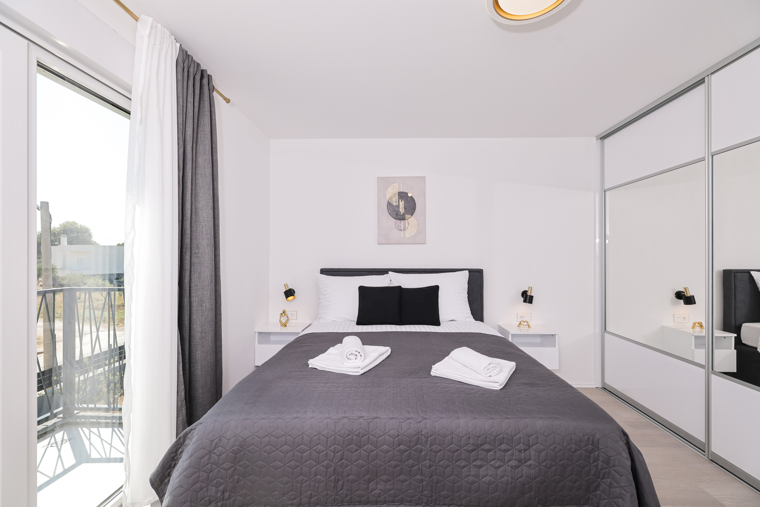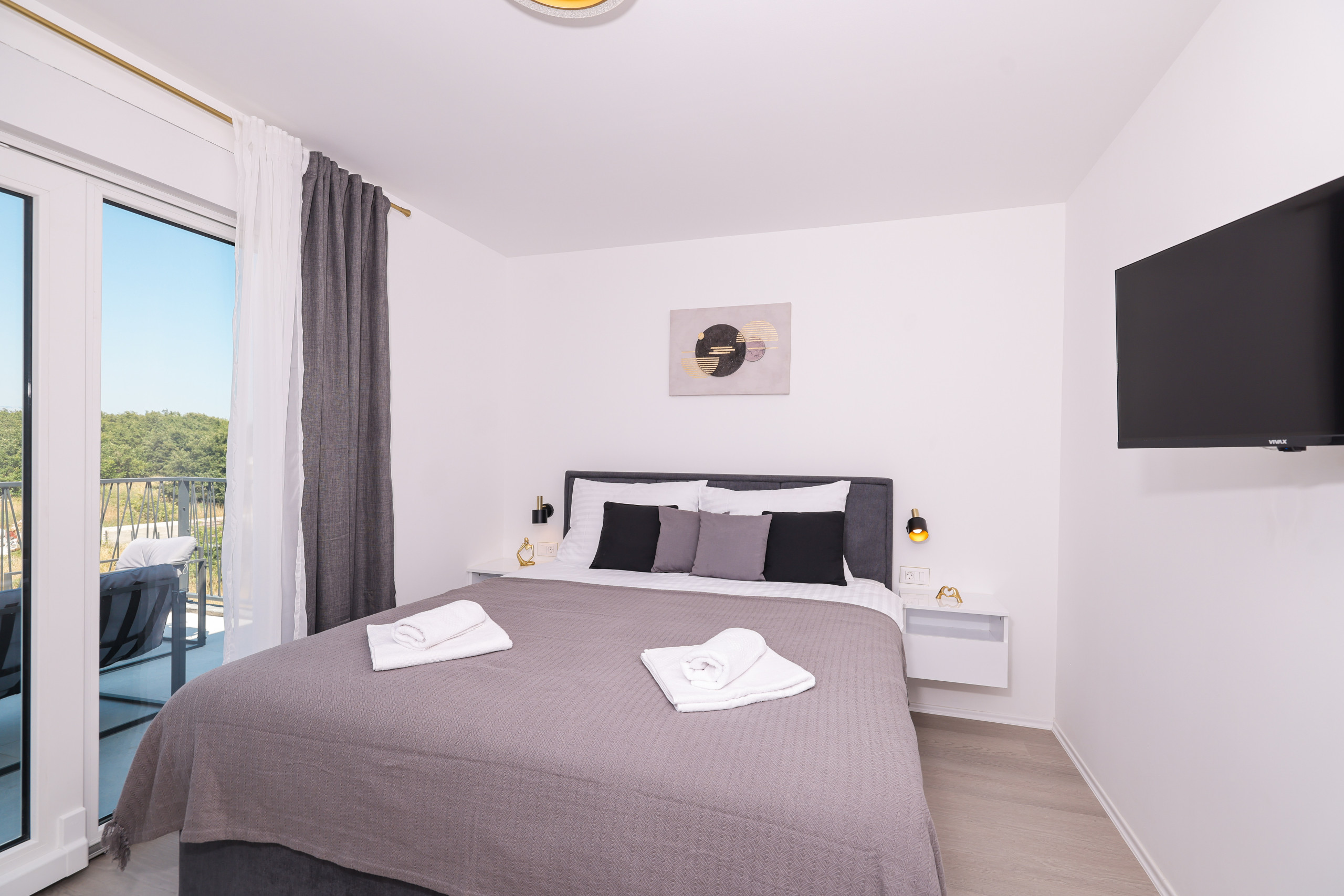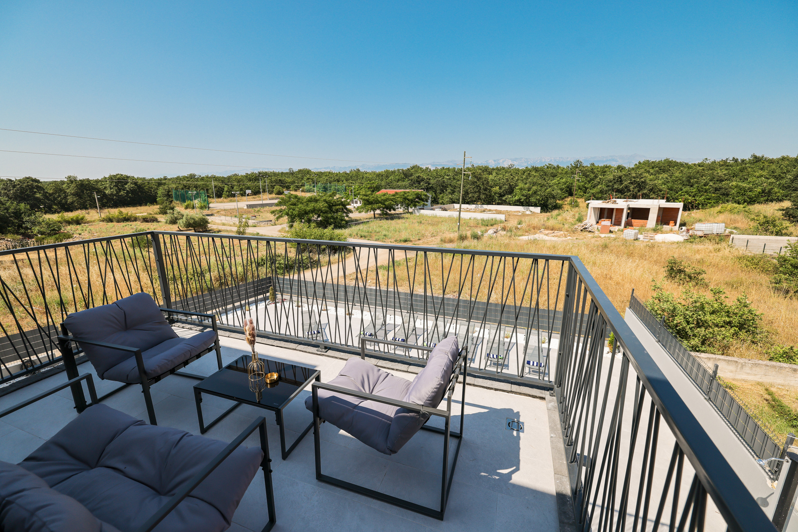 The villa accommodates up to 9 guests in 4 spacious bedrooms with comfortable double beds, with an additional sleeping option on the living room sofa. One bedroom has direct access to a balcony with a seating area, perfect for morning coffee or relaxing evenings.