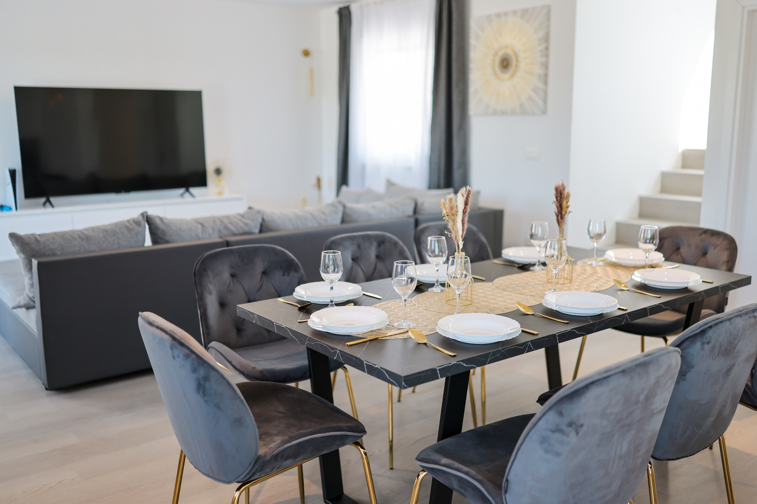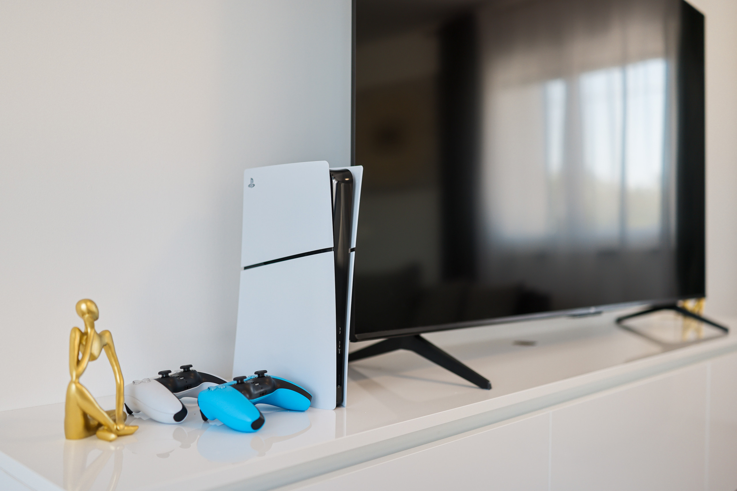 The fully equipped modern kitchen provides everything needed for meal preparation, while the living room features a Smart TV with satellite channels and a PlayStation 5 for entertainment.