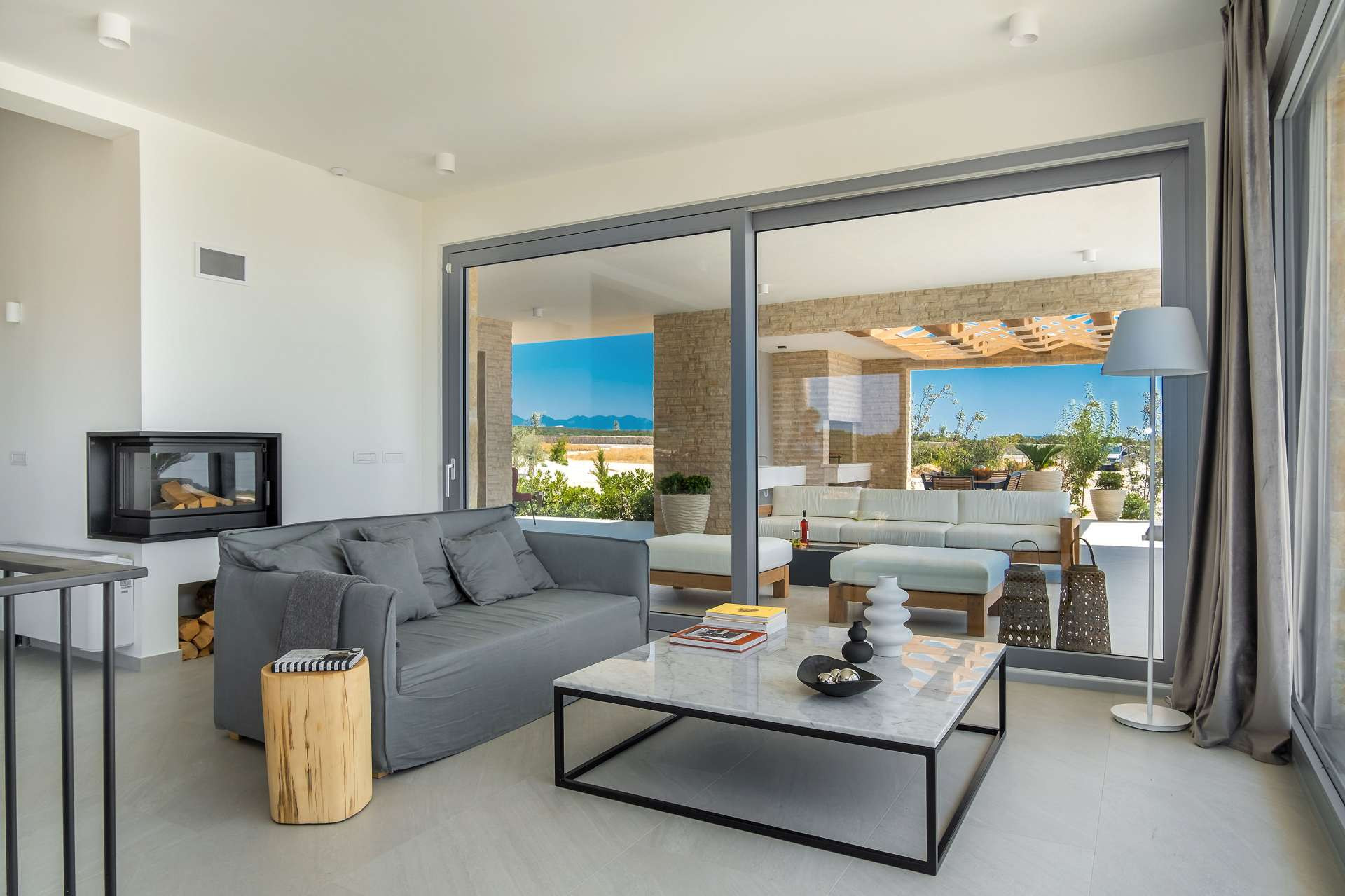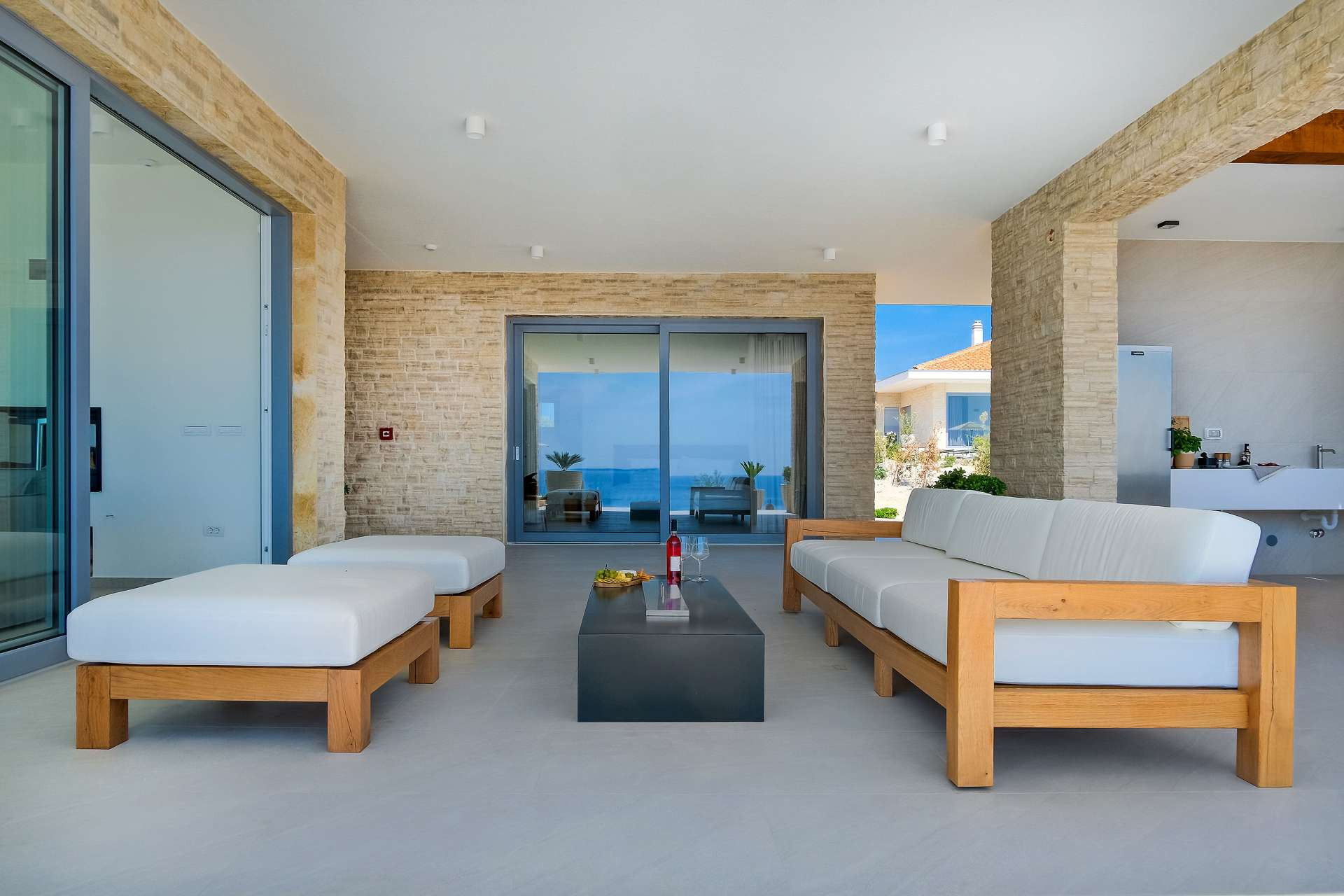This spacious, modern single-storey villa radiates elegance and comfort. It features four stylish bedrooms (three with double beds and one single room), a bright open-plan living area, and a fully equipped kitchen with a dining space designed for shared moments. Floor-to-ceiling glass walls open onto the expansive terrace, seamlessly blending indoor and outdoor living while framing uninterrupted sea views stretching to the horizon.