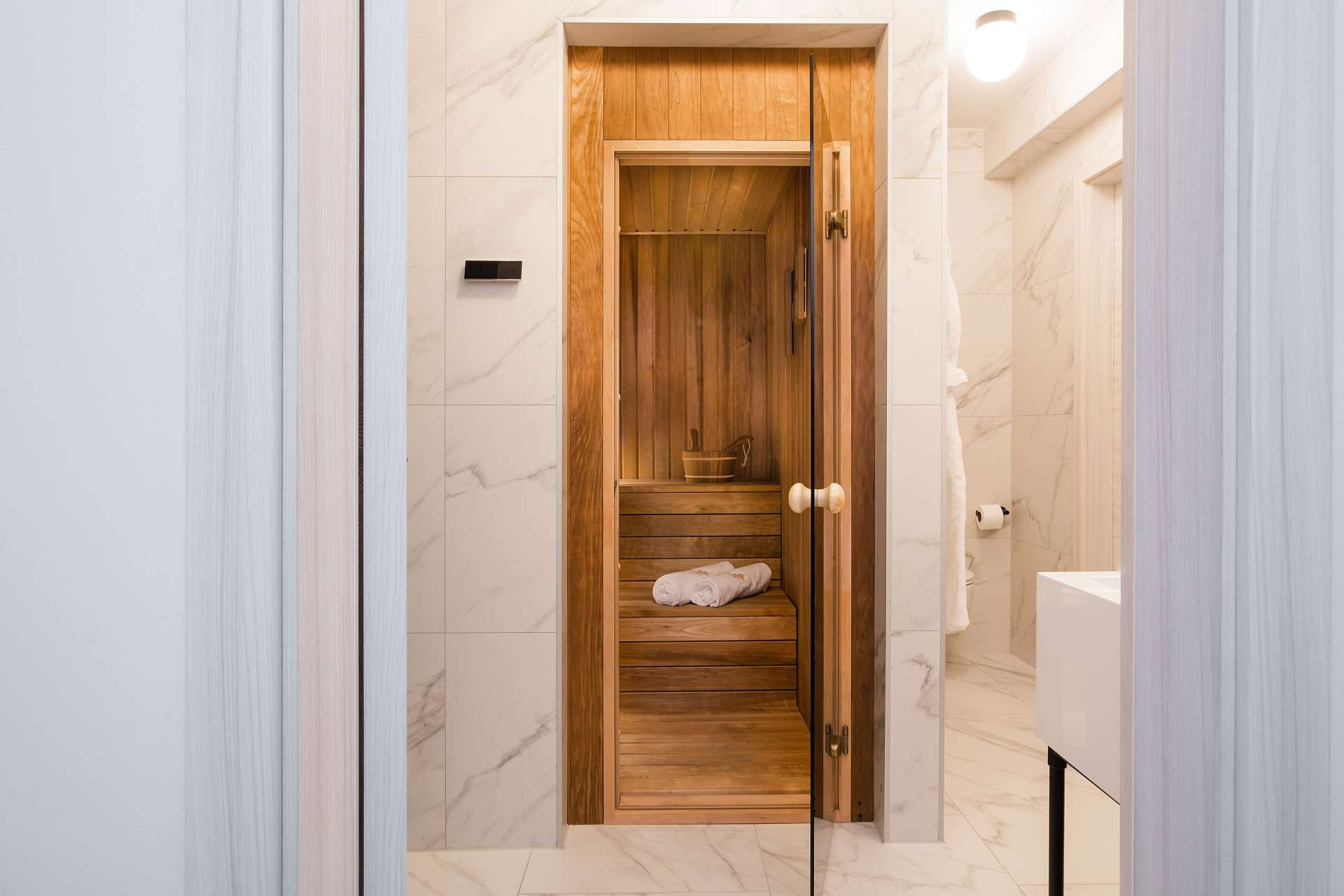 At the heart of the outdoor area is a heated swimming pool with an outdoor shower, surrounded by a sun deck ideal for relaxing while enjoying the sea view. A jacuzzi and sauna further enhance the wellness experience, offering complete relaxation and rejuvenation. An outdoor kitchen with barbecue invites you to enjoy Mediterranean evenings under the open sky, while private parking ensures maximum convenience. Guests also have access to a shared tennis court within the exclusive villa complex.