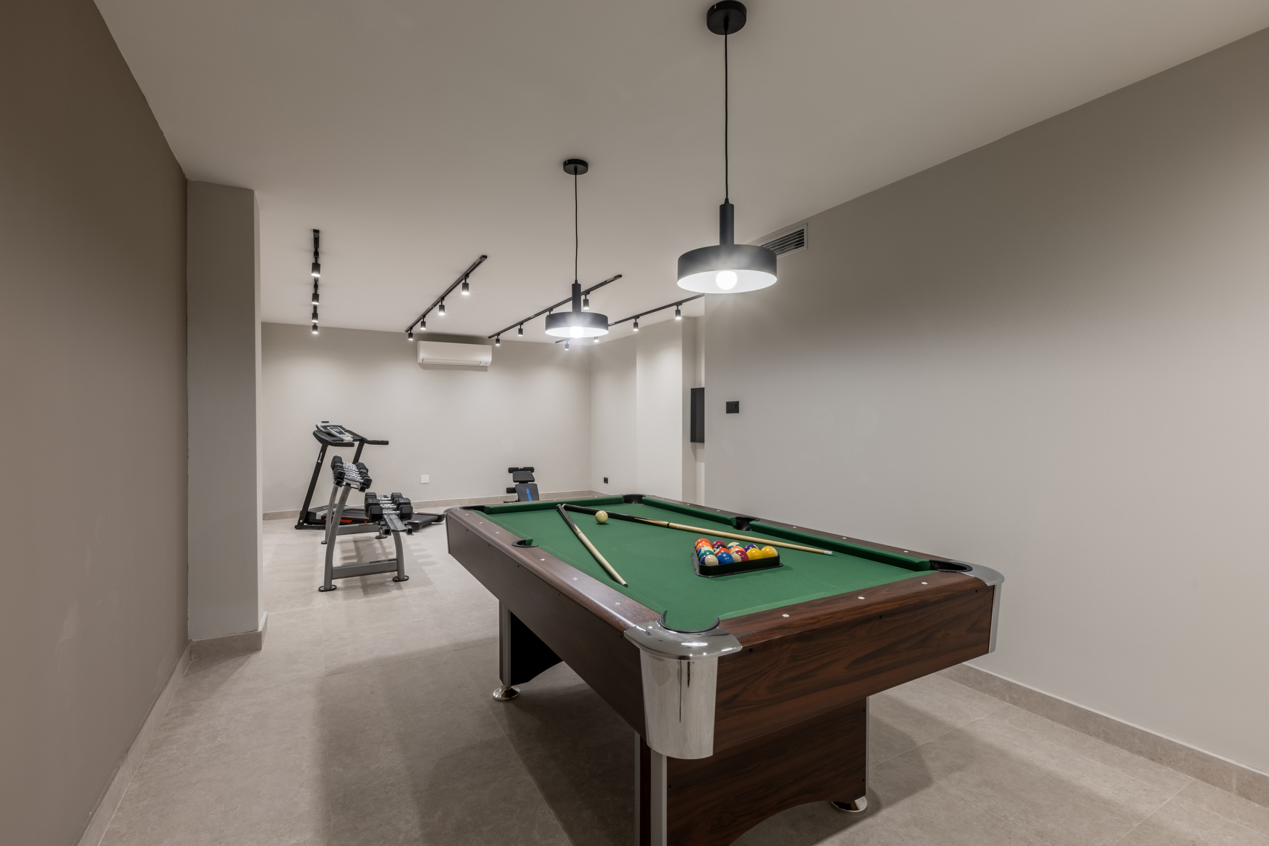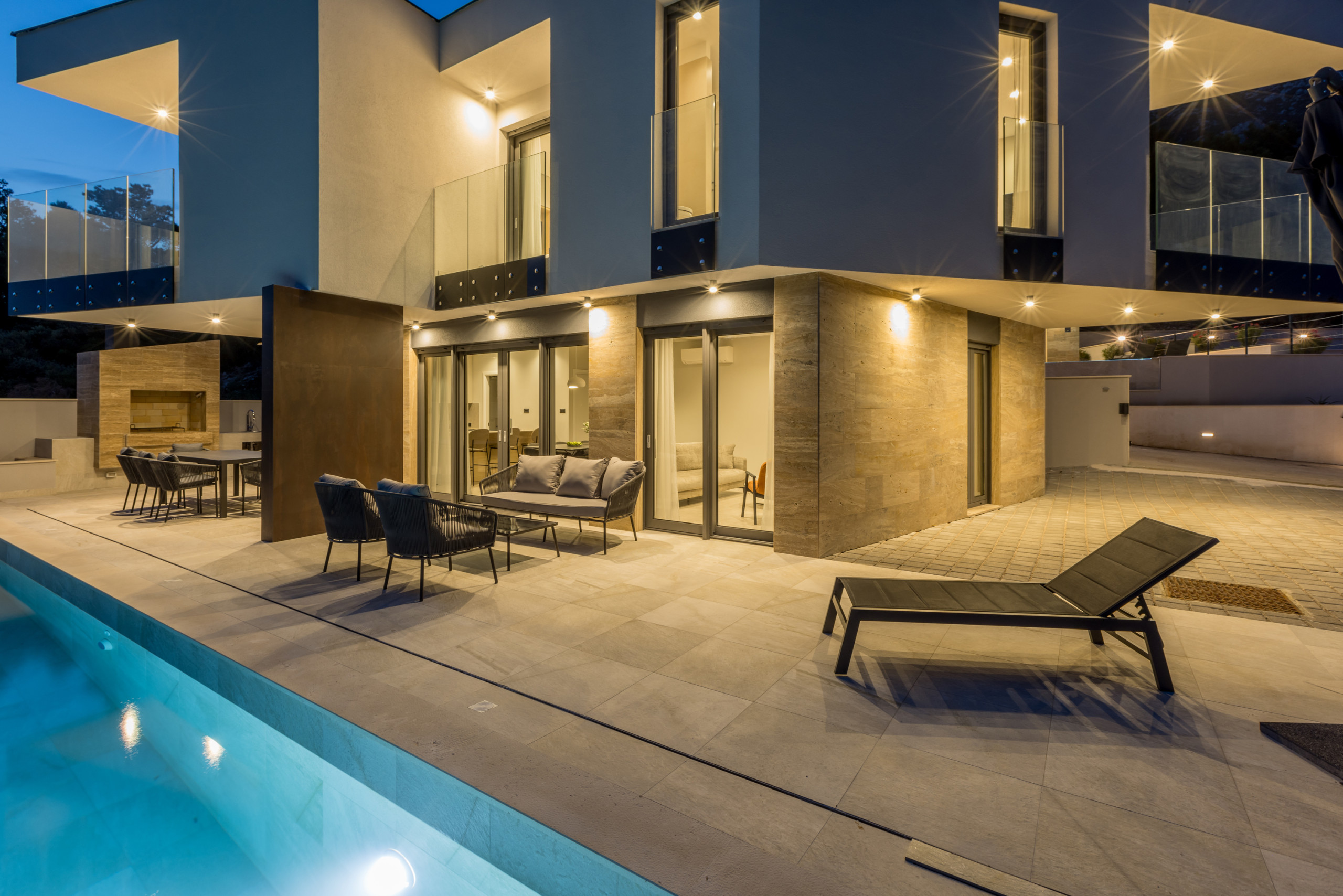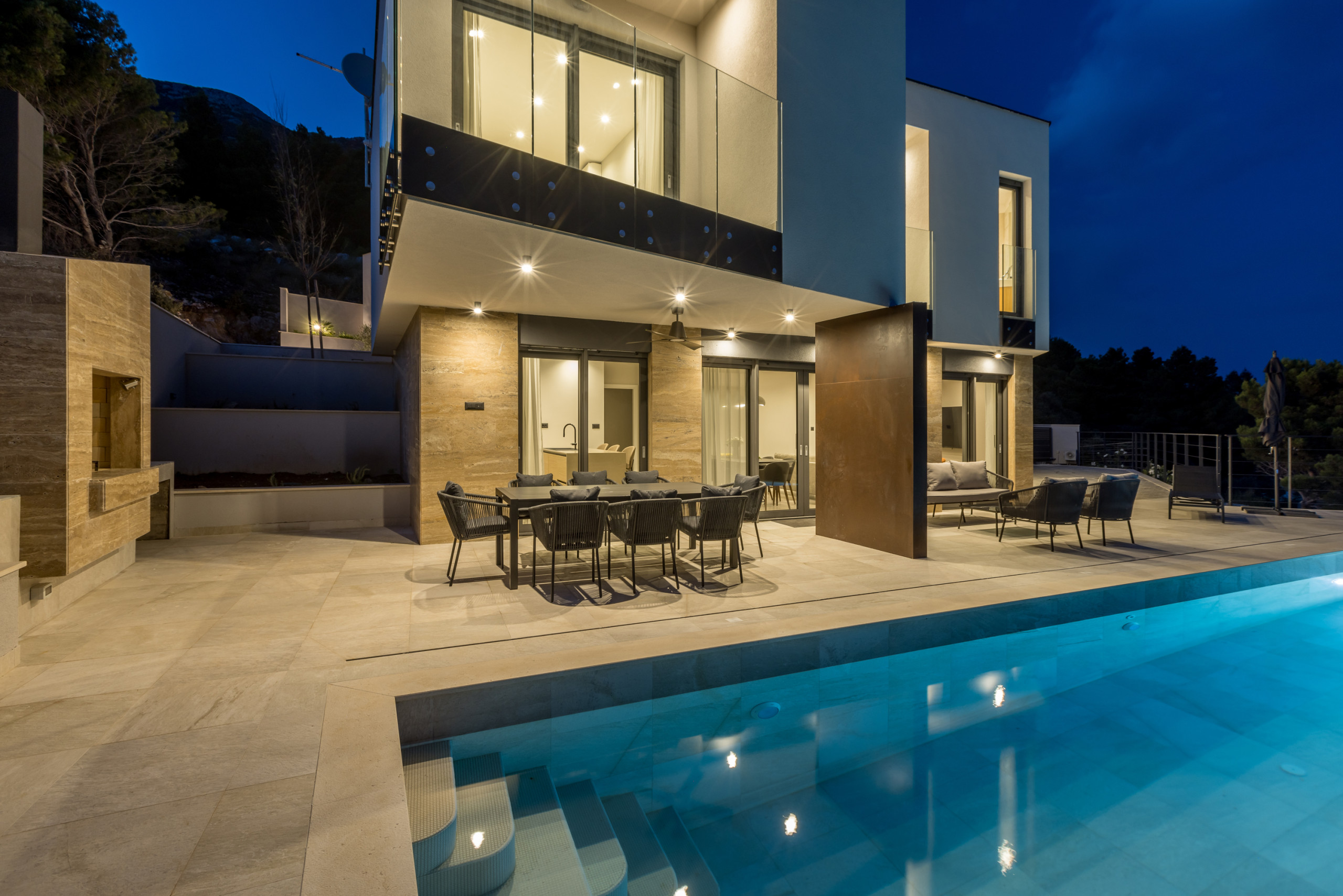 The interior of Villa Luce is designed for complete relaxation and functionality. In the basement, you'll find the perfect space for unwinding and entertainment, featuring a sauna for relaxation, as well as a spacious room with a gym and billiards, ideal for those who love active relaxation. The basement also includes a small storage room and a WC for added convenience. The ground floor features the living room and kitchen, both with access to the outdoor area with a private pool. Guests can relax by the pool and enjoy the beautiful sea view. The interior is elegantly furnished, and additional comfort is provided by a laundry room with a washer and dryer, as well as a small WC. The first floor is home to three luxurious bedrooms, each with its own bathroom with a shower. The rooms are air-conditioned, equipped with king-size beds (180x200 cm) and TVs. Every bedroom offers a breathtaking sea view, making each stay special.