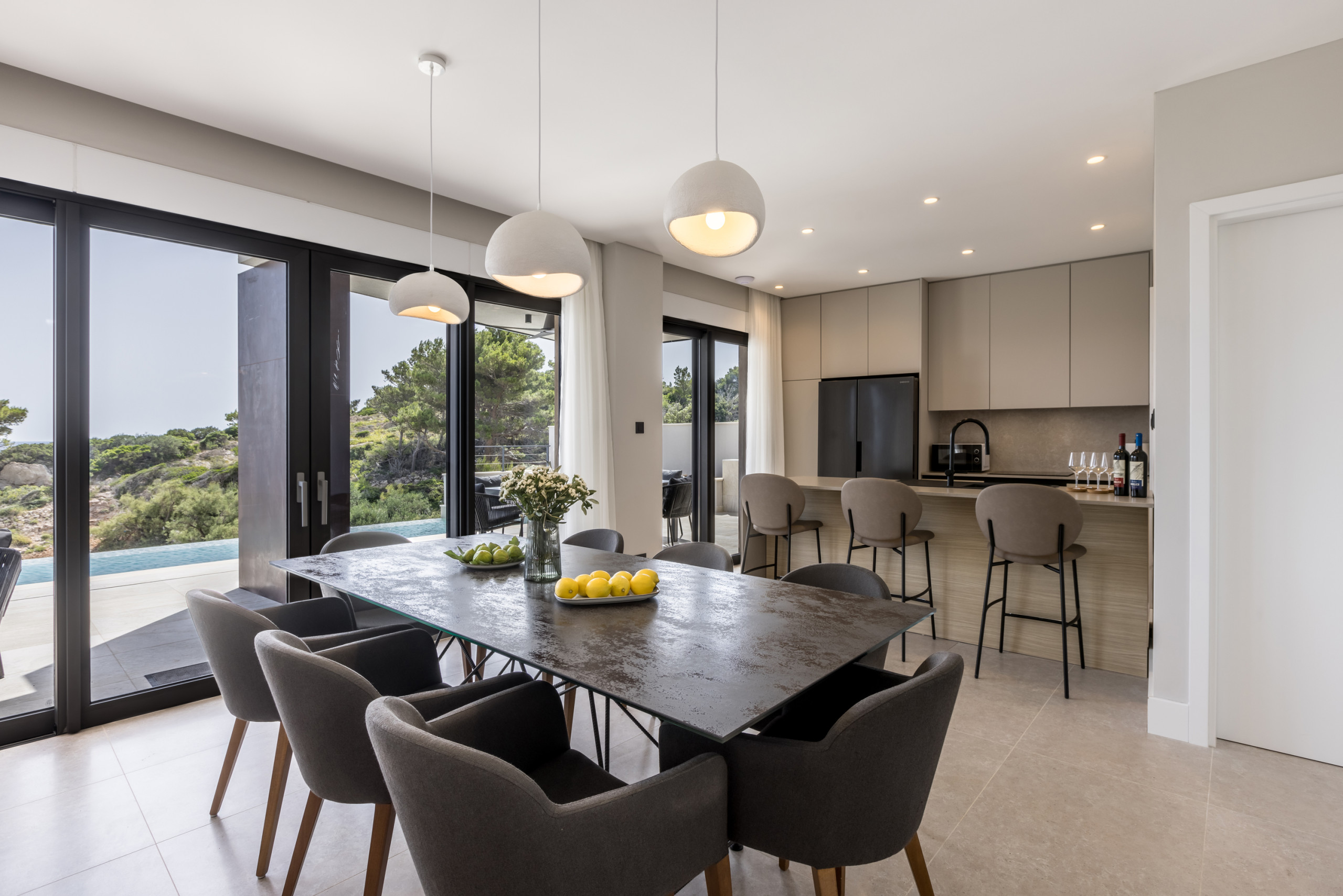 The outdoor space of the villa offers the ideal oasis for enjoying the outdoors. Villa Mare features an infinity heated pool, where guests can relax, swim, and take in the view of the sea. The outdoor area also includes a barbecue made of charcoal and wood, as well as an outdoor dining table, perfect for family meals or gatherings at sunset. Additionally, there are 3 sunbeds and 1 umbrella for total enjoyment under the sun. The villa also provides 3 parking spaces, ensuring easy access to the property.