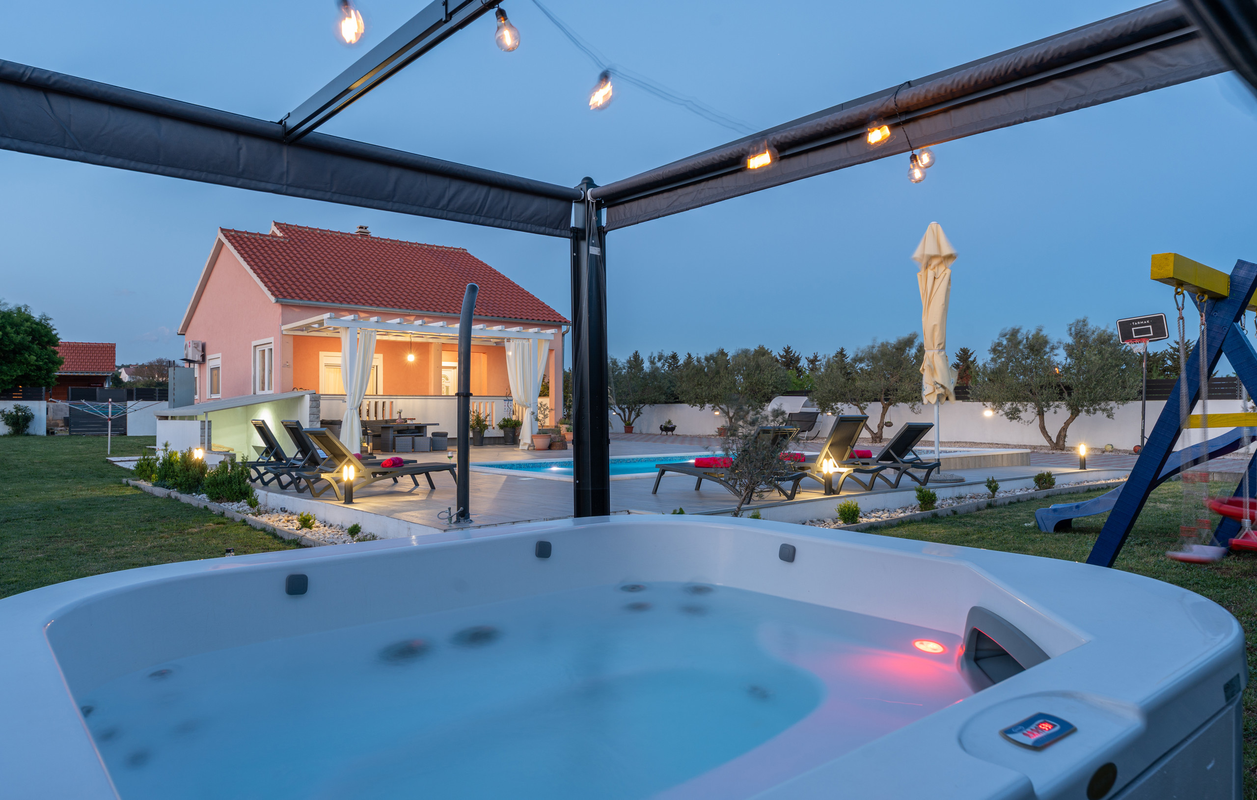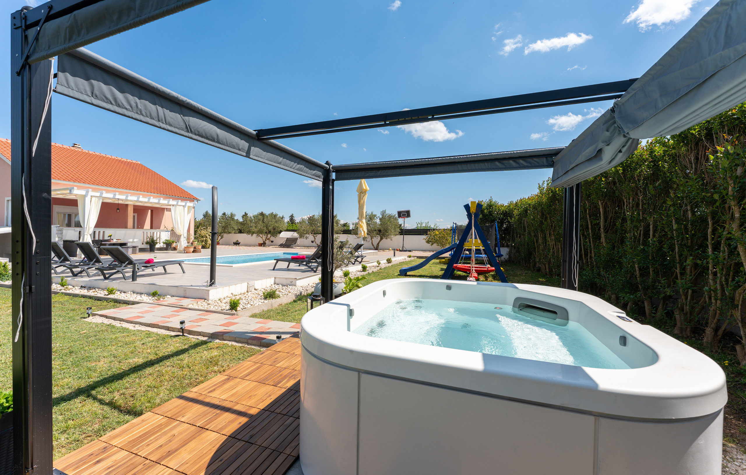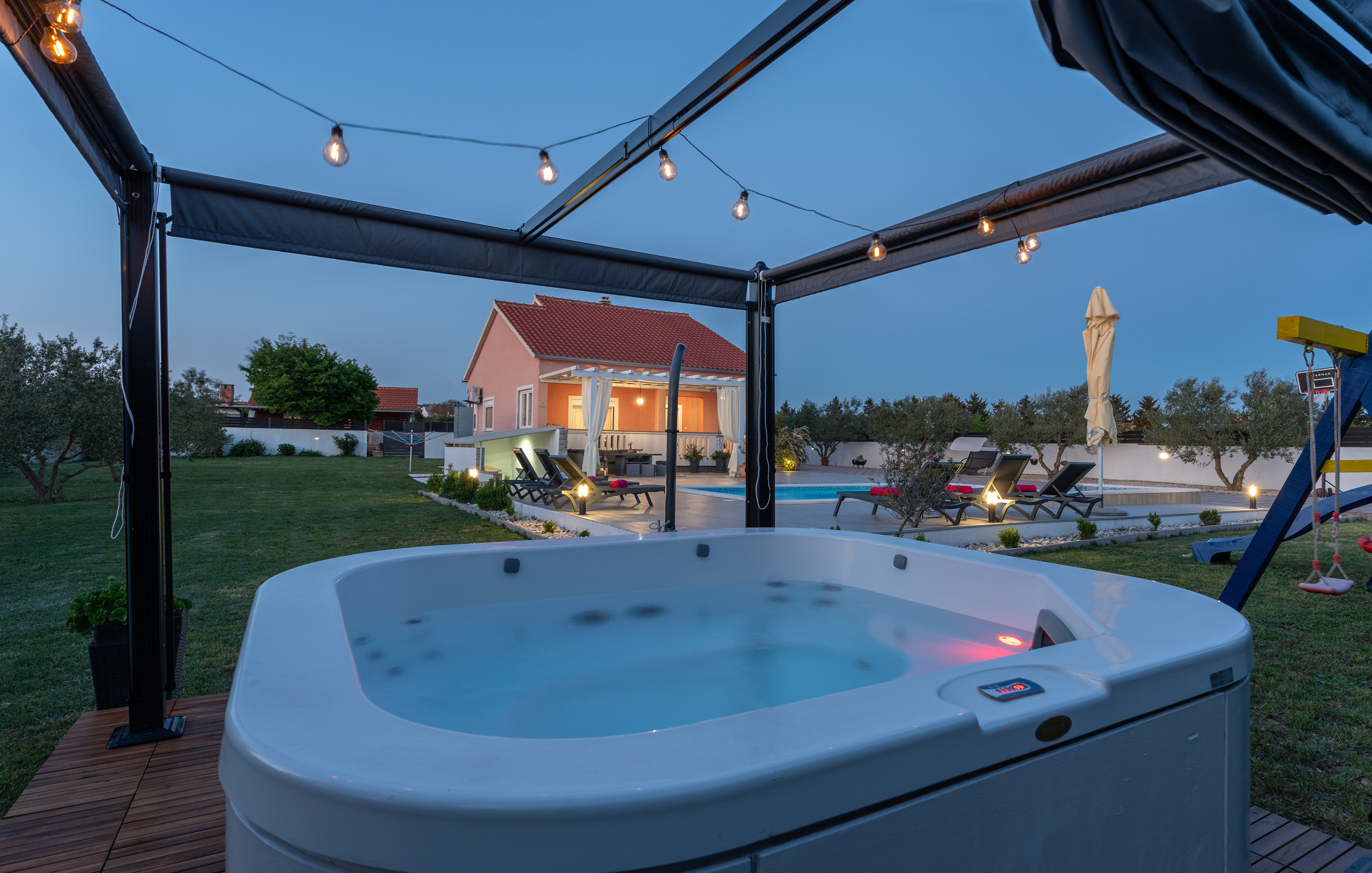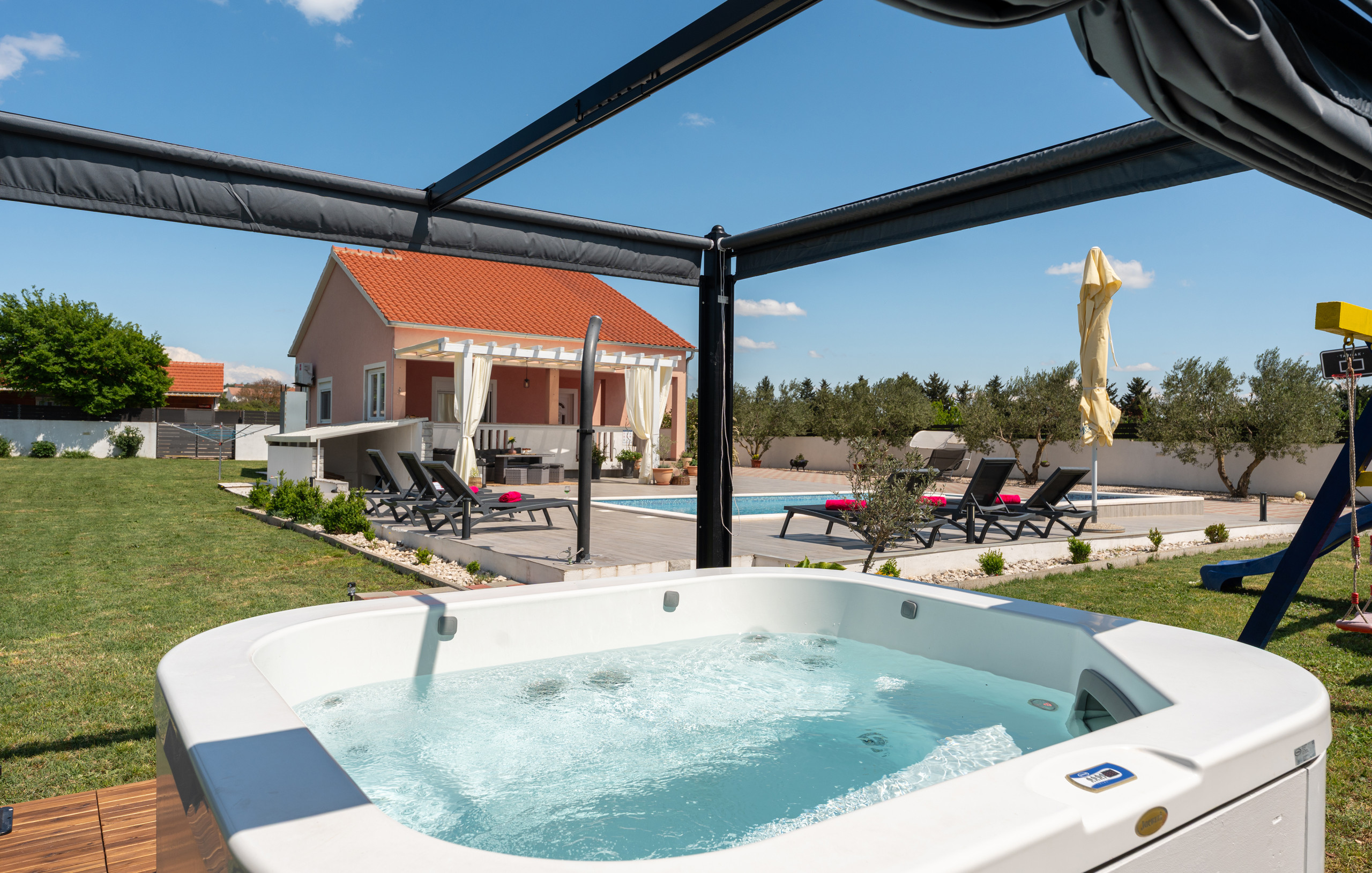 Indulge in complete relaxation – the villa offers a luxurious jacuzzi with an elegant canopy, perfect for peaceful outdoor moments and pure enjoyment.