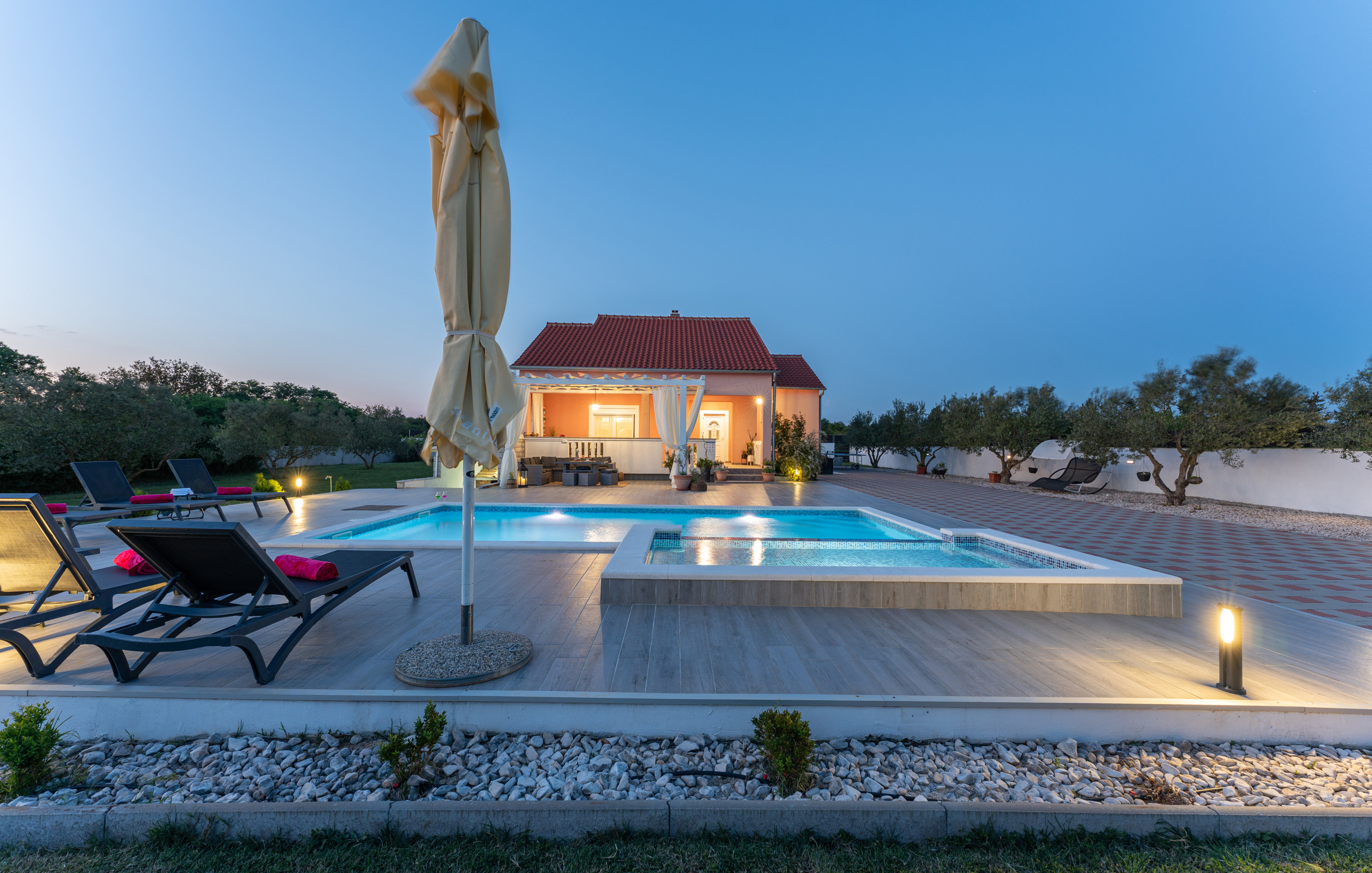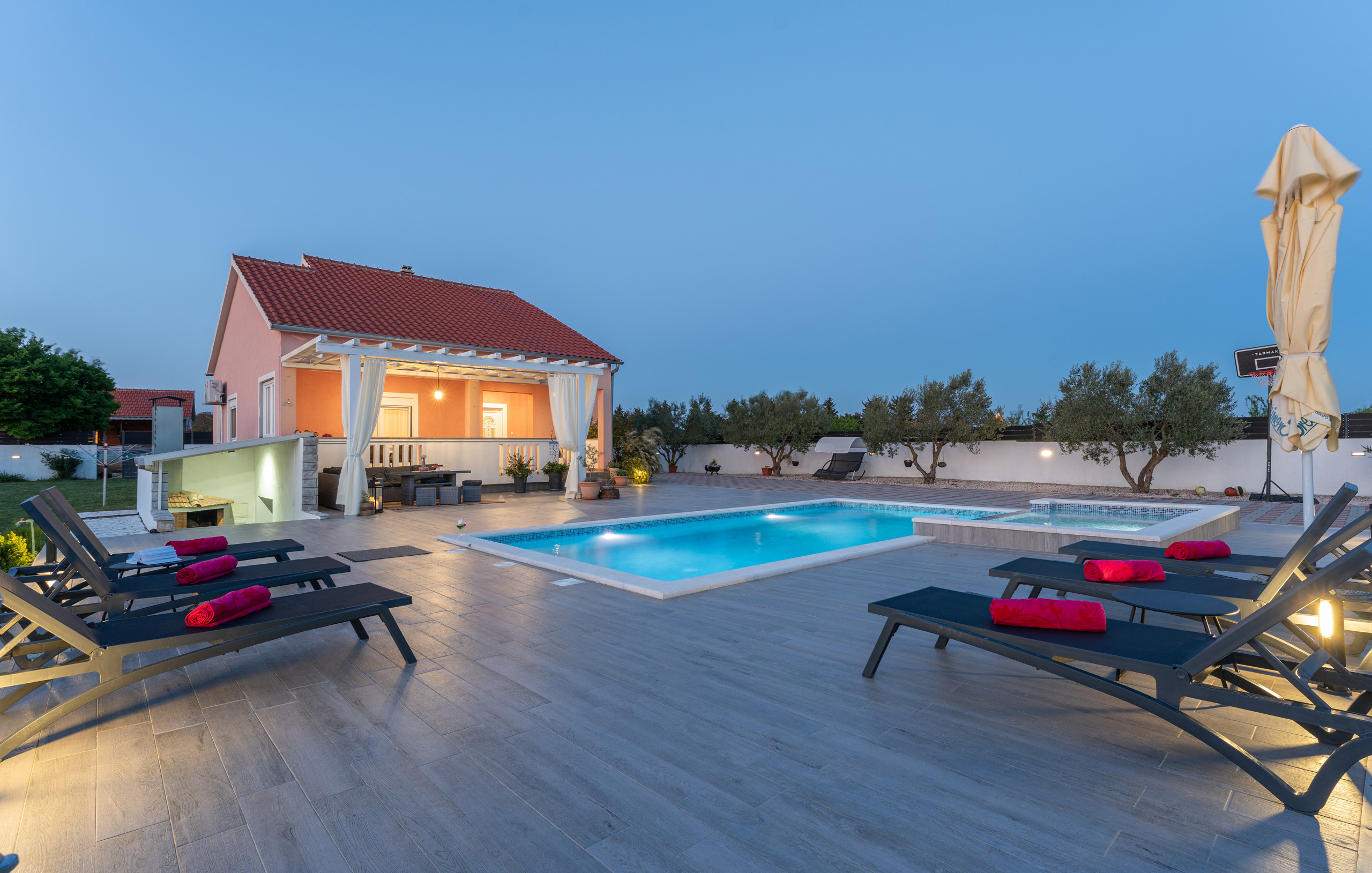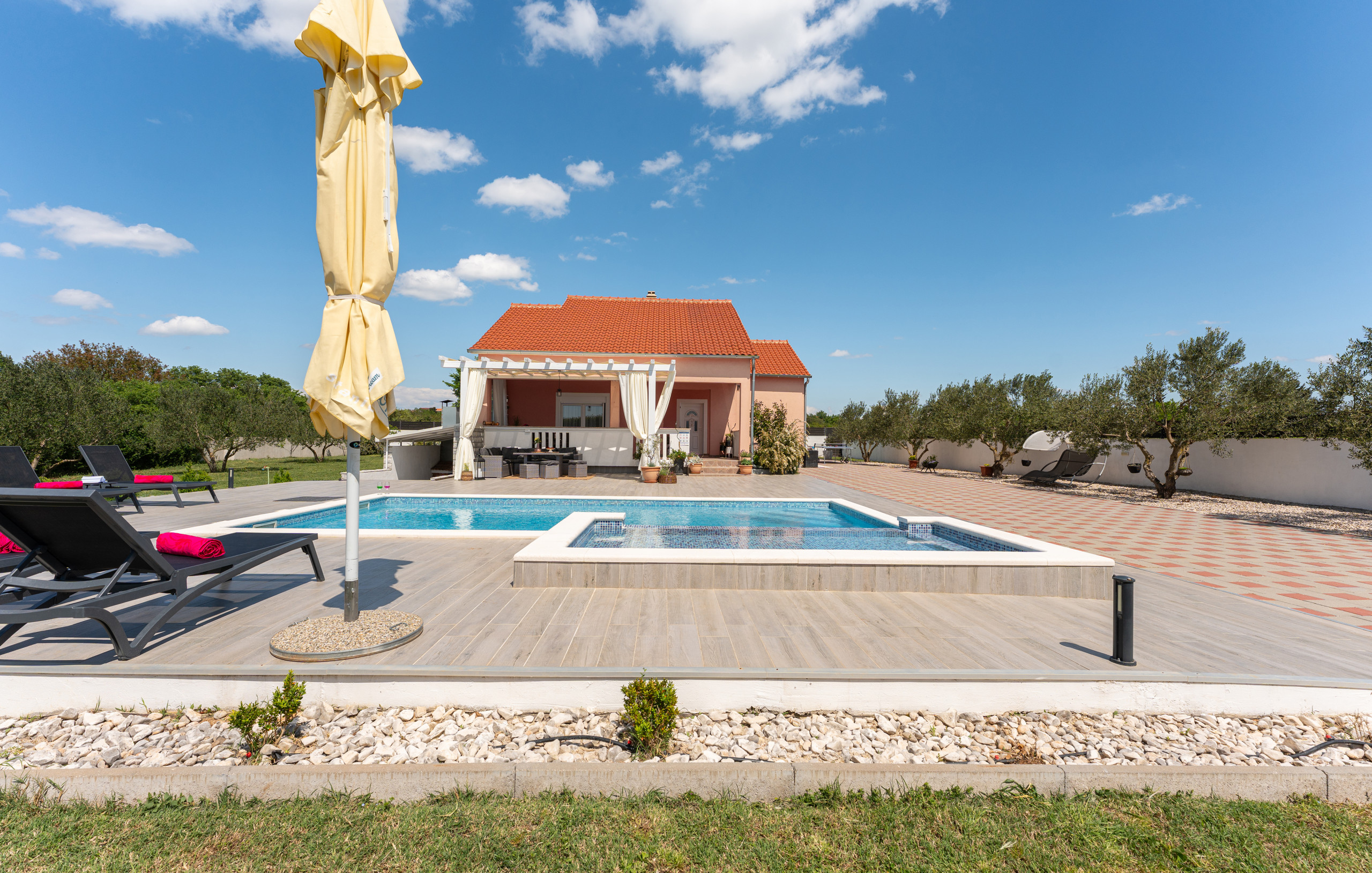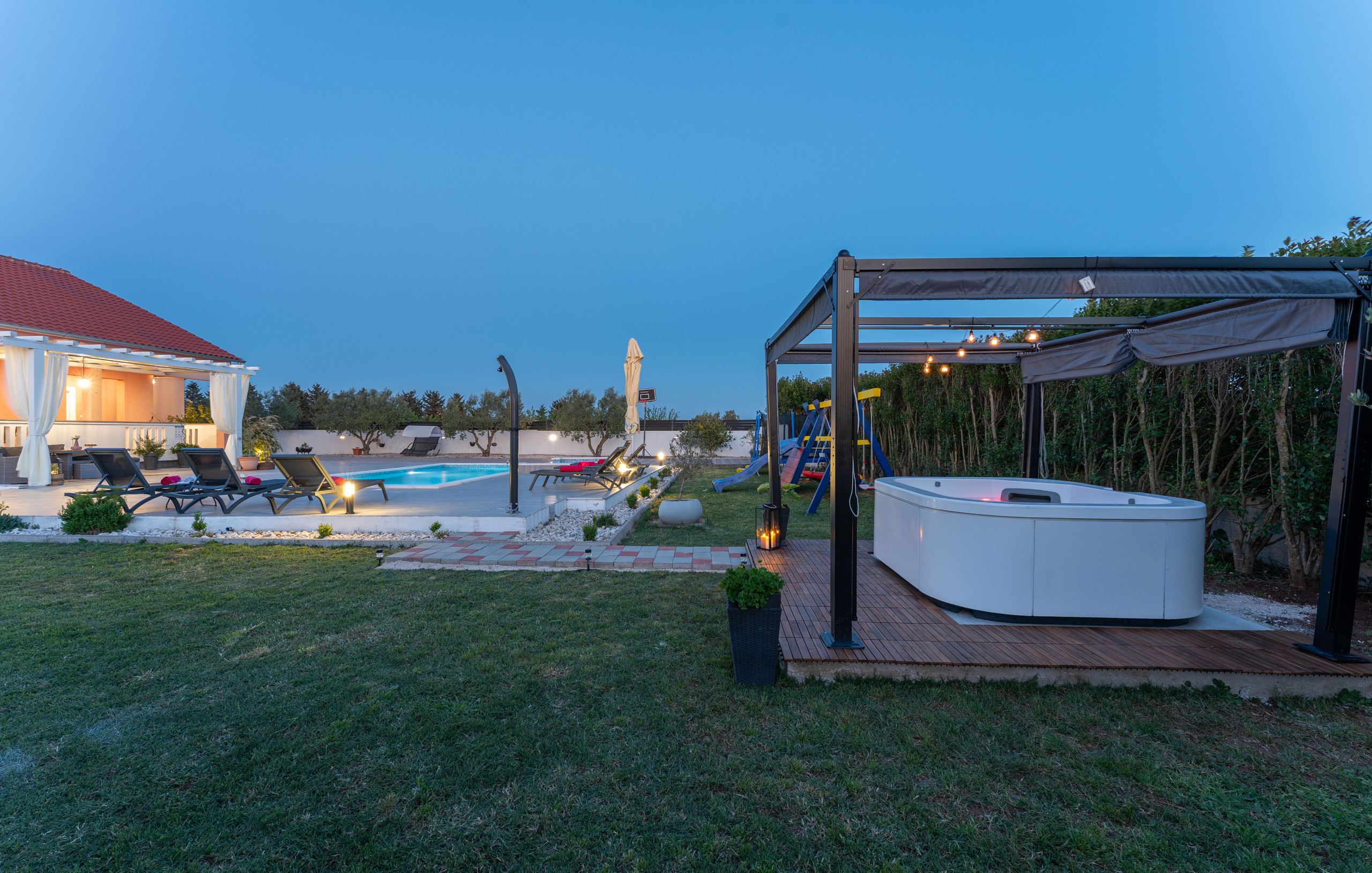 Indulge in complete relaxation – the villa offers a luxurious jacuzzi with an elegant canopy, perfect for peaceful outdoor moments and pure enjoyment.