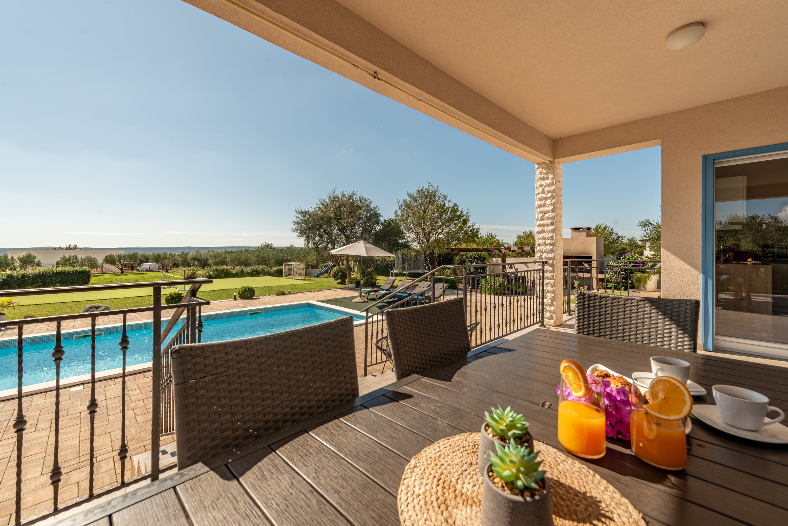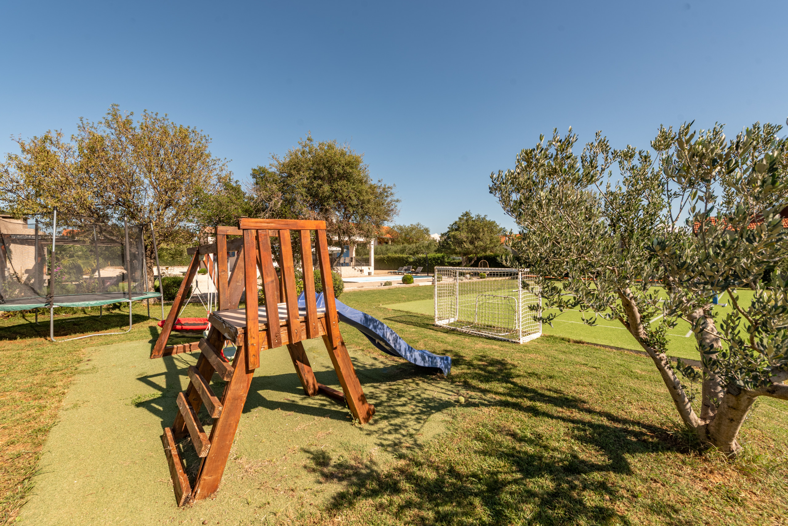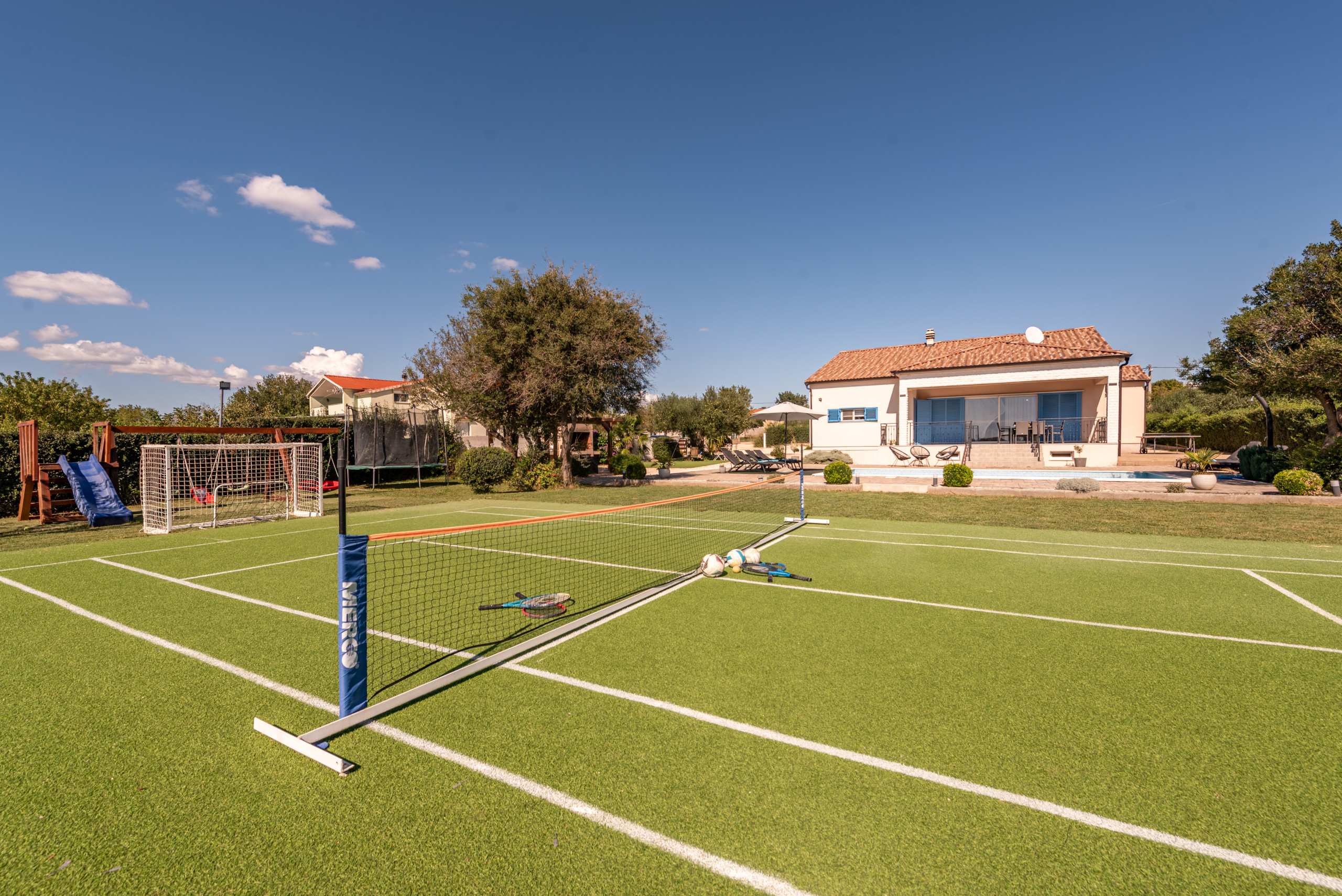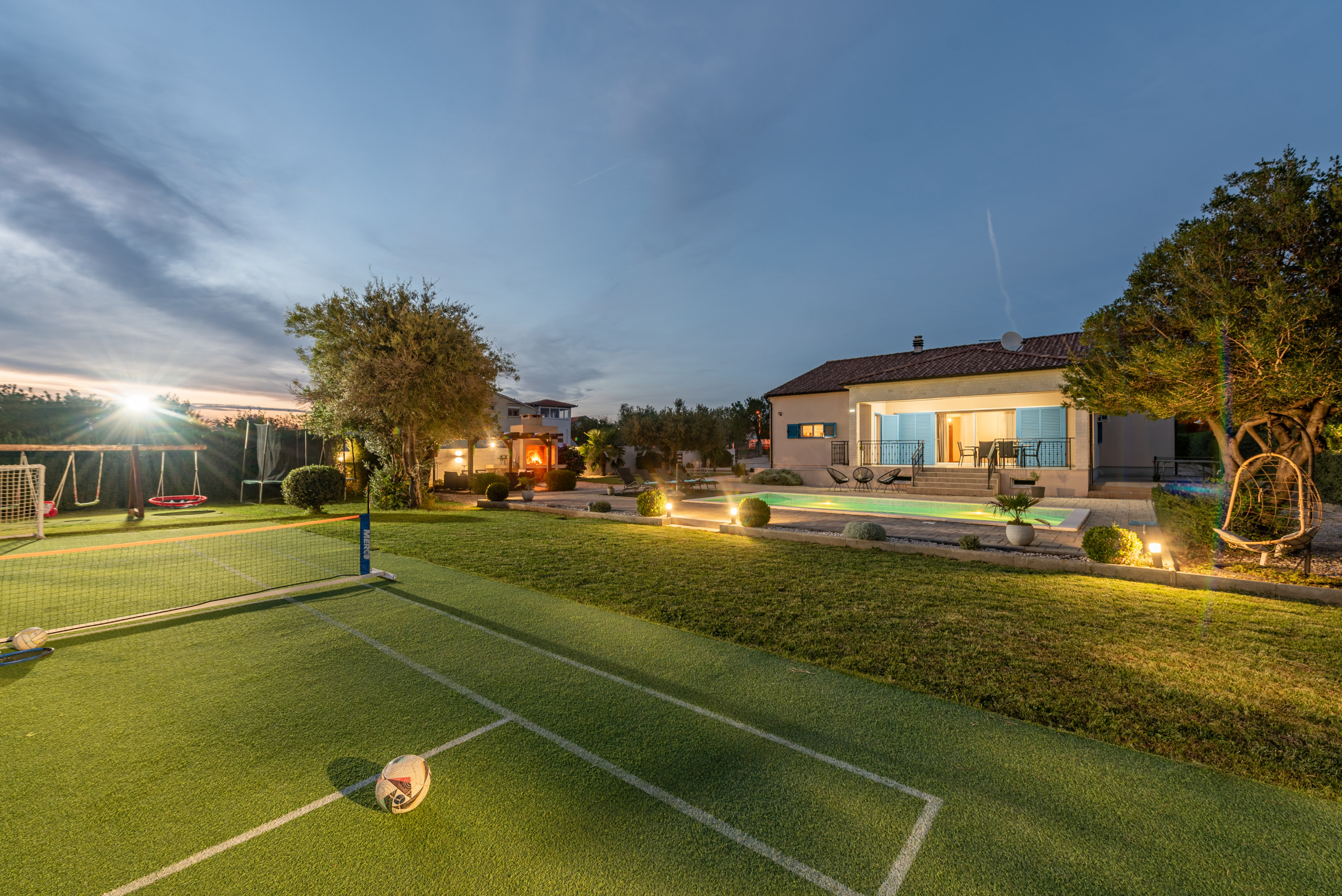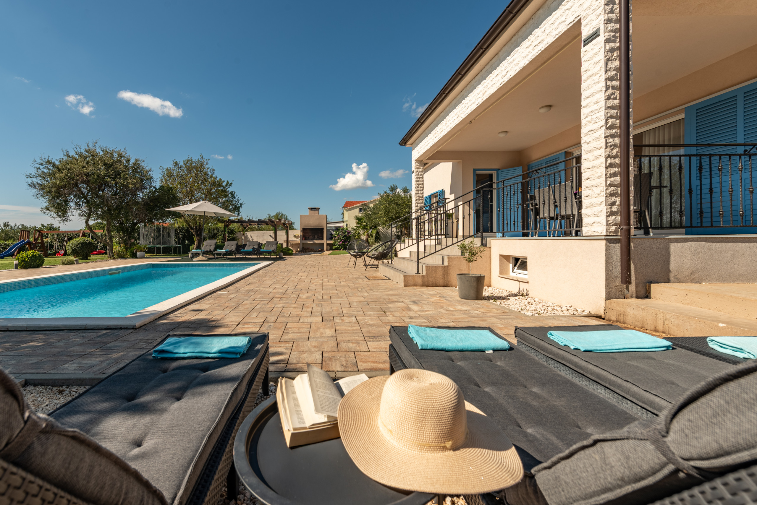 The outdoor area of the villa covers 1020 m2 and offers plenty of amenities for a carefree stay in complete peace and privacy. At the center of the yard is a 32 m2 swimming pool with a view of greenery, surrounded by sun loungers and parasols, along with a covered terrace, outdoor shower, and a fireplace for preparing meals outdoors. A special highlight is the rooftop terrace with a jacuzzi, perfect for relaxing in silence, while children will enjoy the playground with a trampoline, table tennis, swings, and other facilities.