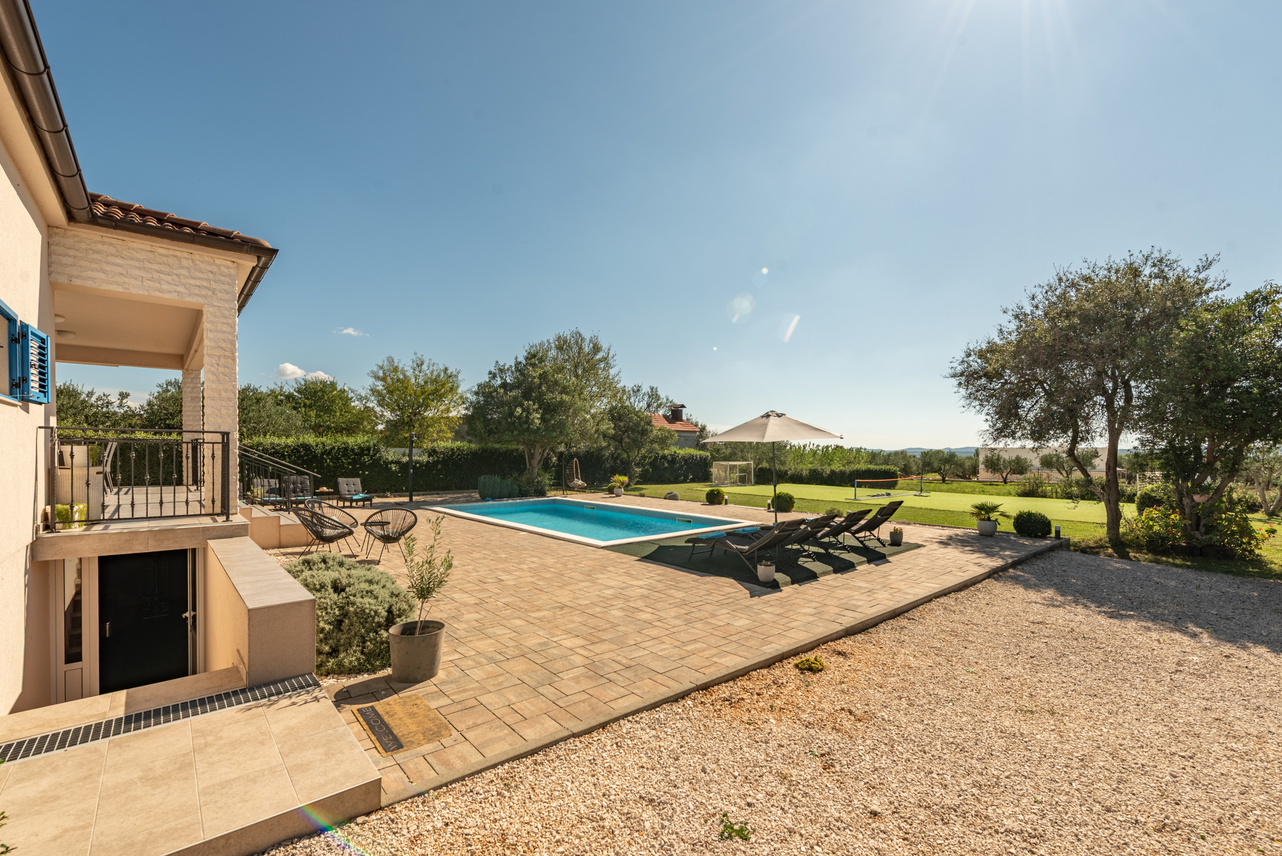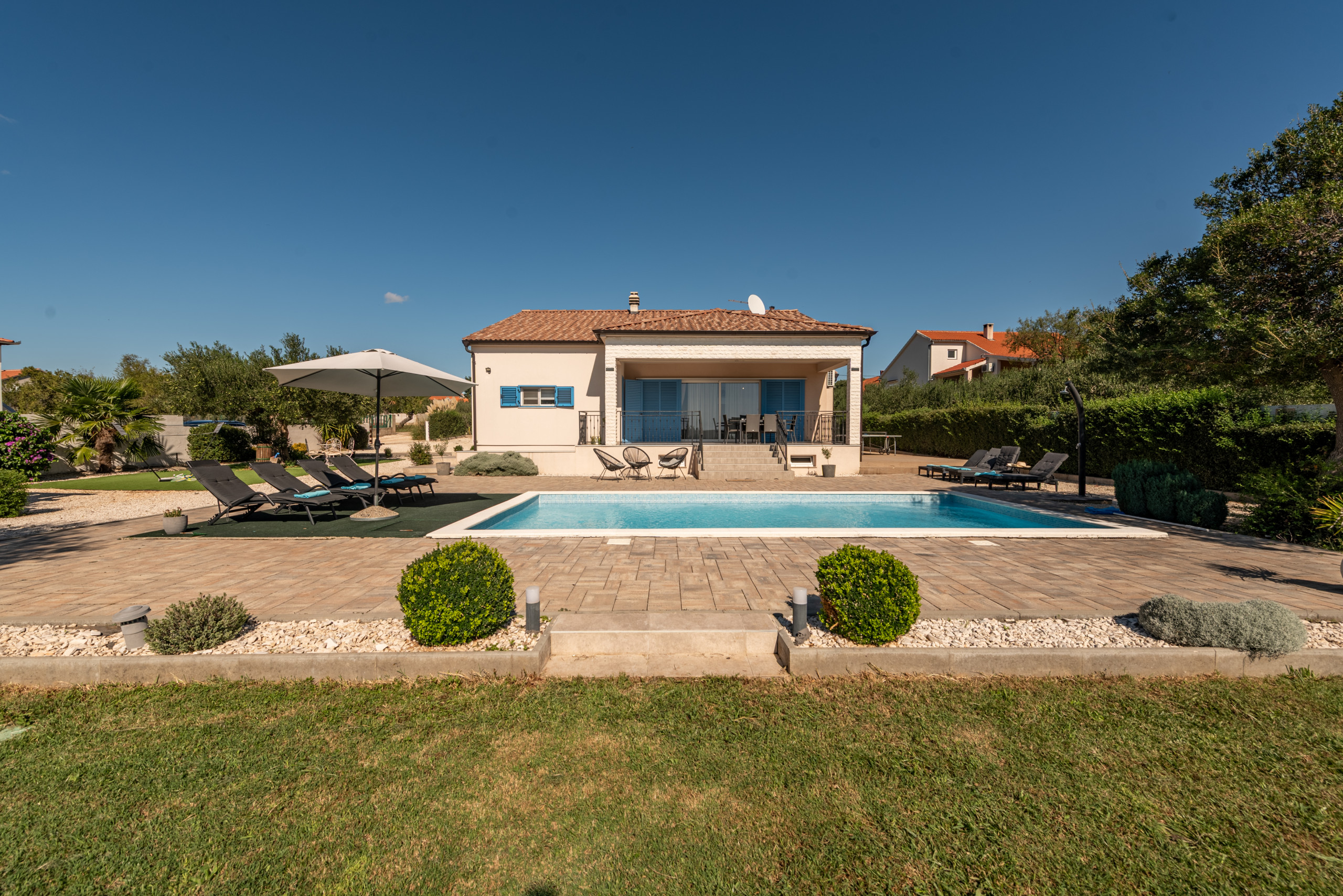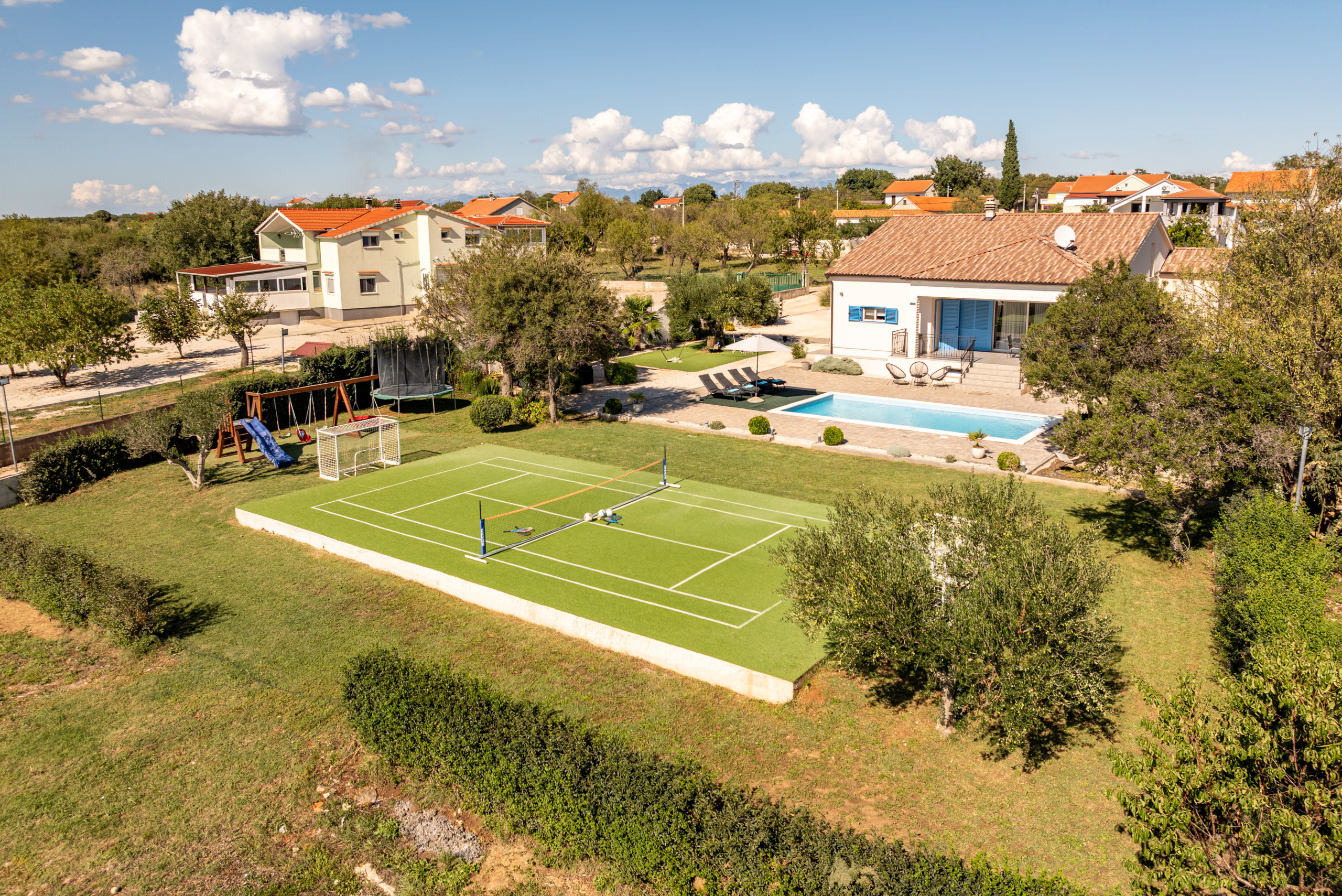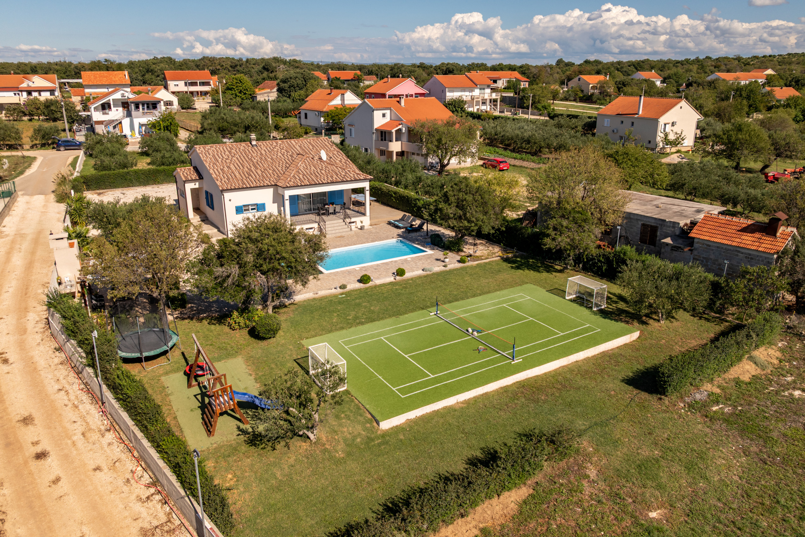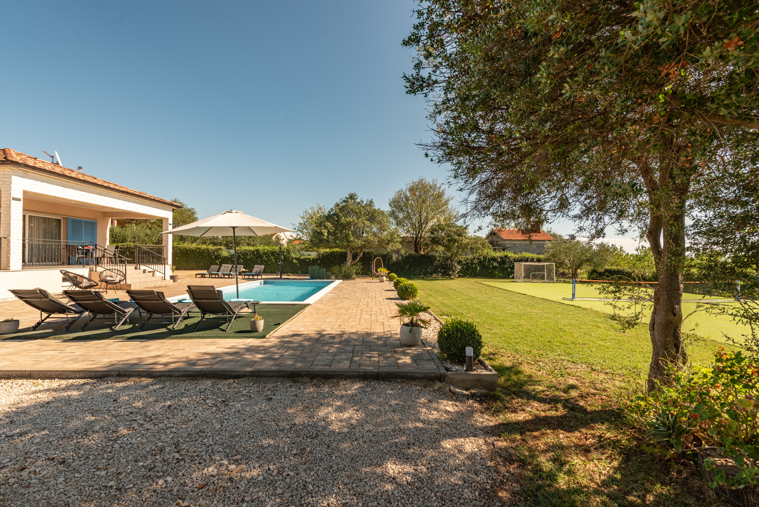 The outdoor area of the villa covers 1020 m2 and offers plenty of amenities for a carefree stay in complete peace and privacy. At the center of the yard is a 32 m2 swimming pool with a view of greenery, surrounded by sun loungers and parasols, along with a covered terrace, outdoor shower, and a fireplace for preparing meals outdoors. A special highlight is the rooftop terrace with a jacuzzi, perfect for relaxing in silence, while children will enjoy the playground with a trampoline, table tennis, swings, and other facilities.