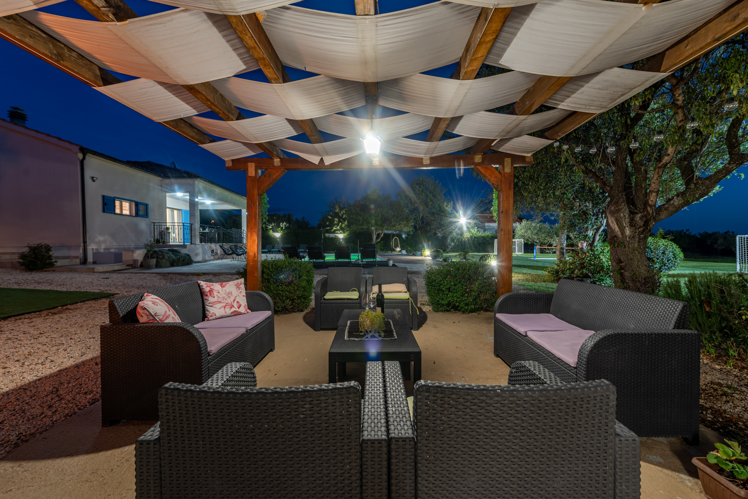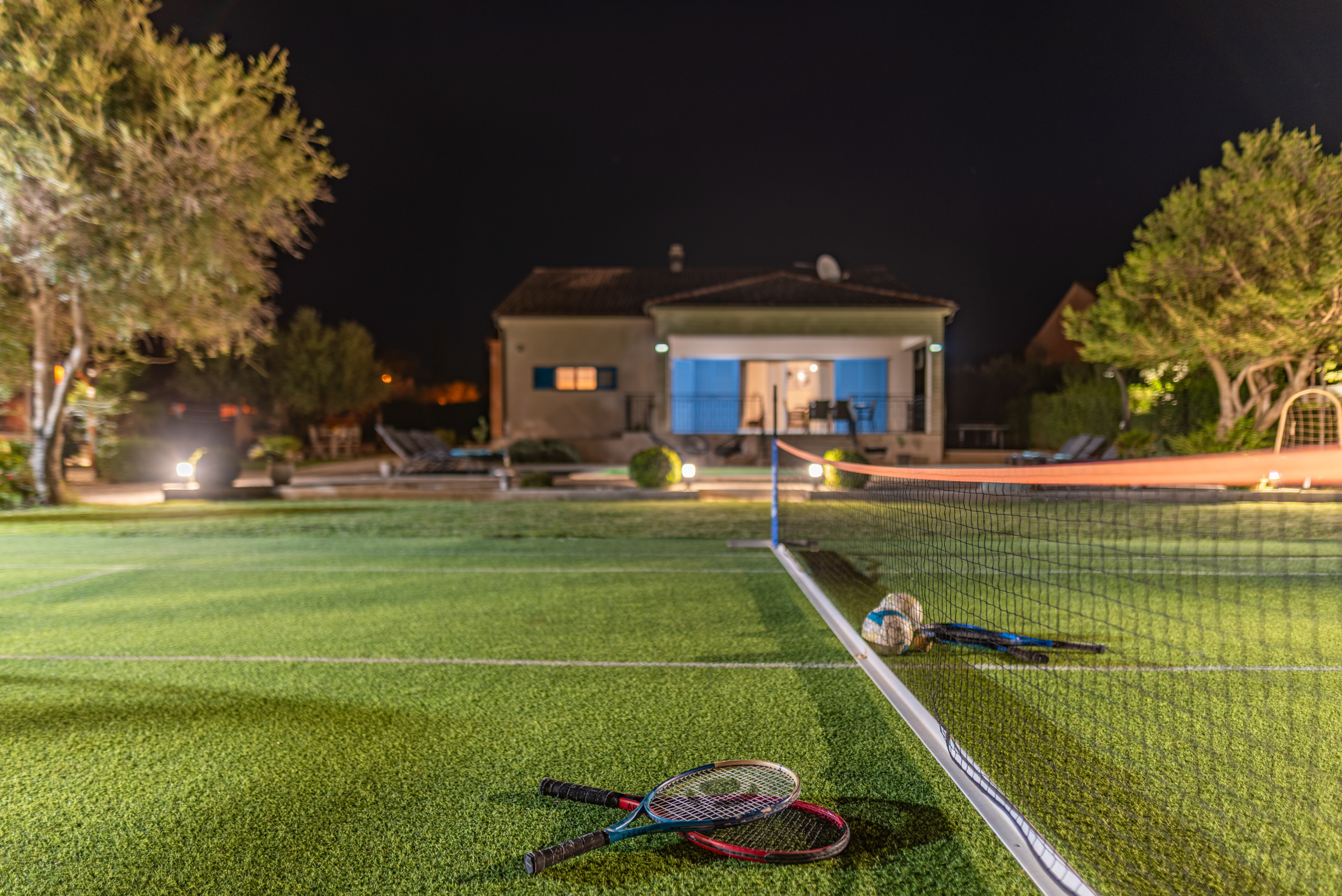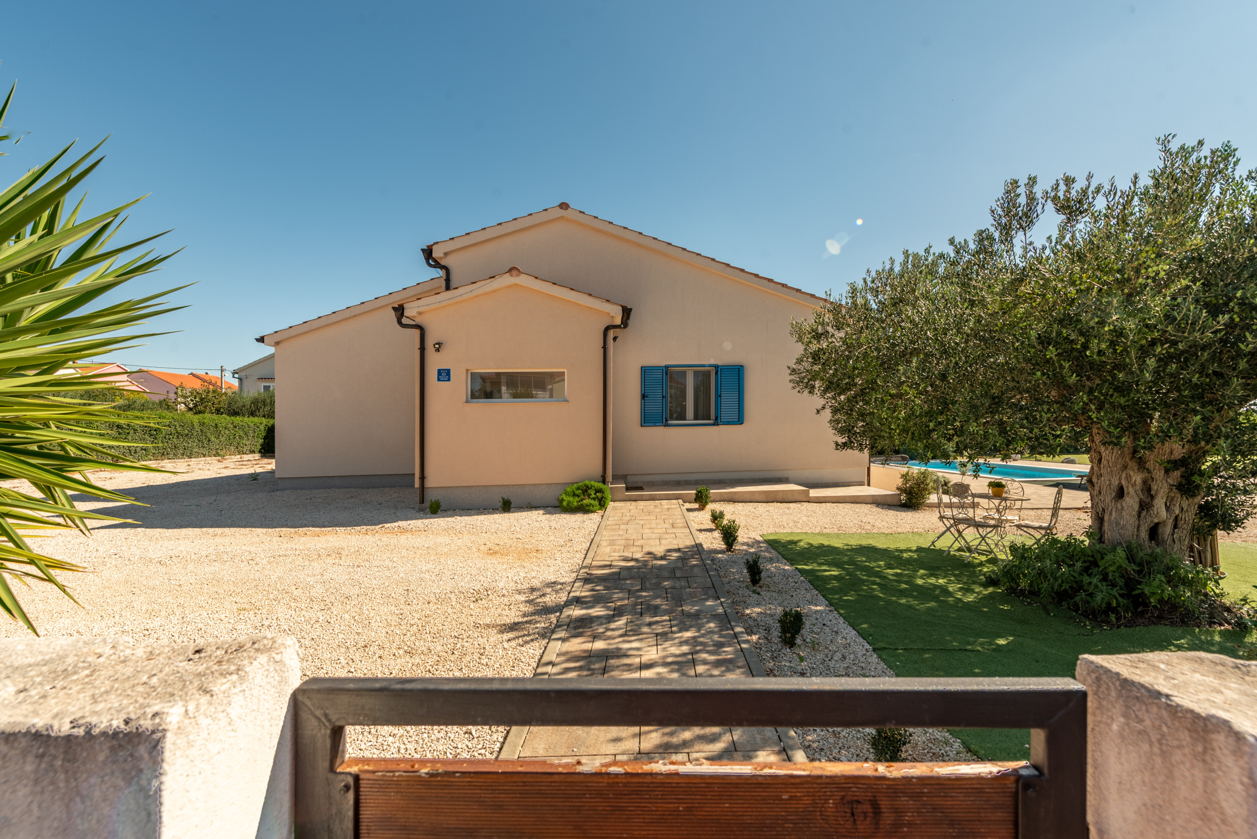 The entire yard is fully fenced, and the villa is pet friendly, with pets welcome for an additional fee of 10 euros per day.