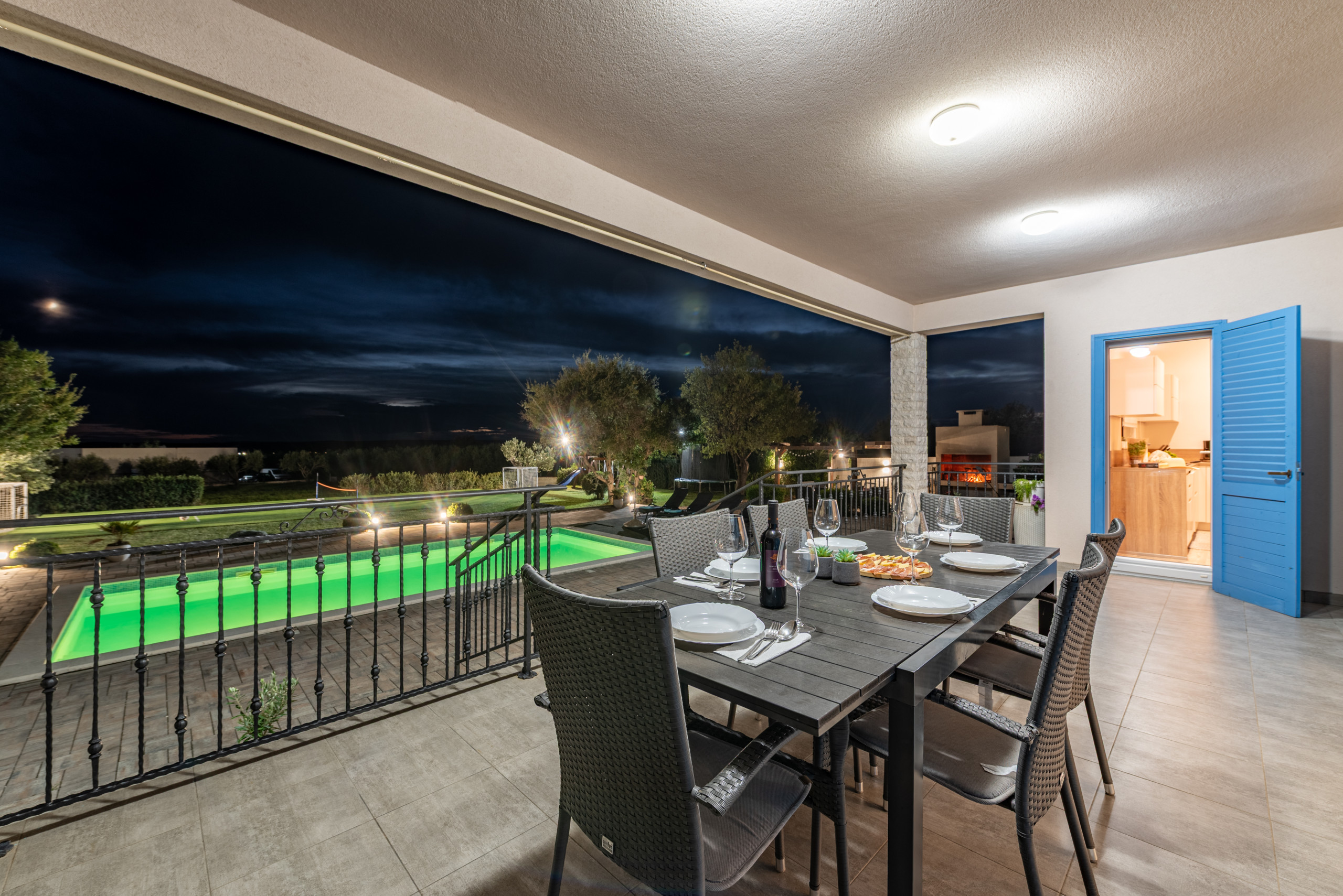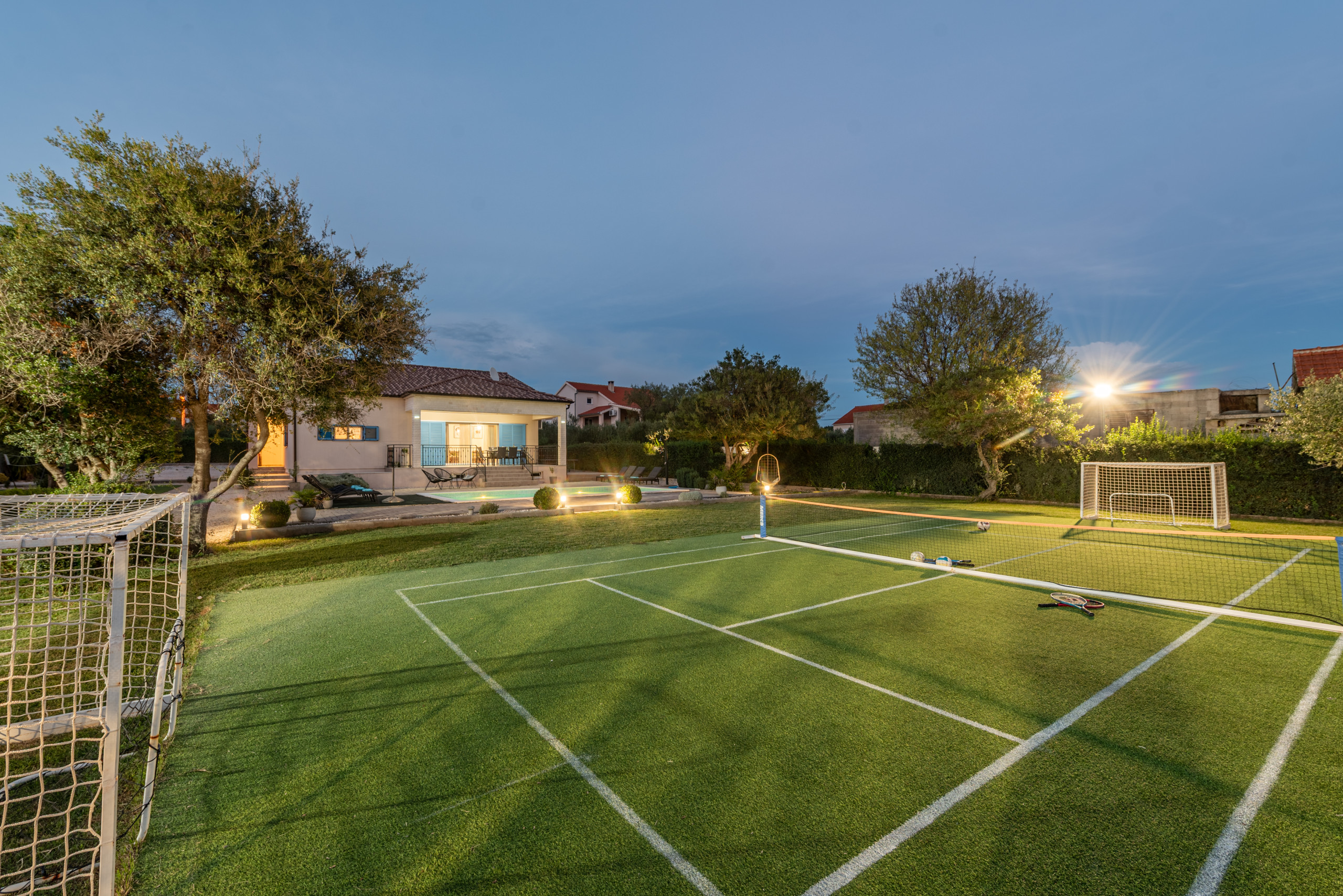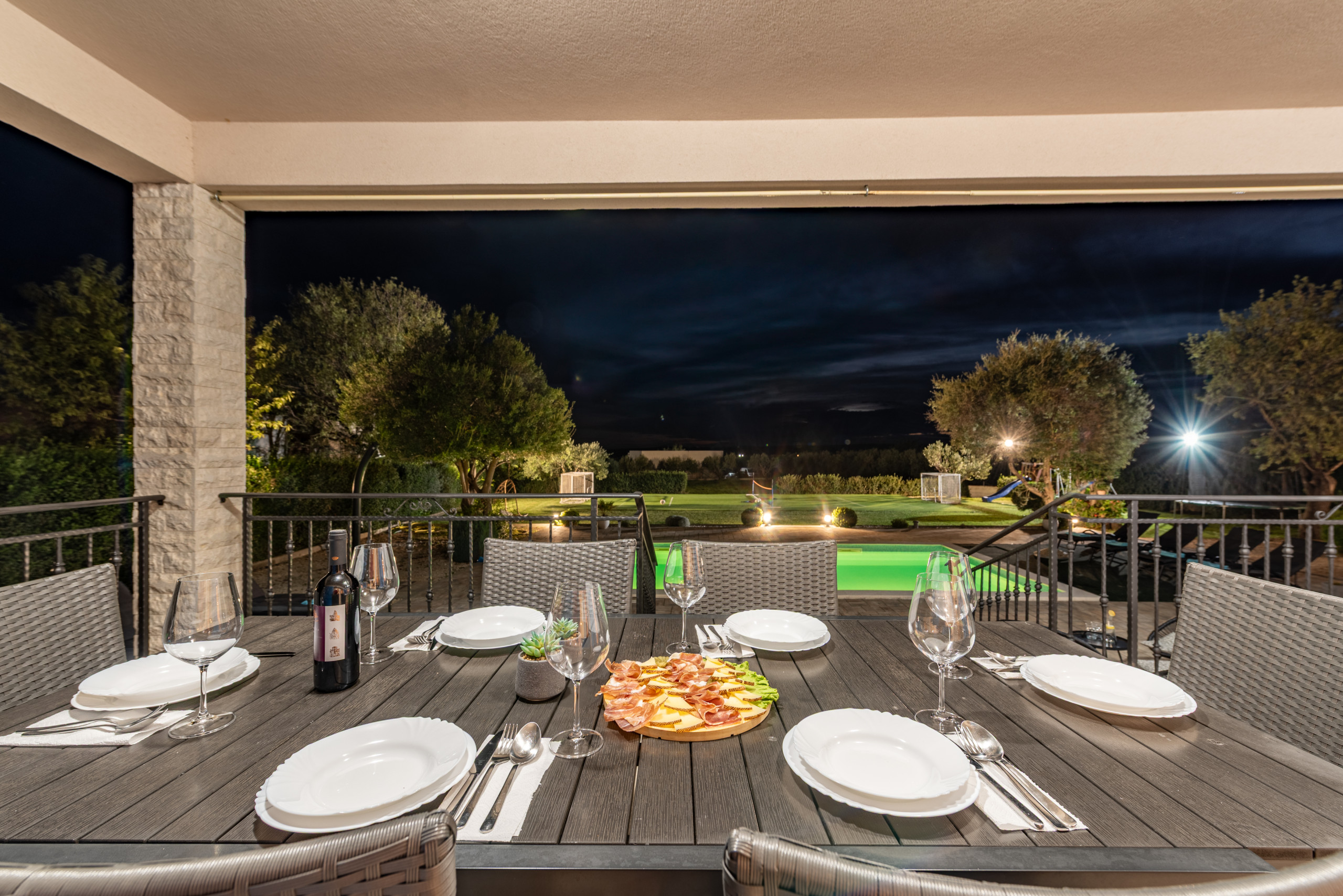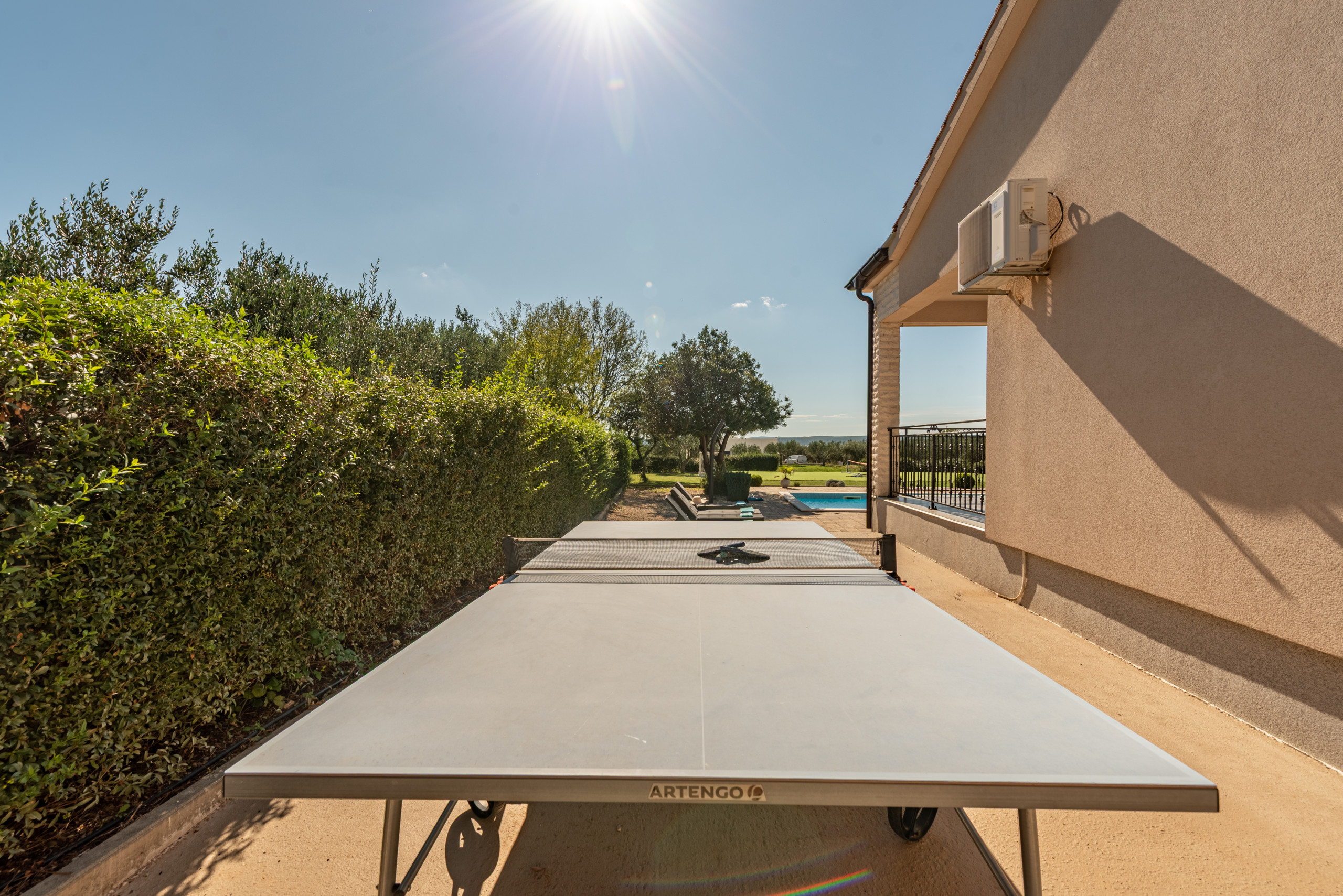 The entire yard is fully fenced, and the villa is pet friendly, with pets welcome for an additional fee of 10 euros per day.