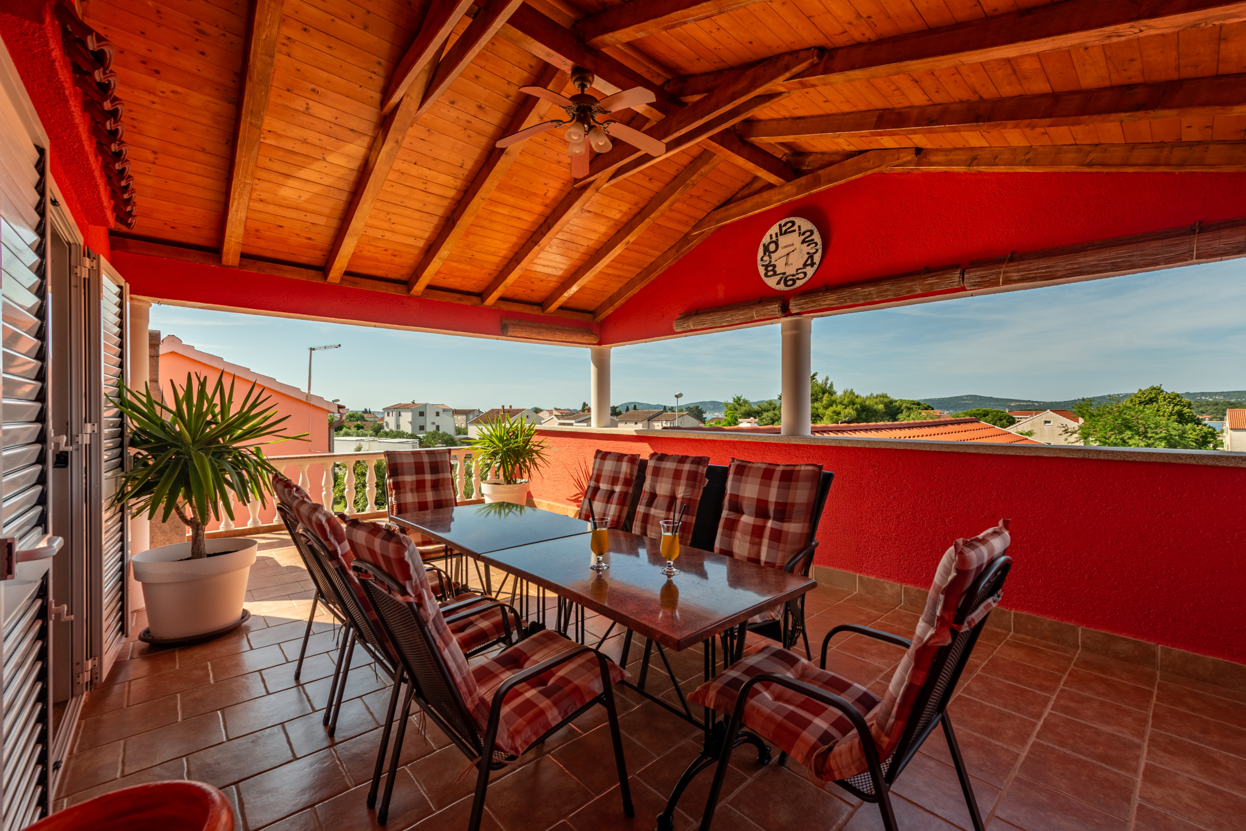 This beautiful and spacious semi-detached holiday home is located in a peaceful part of the charming coastal village of Turanj, only 200 meters from a pebble beach. The carefully designed interior extends over the first and second floors, connected by an internal staircase. Guests have at their disposal five air-conditioned bedrooms, three bathrooms, an additional toilet, and a fully equipped kitchen and living room on each floor – ideal for larger families or groups of friends seeking both comfort and privacy.