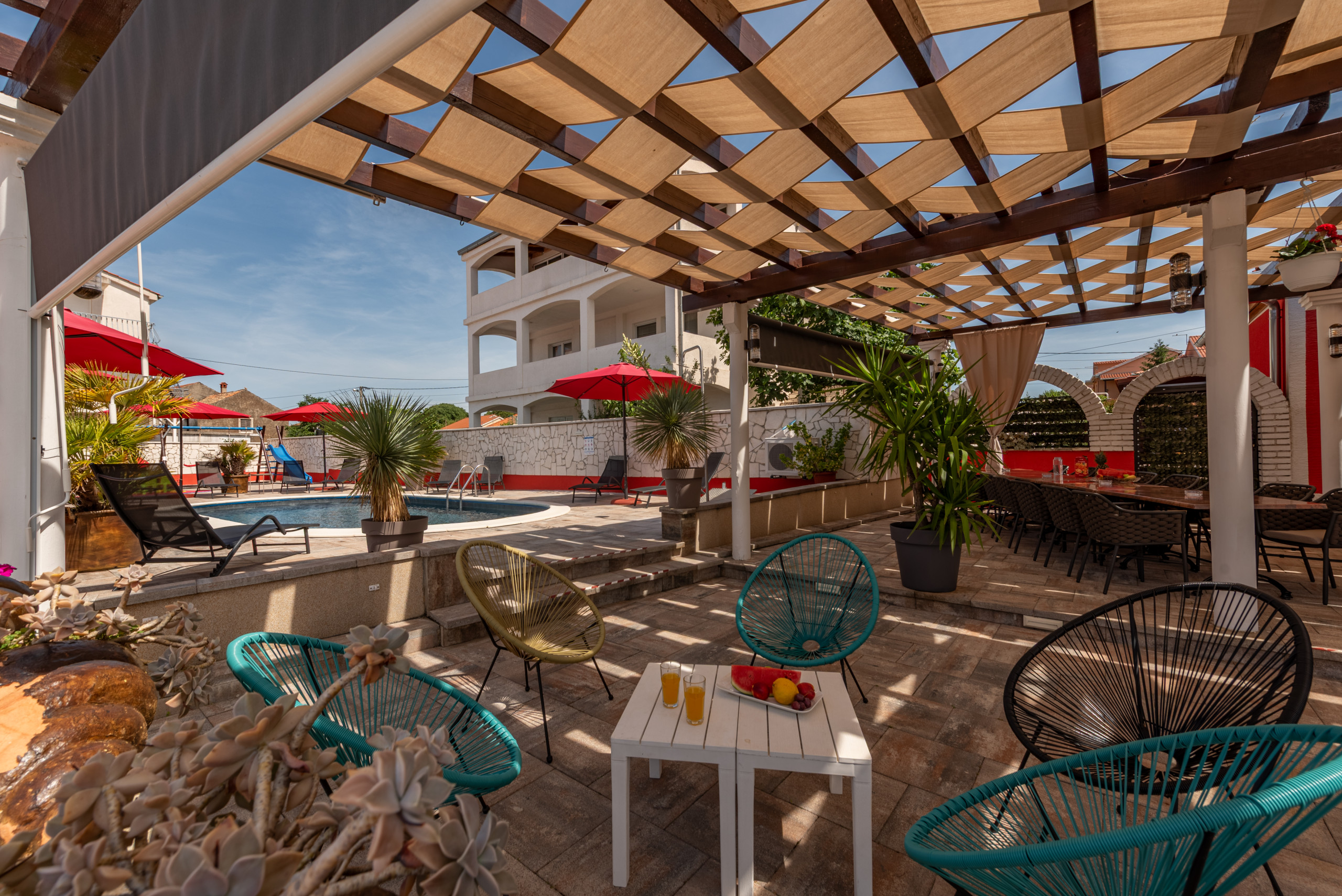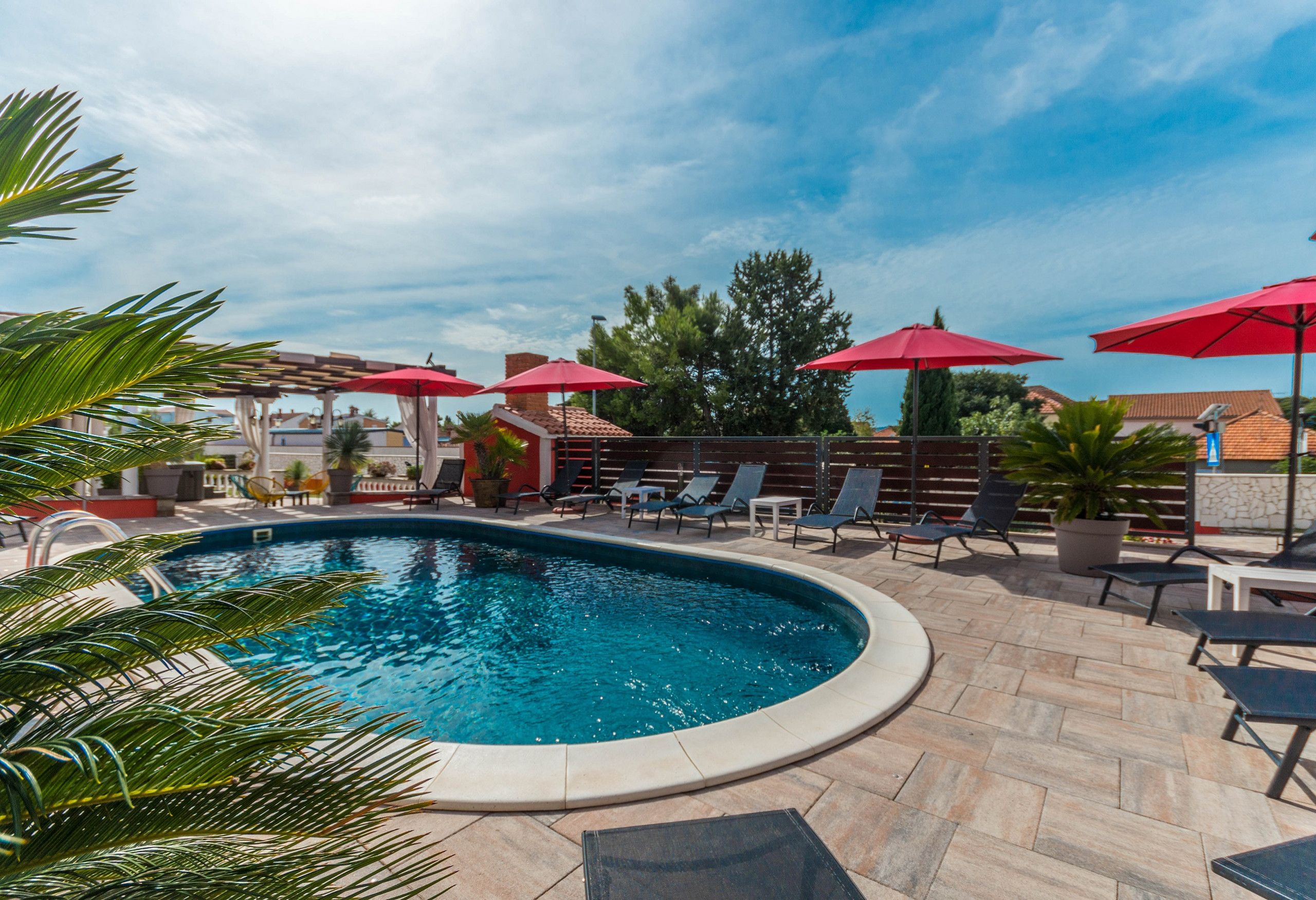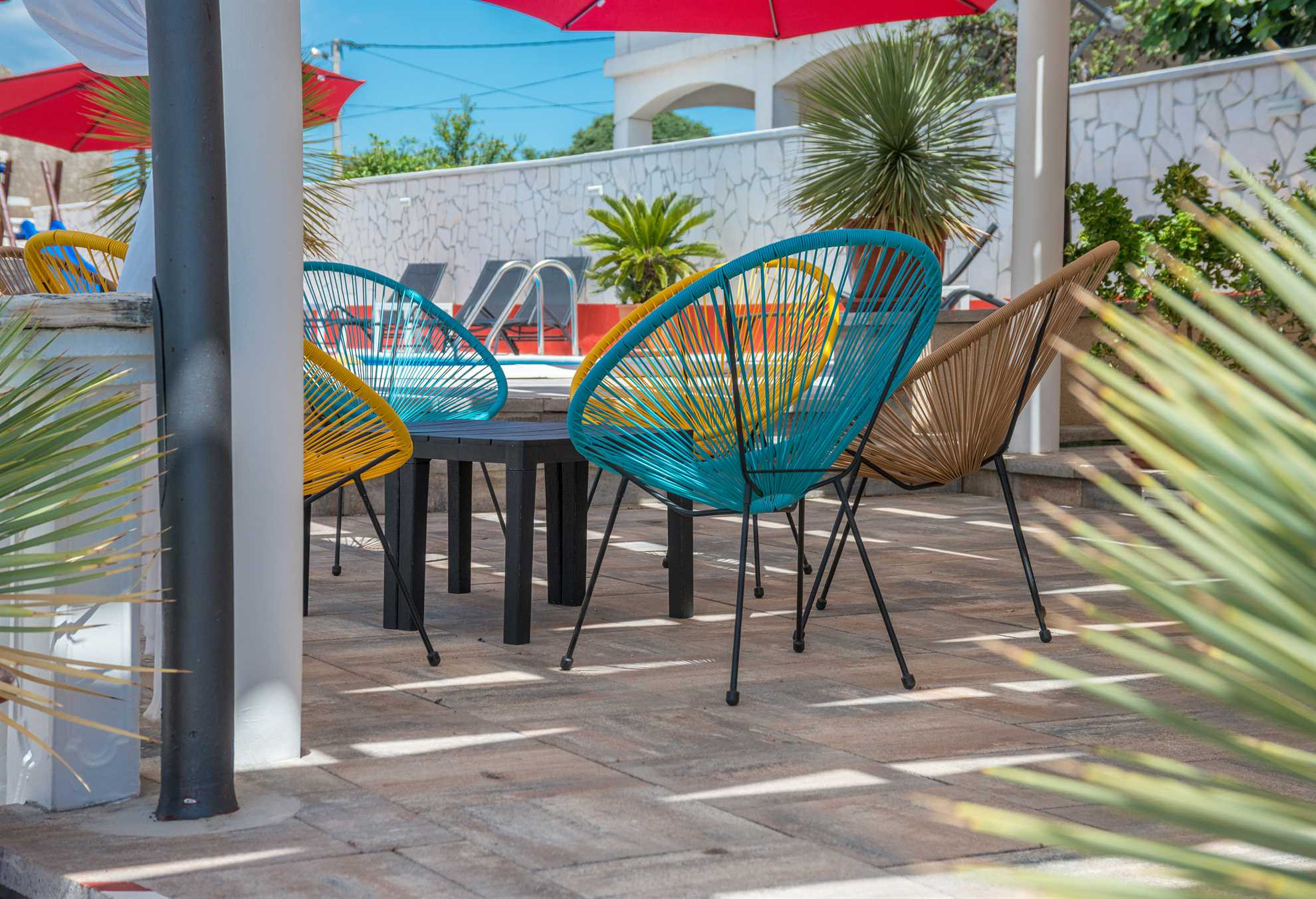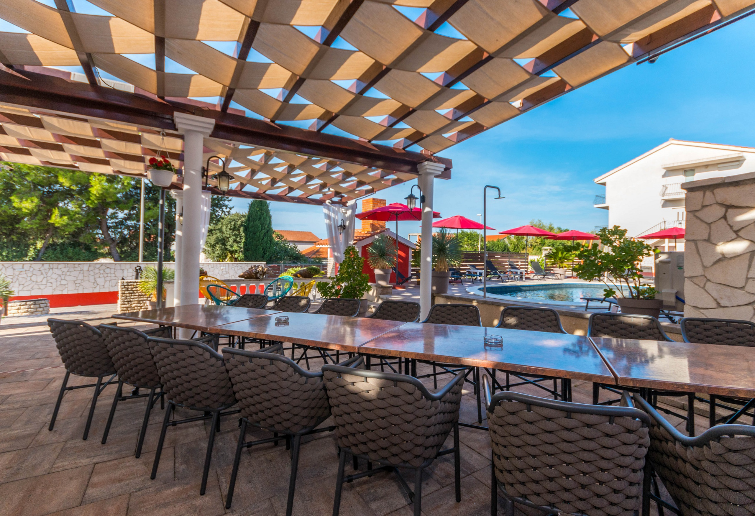 The outdoor area offers plenty of seating and social spaces, perfect for morning coffee, shared dinners or relaxing evenings by the pool. A pebble beach is located just 200 meters from the house.