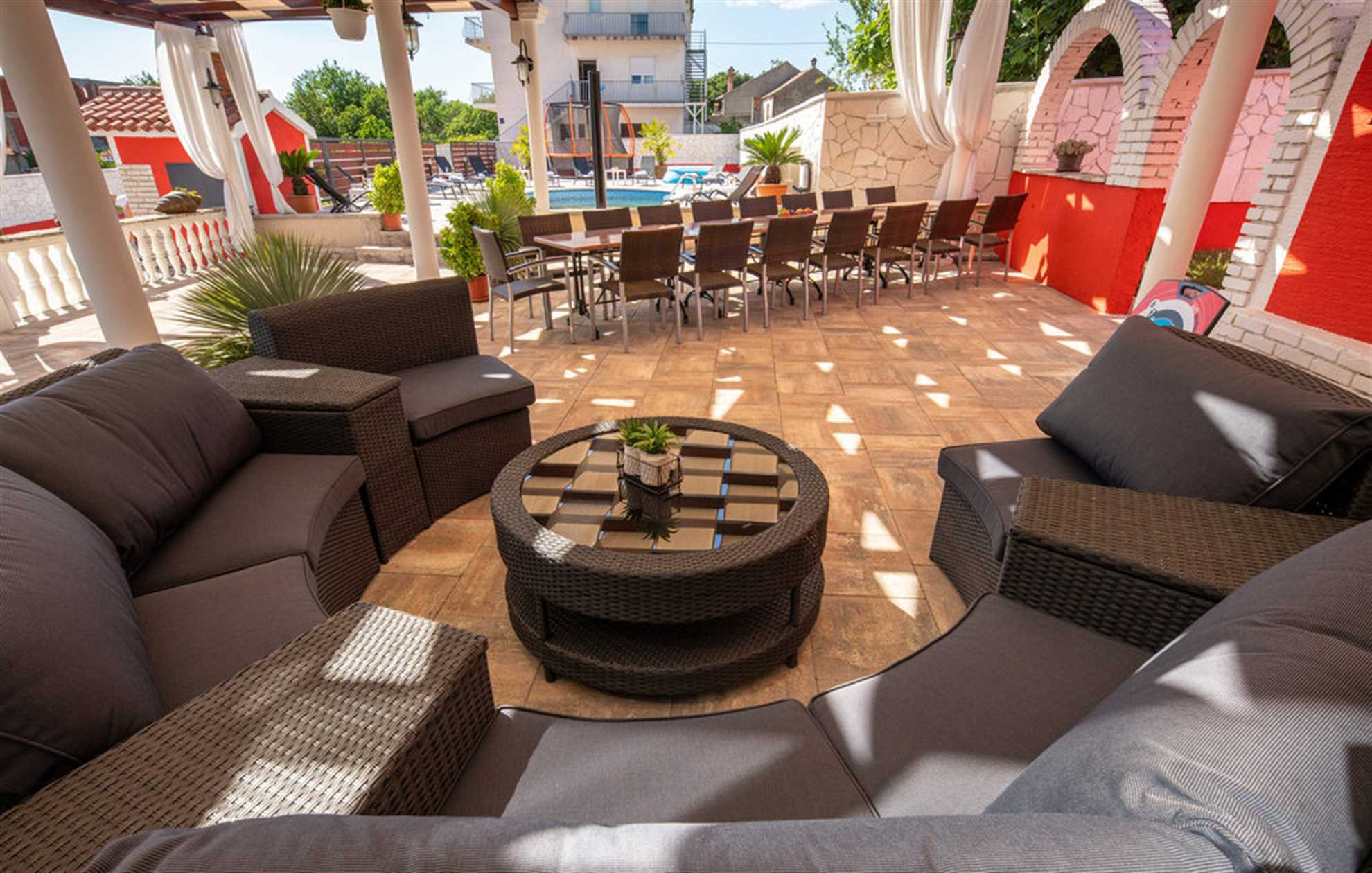 This spacious XXL semi-detached holiday home is located in the charming coastal village of Turanj and is the perfect choice for larger families or groups of friends looking to combine comfort, entertainment and relaxation by the sea.