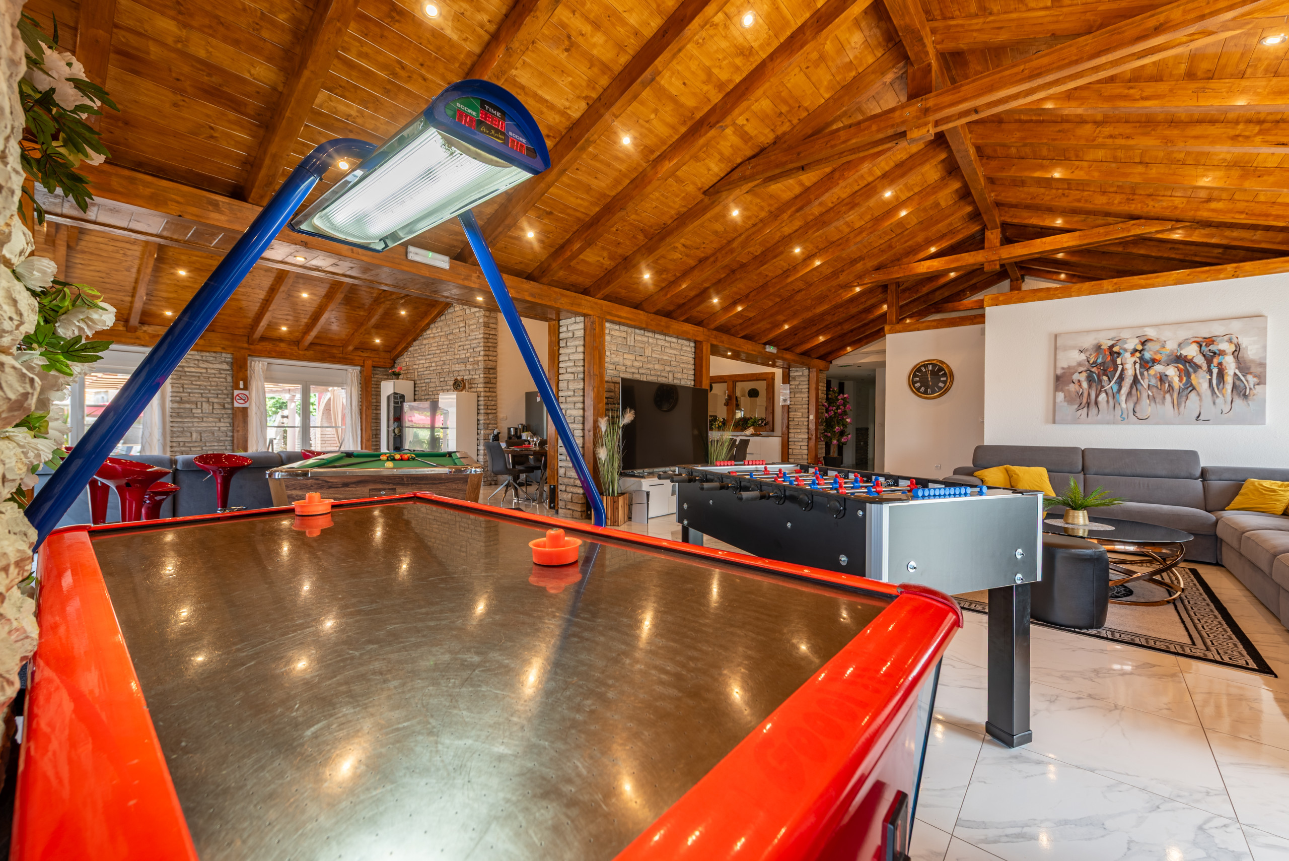 What truly sets this villa apart is its impressive range of entertainment facilities: a billiard table, table football, air hockey and many additional features that guarantee fun for all generations. For ultimate relaxation, guests can enjoy the Finnish sauna, heated swimming pool and whirlpool, all located on a beautiful sun-soaked terrace.