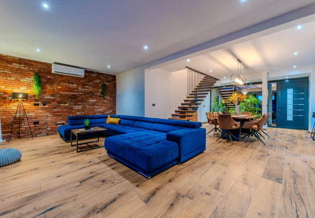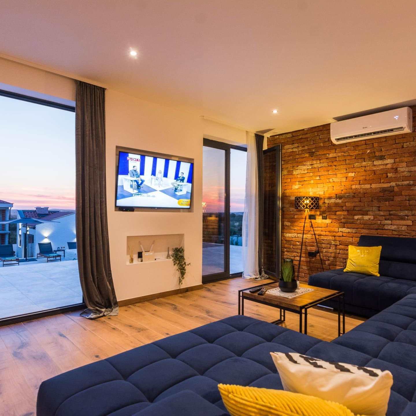 The first floor is dedicated to the sleepinq quarters, making it easy to divide each and every one of the guest`s quiet zones. Each of the 4 bedrooms features an en-suite bathroom, individually controlled A/C and a TV. Two of the bedrooms have queen sized beds, and 2 of them have king sized beds. In one of the bedrooms there is a convertible sofa bed that can comfortably fit 2 more guests, making this house ideal for a maximum of 10 guests.