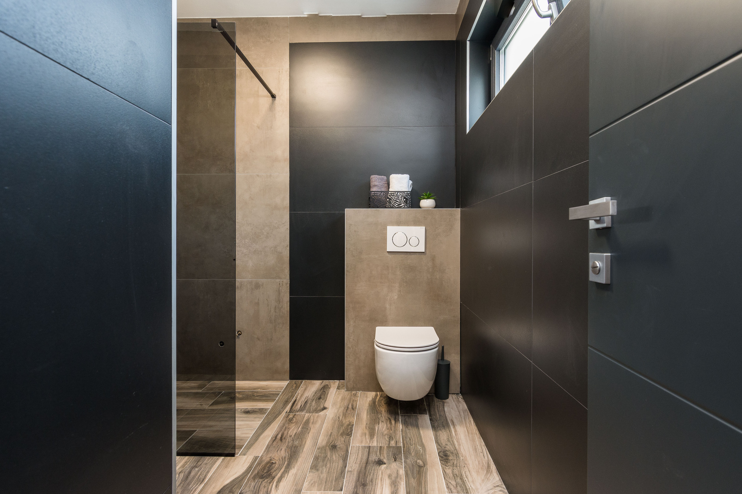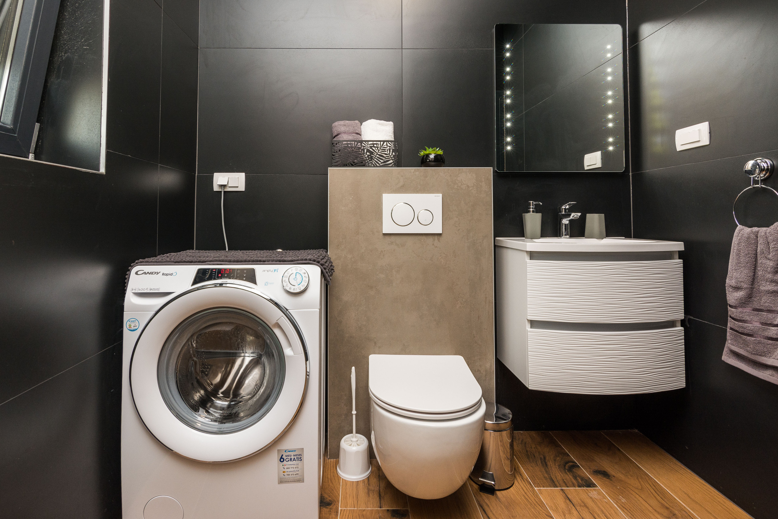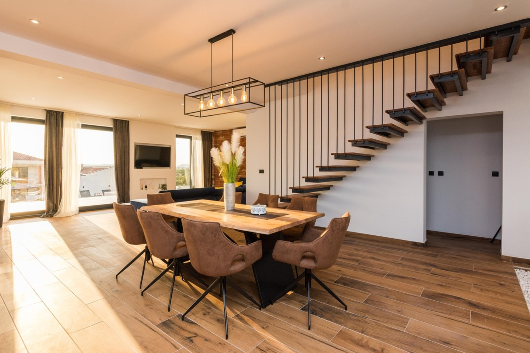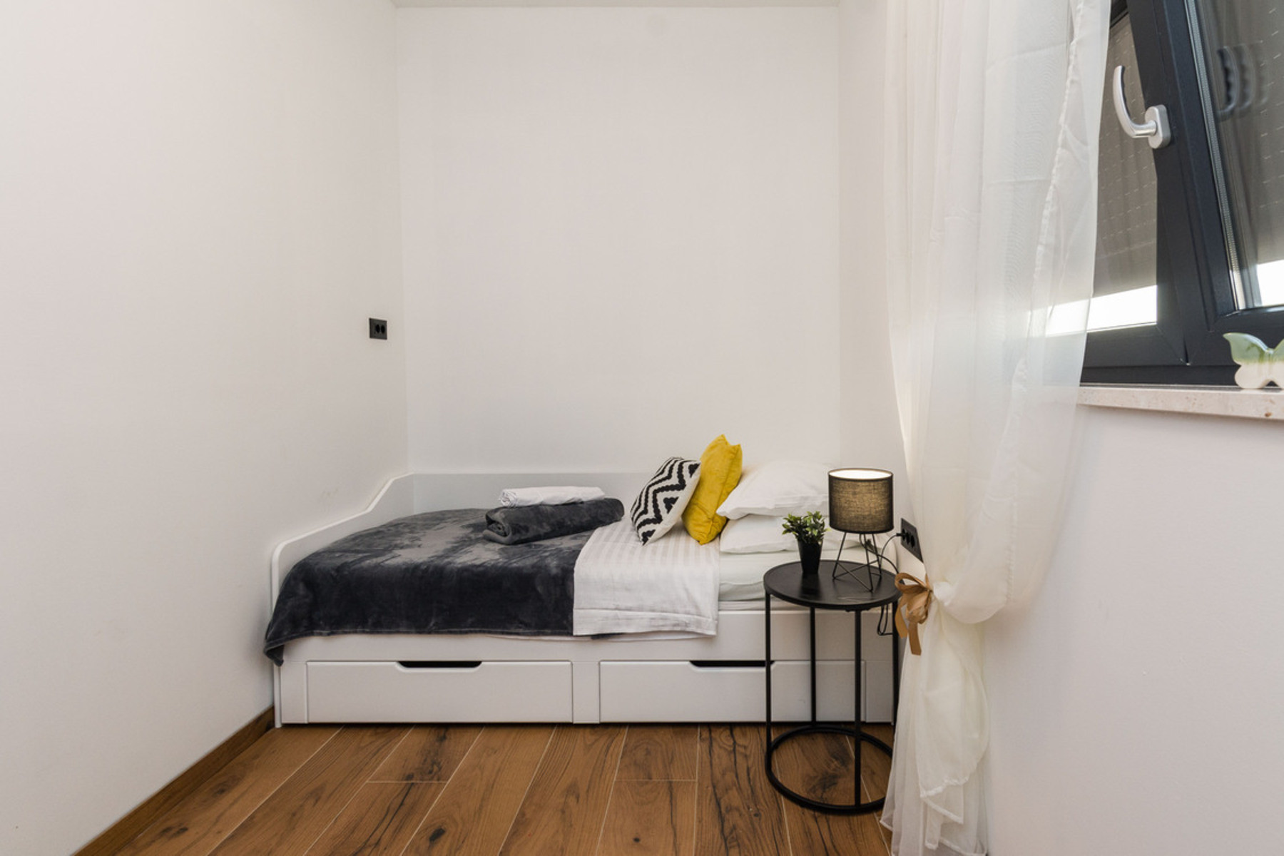 On the ground floor of Villa Lara, there is a modern, fully equipped kitchen, a dining area, a spacious living room, and one bedroom with a private bathroom. The first floor features three more elegant bedrooms, each with an en-suite bathroom with a shower. An additional sleeping option are two portable beds, and for the youngest guests, a baby cot is available. One of the bedrooms is furnished with two single beds, while the other three have comfortable double beds.