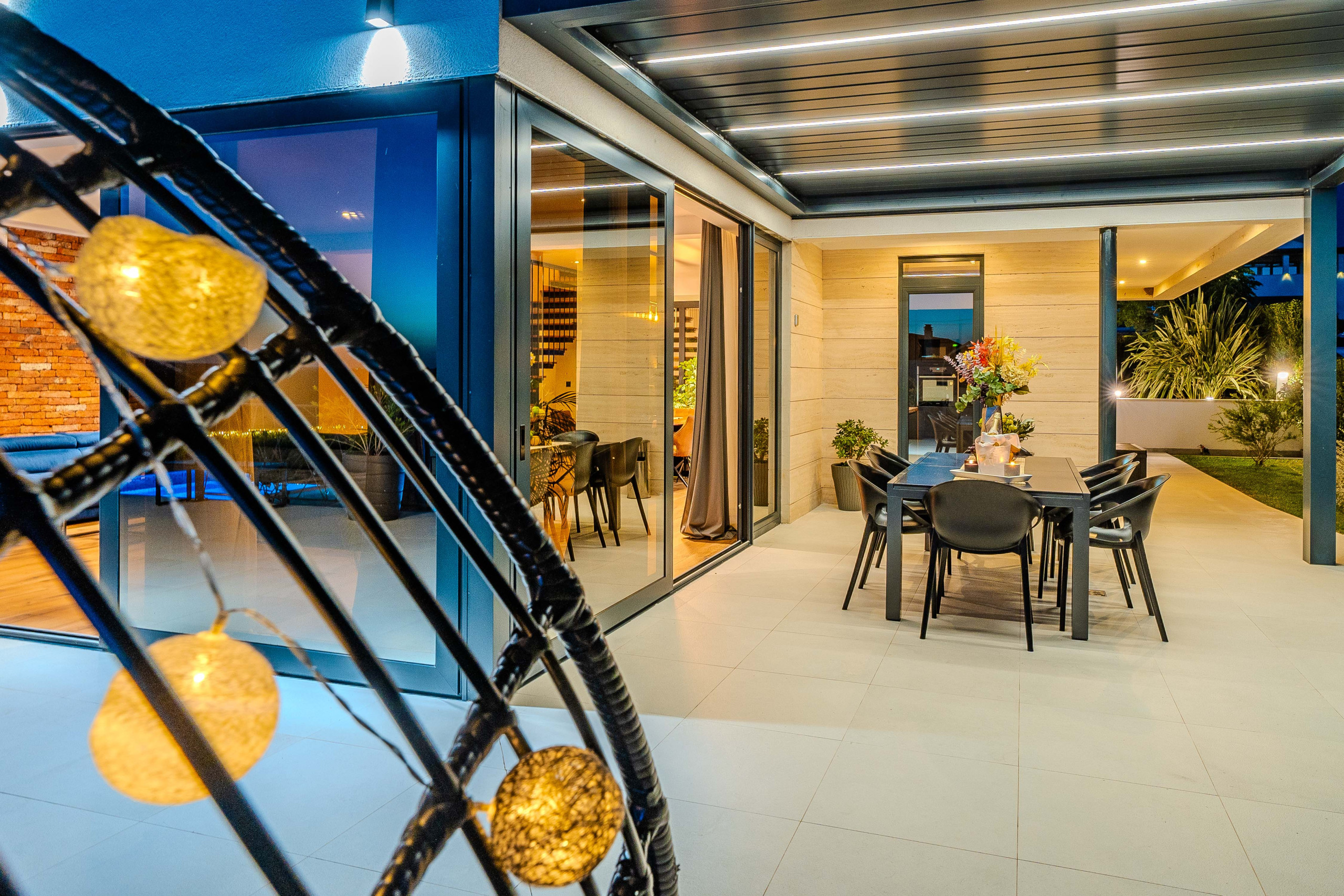 The outdoor area of Villa Lara is a true oasis of relaxation. A spacious terrace with a large dining table allows guests to enjoy a breathtaking view of the untouched nature. The 60 m² swimming pool wit salt water, equipped with a hydromassage function and a separate children's section, offers the perfect place to cool off. Around the pool, there are 12 sun loungers with umbrellas, ideal for sunbathing and relaxation. The courtyard also features an outdoor dining table next to a summer kitchen with a barbecue.