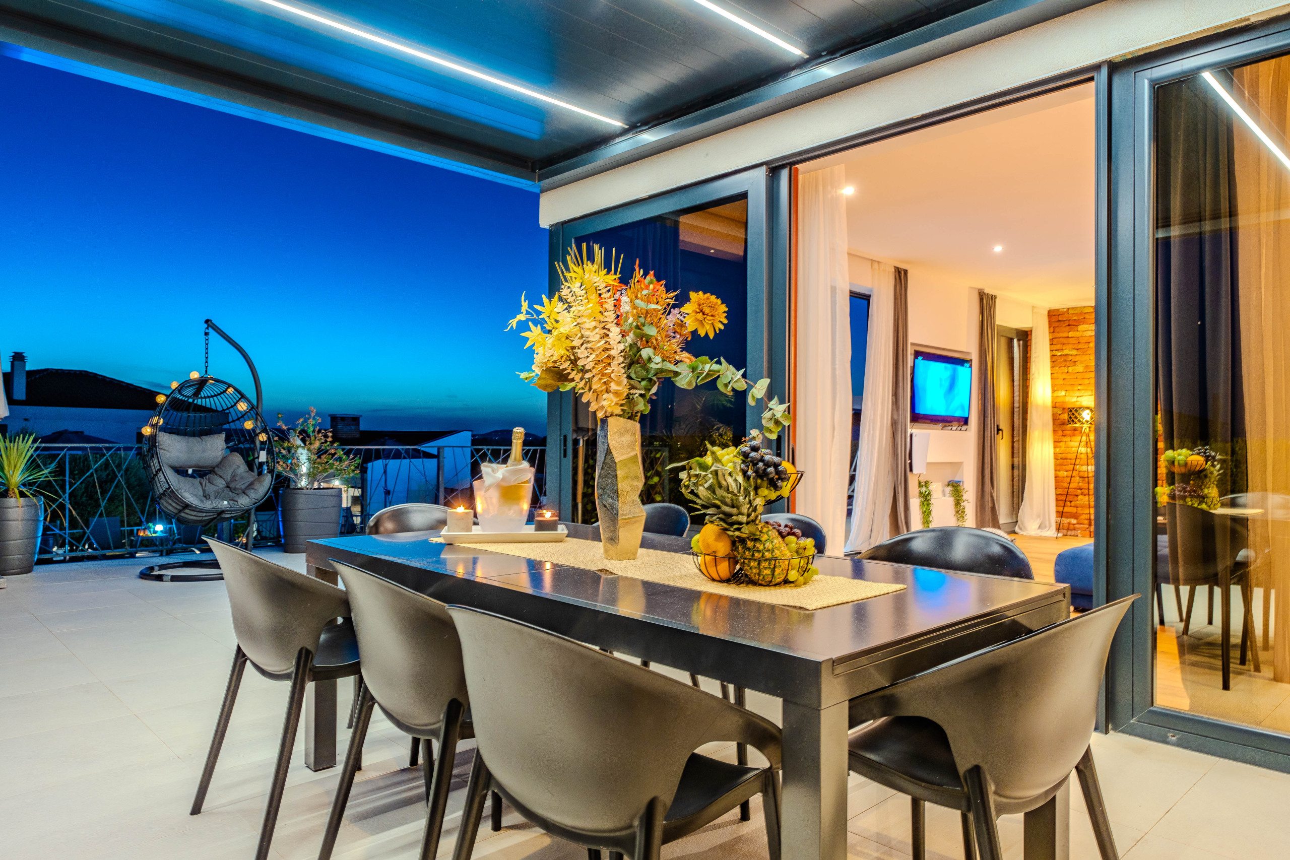 The outdoors are carefully designed to incorporate many activities. The extra large swimming pool is breathtaking, and the illusion of a hanging pool terrace further enhances the experience and the visage of the Villa. There is a fully covered terrace right next to the pool, featuring barbecue facilities, a large wooden dining table and a TV, where you can spend many evenings in loving company of family and friends, while the kids are amused by the playground next to it.