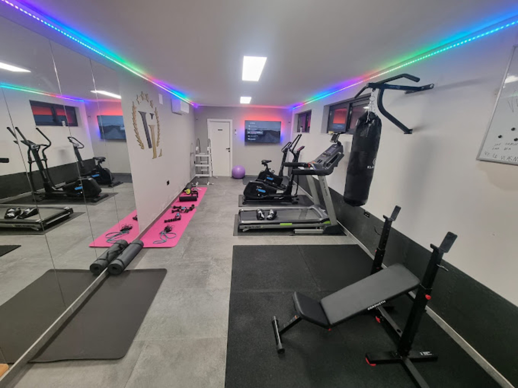 On the ground floor there is a spacious, open-concept living room, dining room and fully equipped kitchen, as well as a fitness room. The fitness room contains a treadmill, a stationary bycicle and weights. A guest toilet is also on the ground floor.