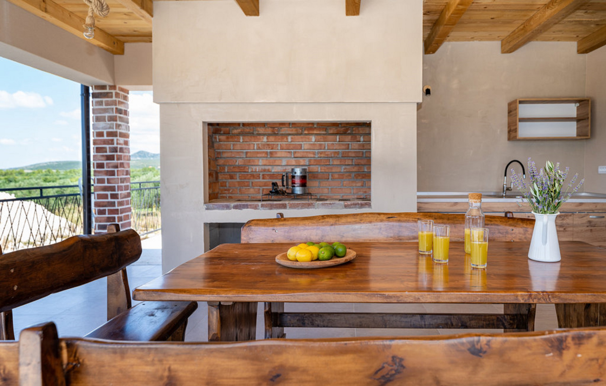 The outdoor area of Villa Lara is a true oasis of relaxation. A spacious terrace with a large dining table allows guests to enjoy a breathtaking view of the untouched nature. The 60 m² swimming pool wit salt water, equipped with a hydromassage function and a separate children's section, offers the perfect place to cool off. Around the pool, there are 12 sun loungers with umbrellas, ideal for sunbathing and relaxation. The courtyard also features an outdoor dining table next to a summer kitchen with a barbecue.