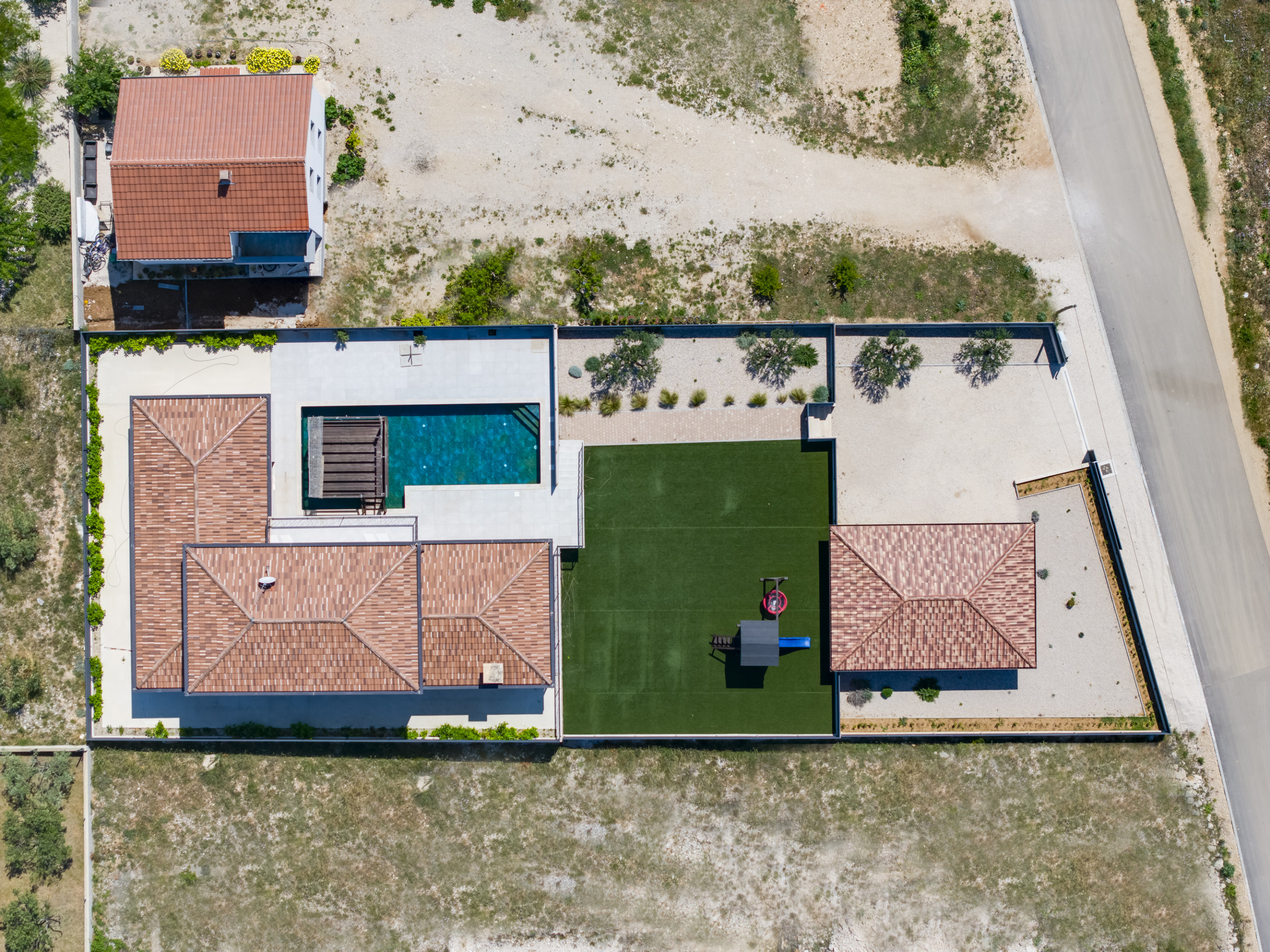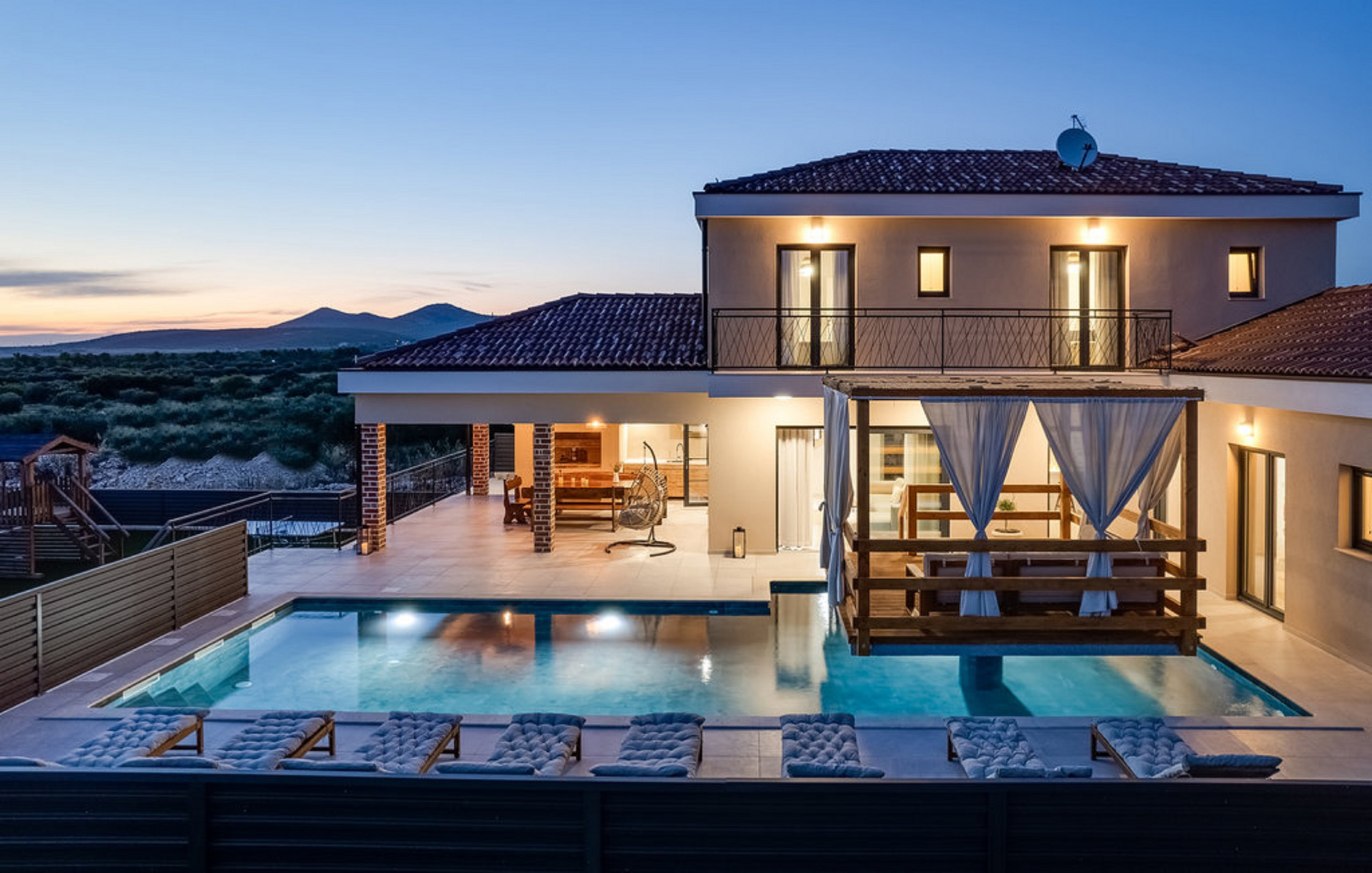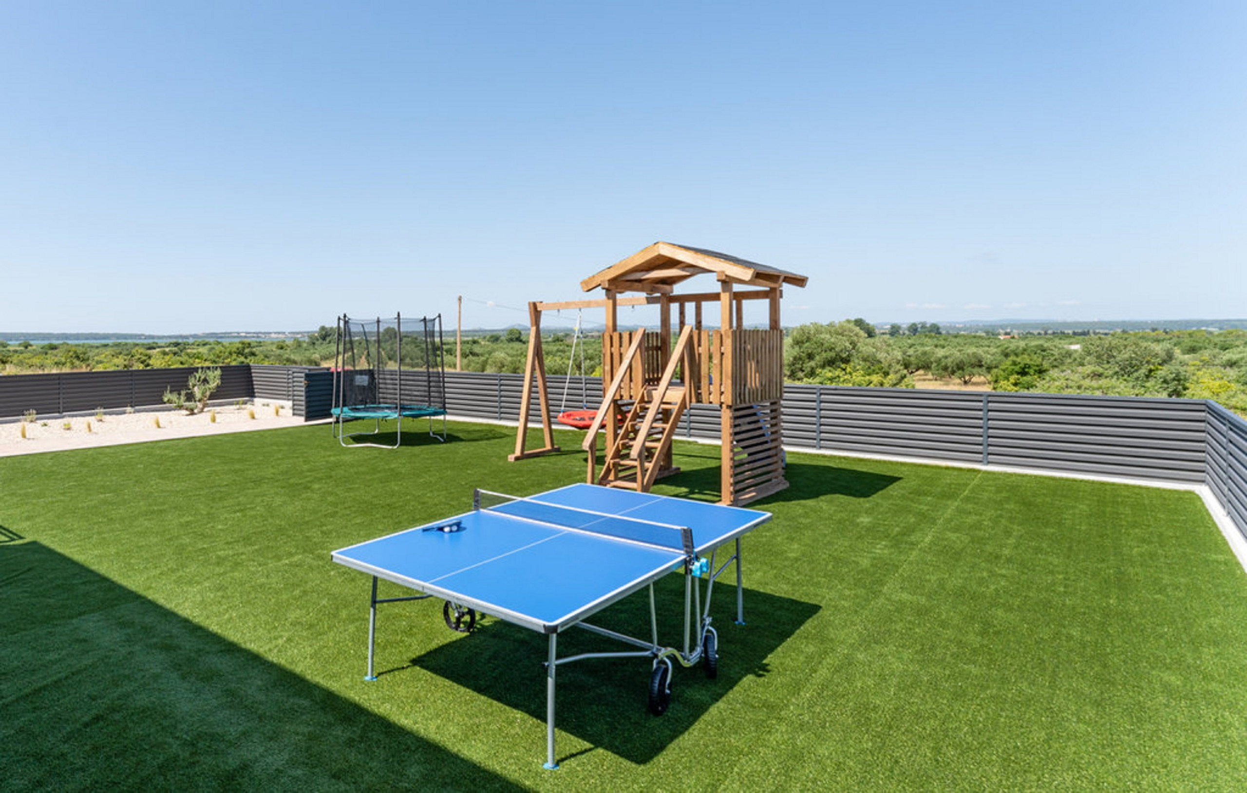 The outdoors are carefully designed to incorporate many activities. The extra large swimming pool is breathtaking, and the illusion of a hanging pool terrace further enhances the experience and the visage of the Villa. There is a fully covered terrace right next to the pool, featuring barbecue facilities, a large wooden dining table and a TV, where you can spend many evenings in loving company of family and friends, while the kids are amused by the playground next to it.